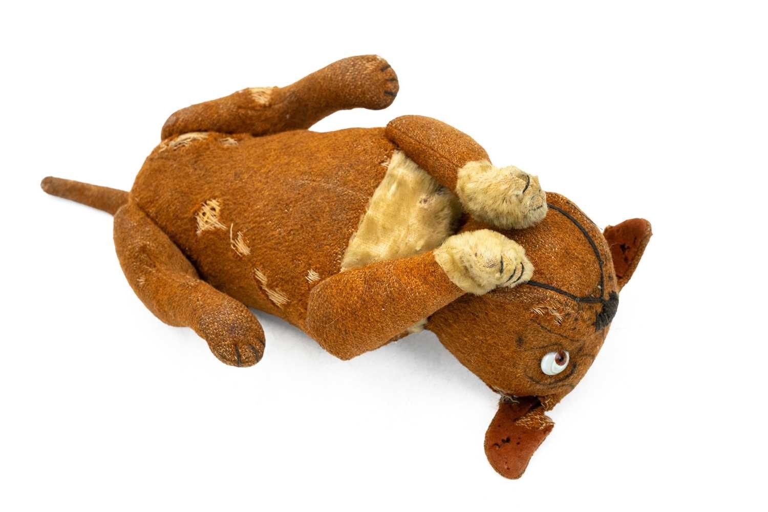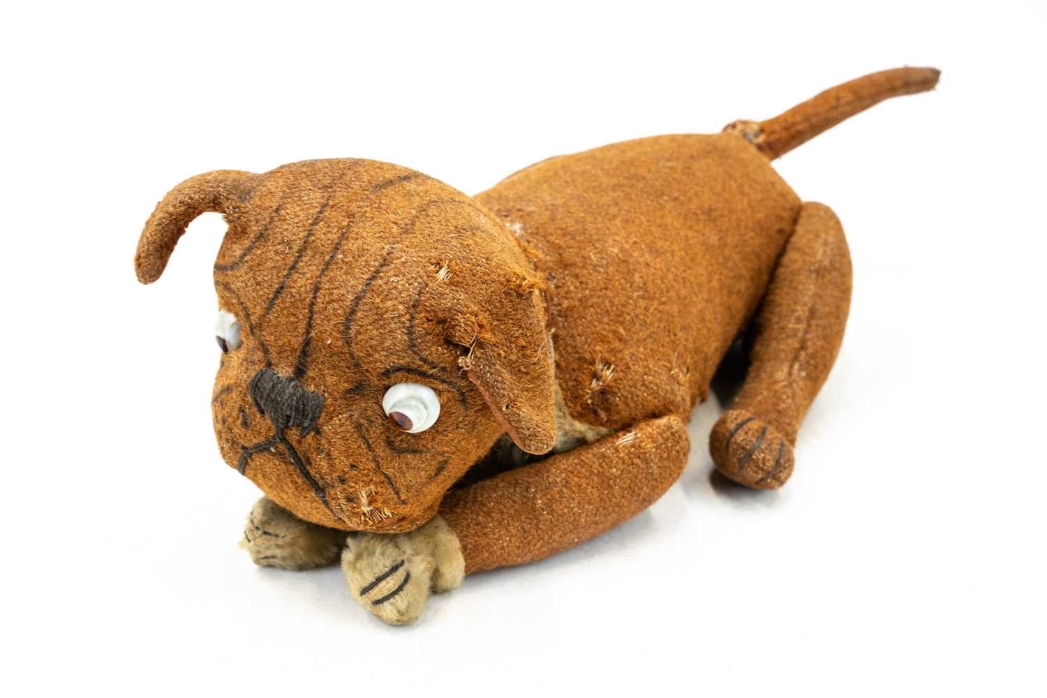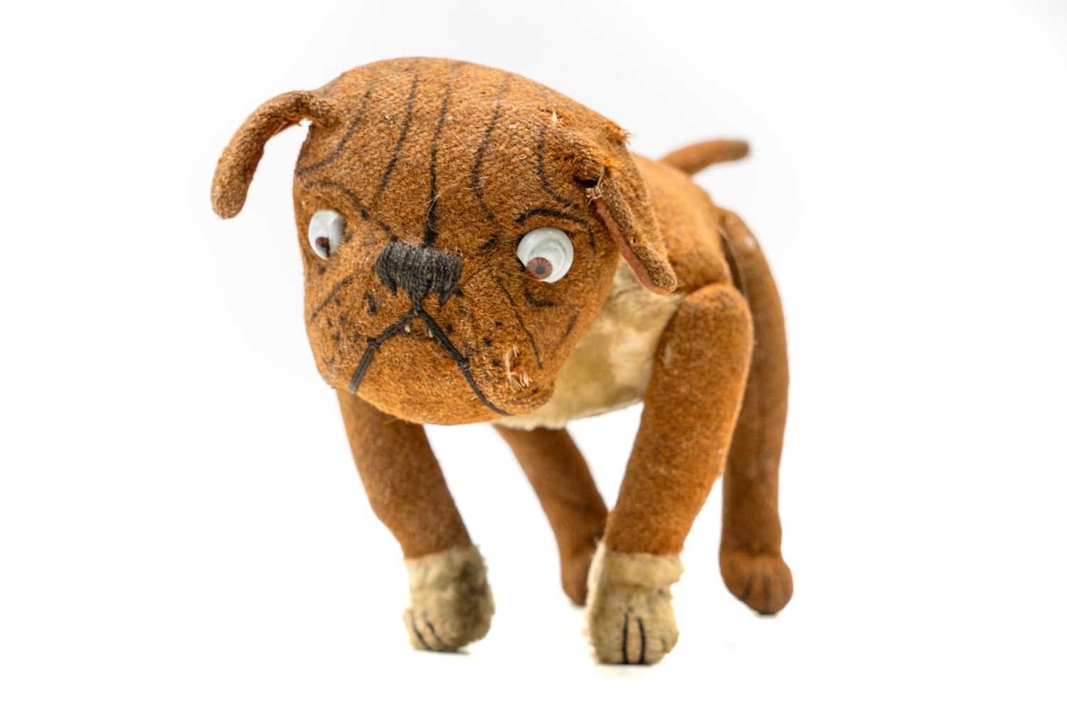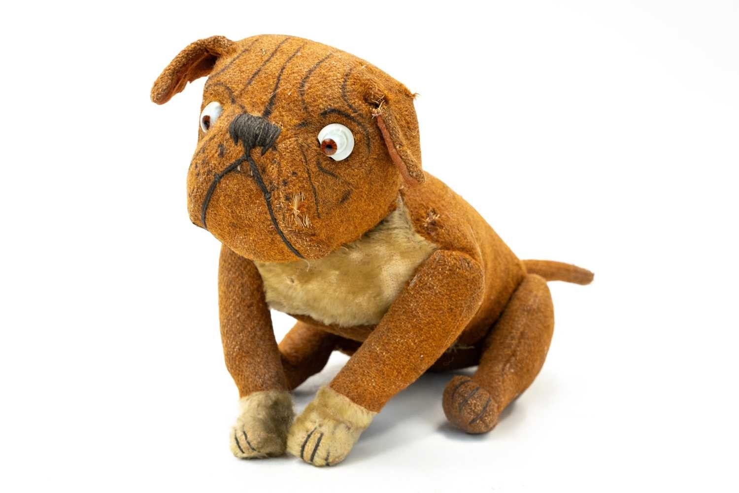 Attributed to Steiff - a 'Tige' bulldog soft toy. Early 20th century, featuring a swivel head, glass eyes, mohair tummy and paws, stitched nose and jointed legs, no label is present, length 42cm.