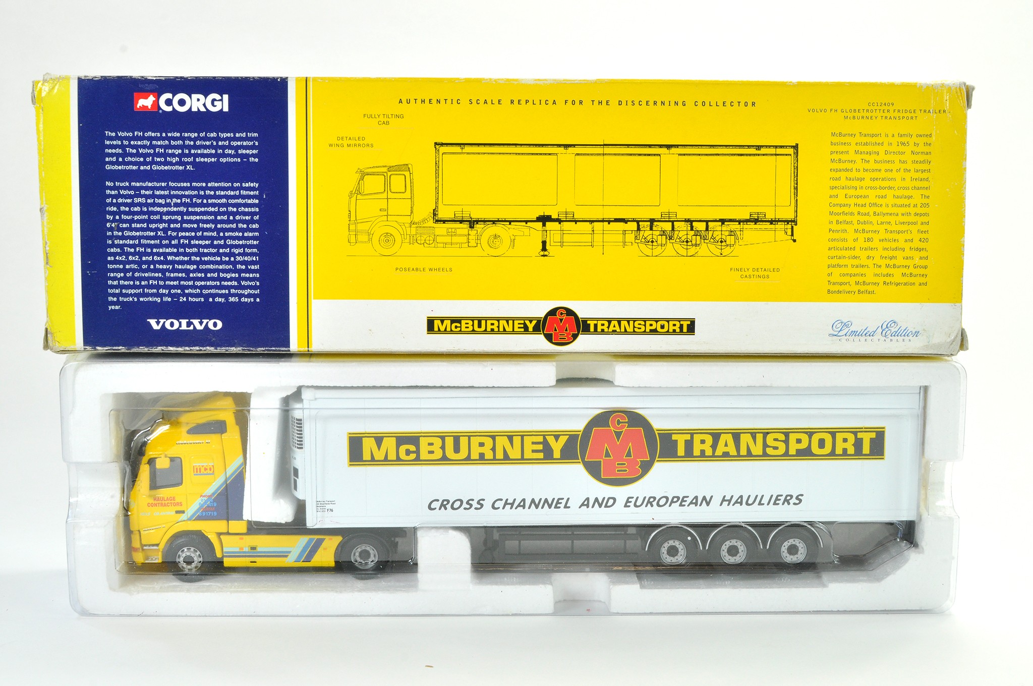 Corgi Diecast Model Truck issue comprising No. CC12409 Volvo FH Fridge Trailer in the livery of McBurney. Appears good, likely displayed at some stage so possibly some light cosmetic wear in places.