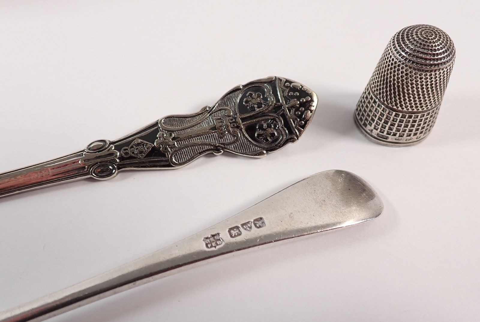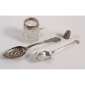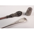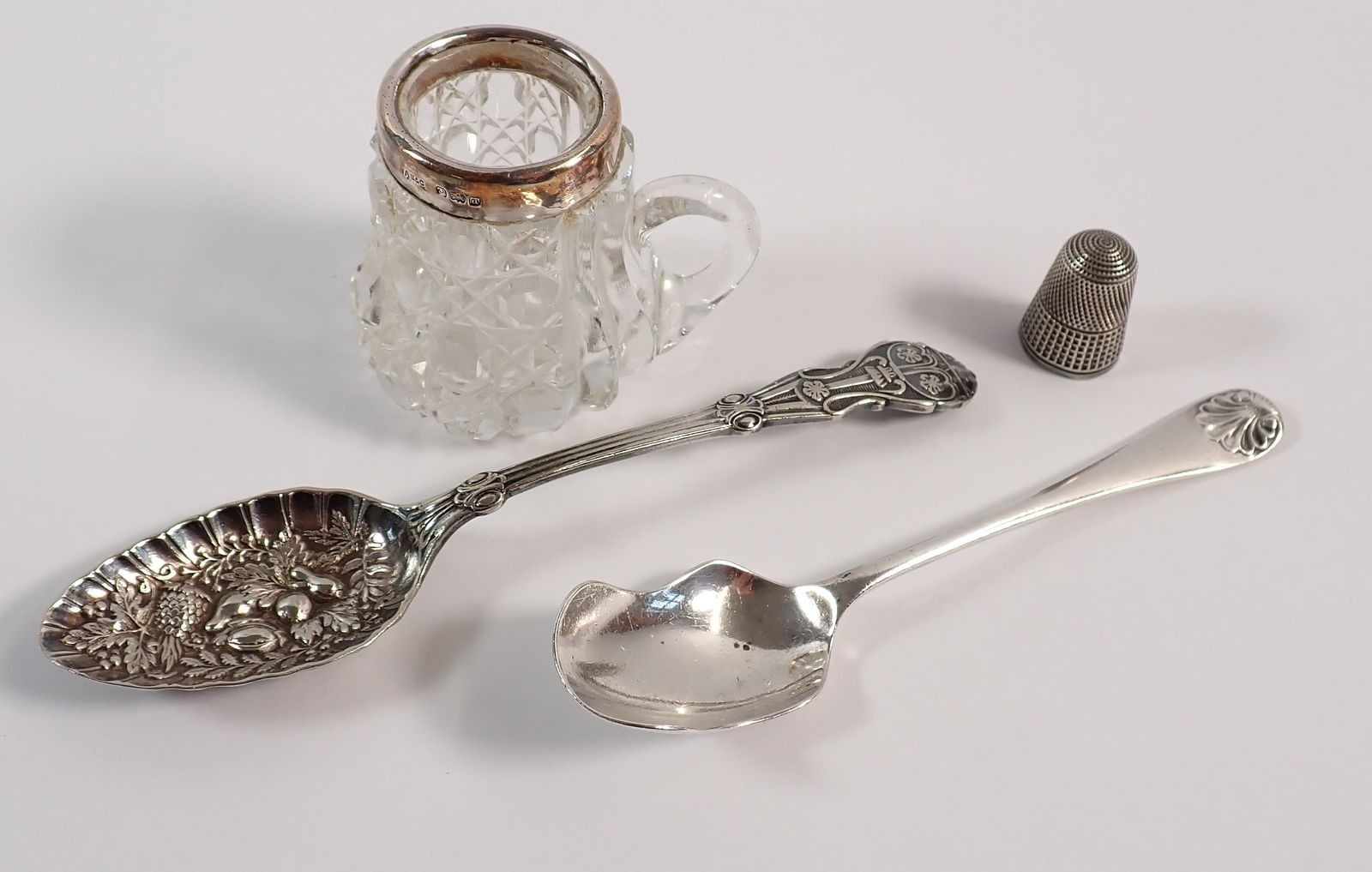 A silver thimble, a cut glass and silver vesta holder, a silver caddy spoon and silver plated jam spoon, 15cm long, weighable silver 29g