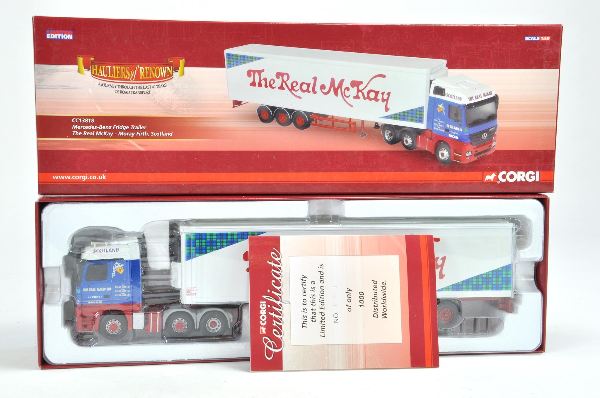 Corgi Diecast Model Truck issue comprising No. CC13818 Mercedes Benz Fridge Trailer in the livery of Real McKay. Appears to be complete, good in box.