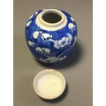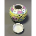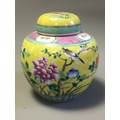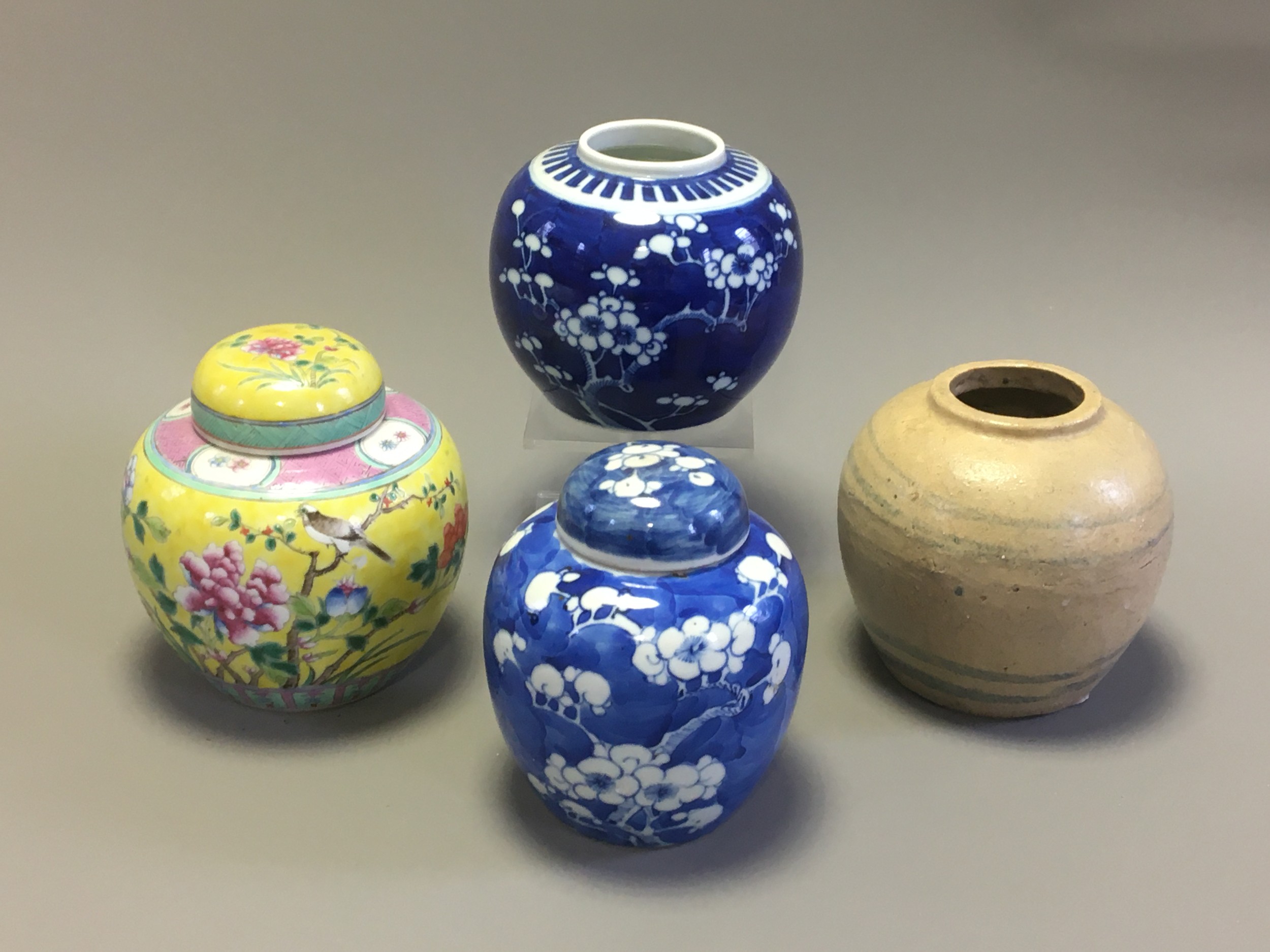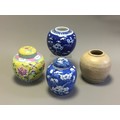 Collection of 19th Century and Later 4 x Chinese Ginger Jars. 2 x Blue and White Prunus Pattern, an Earthen Ware Banded Example, and a Famille Jaune Decorated lidded example.