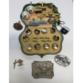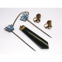 Cased set of abalone and gilt metal cufflinks with studs, three pairs of cufflinks, four various dress rings and four various brooches