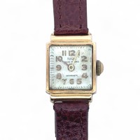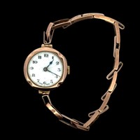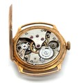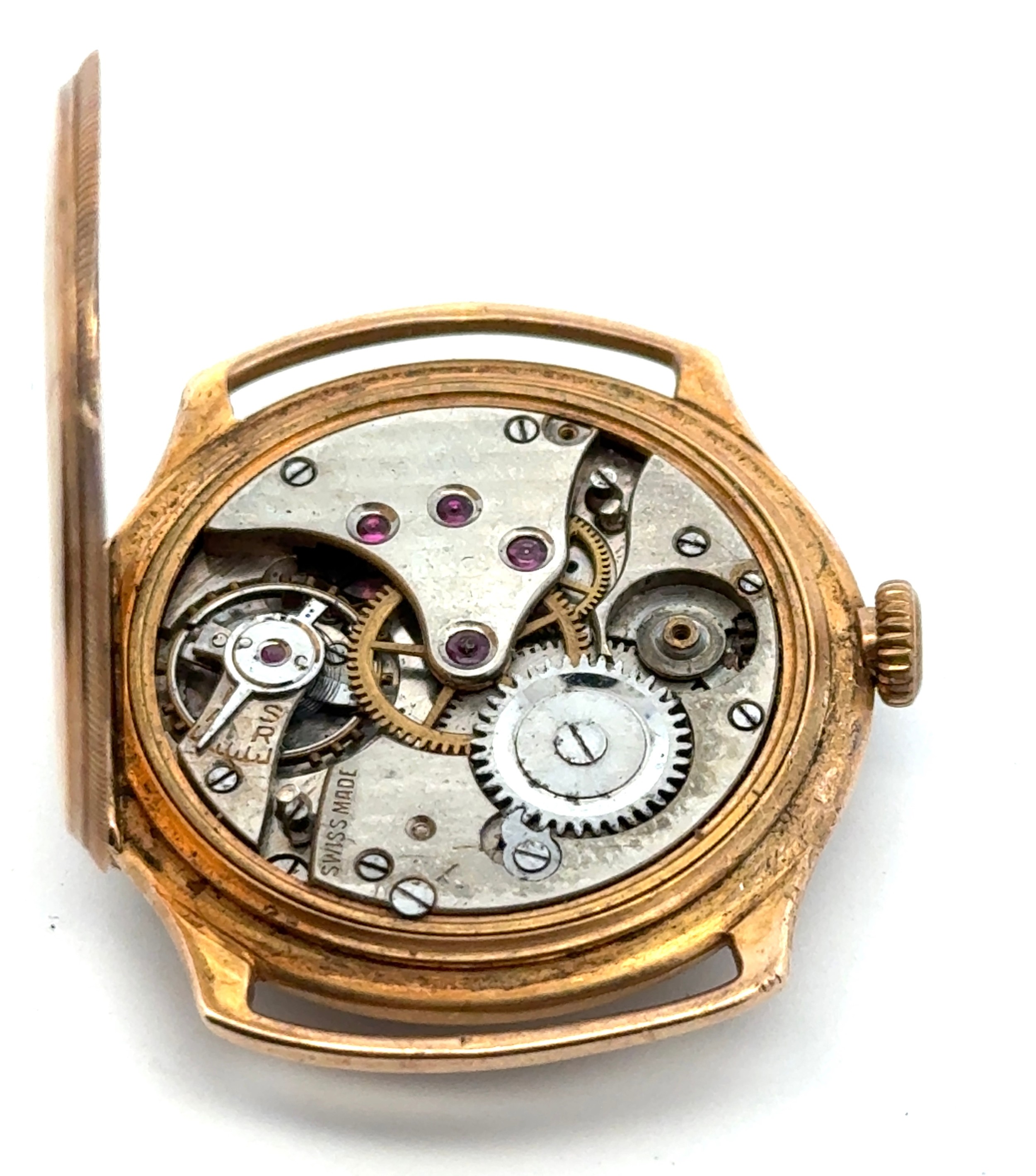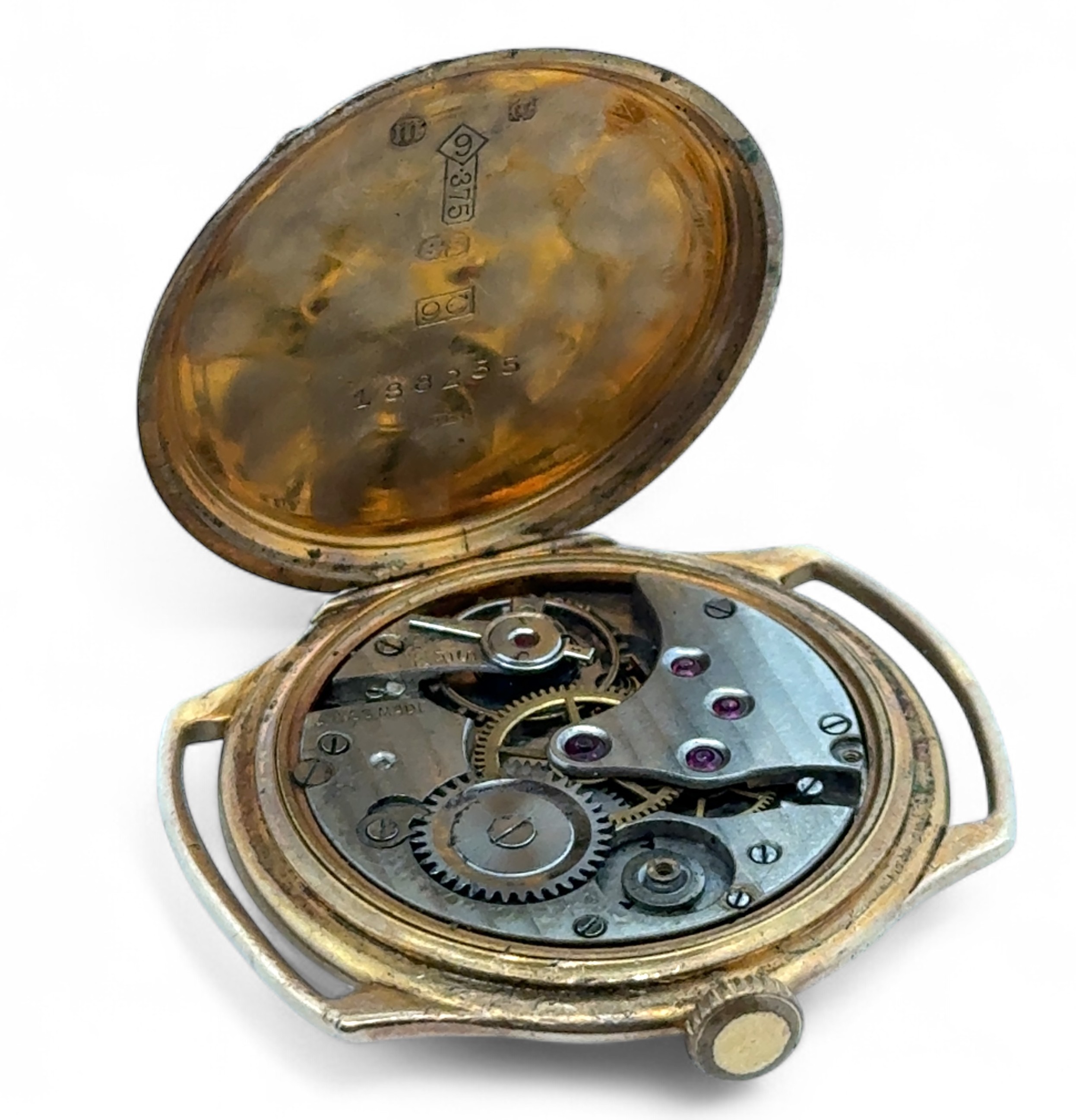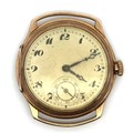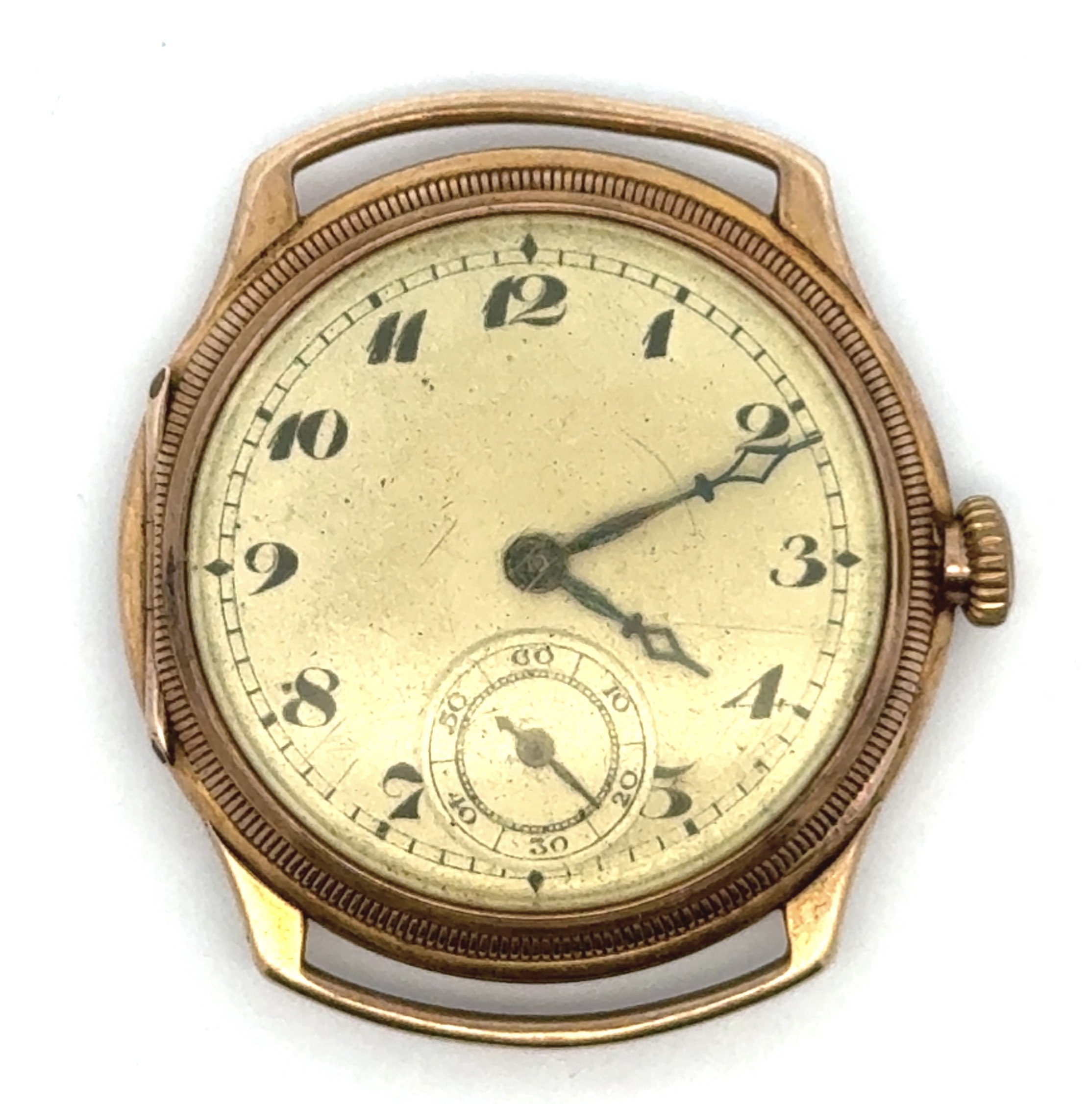 A 9ct gold gents watch head with gilt face and Arabic numerals. Watch not winding or ticking. 16.37g