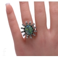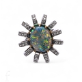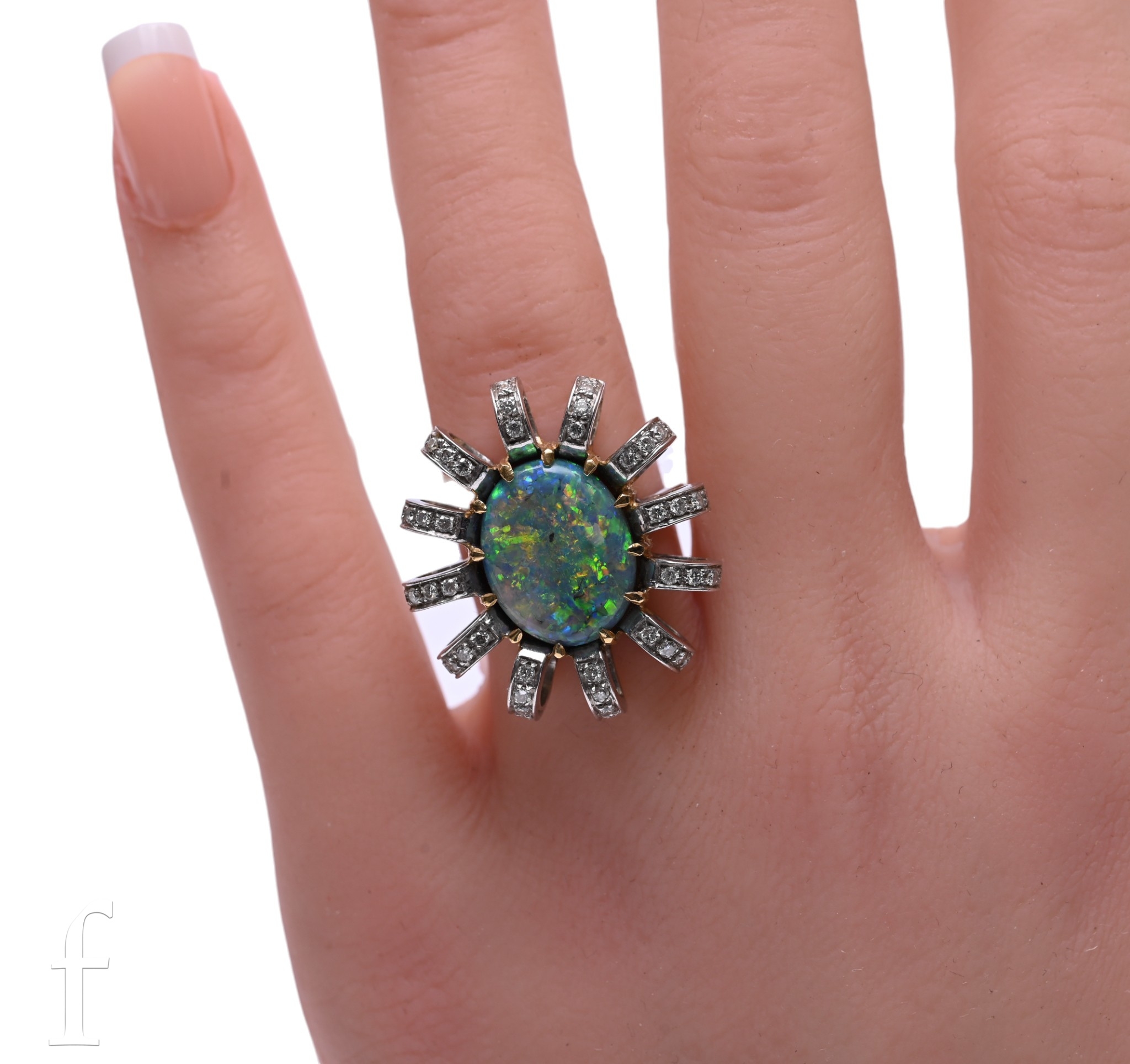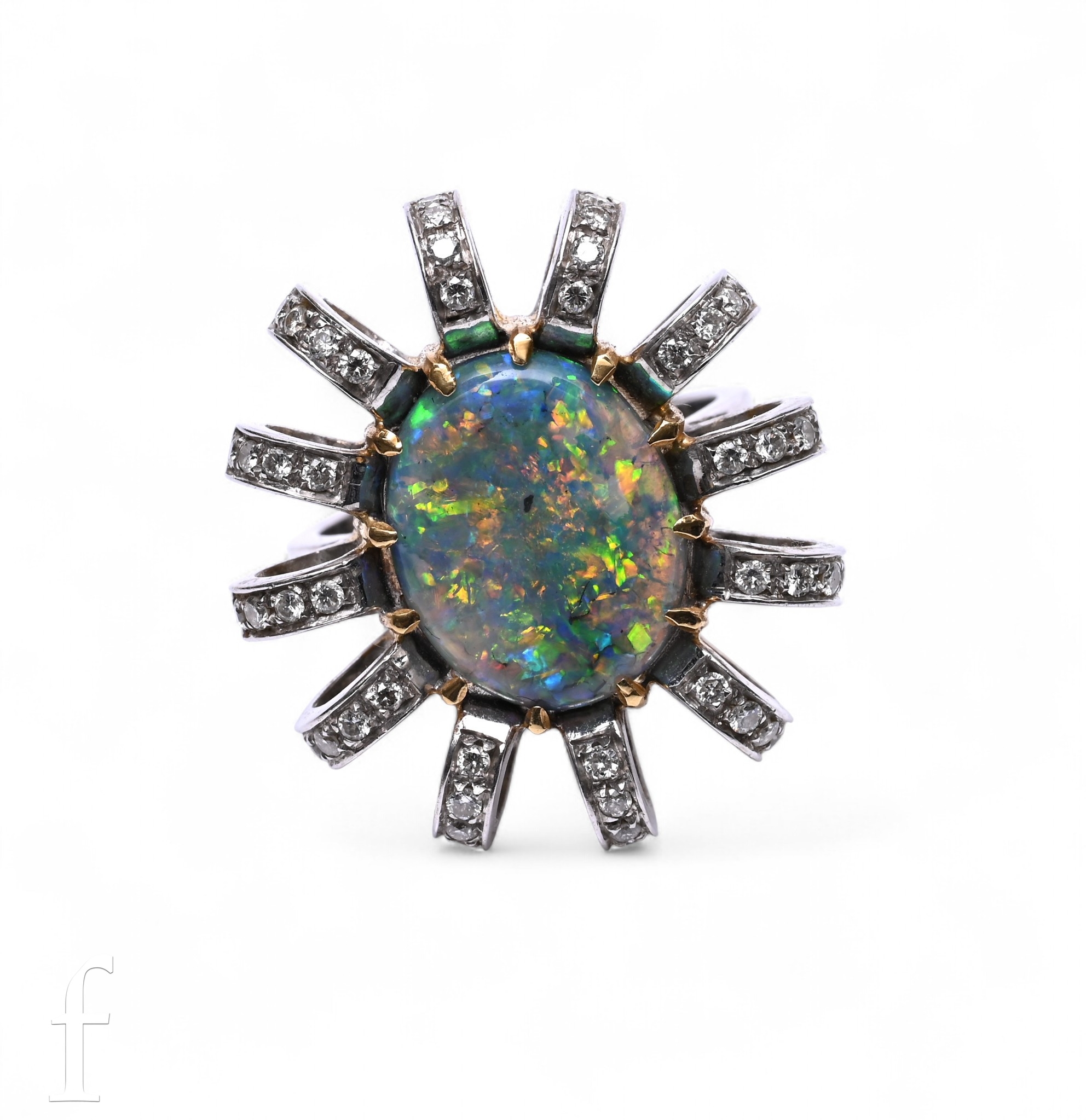 An opal and diamond ring, the oval black opal, claw set within a fancy mount, of twelve arched mounts set with four brilliant-cut diamonds to each, on a plain band, total weight 12.5g, ring size M1/2