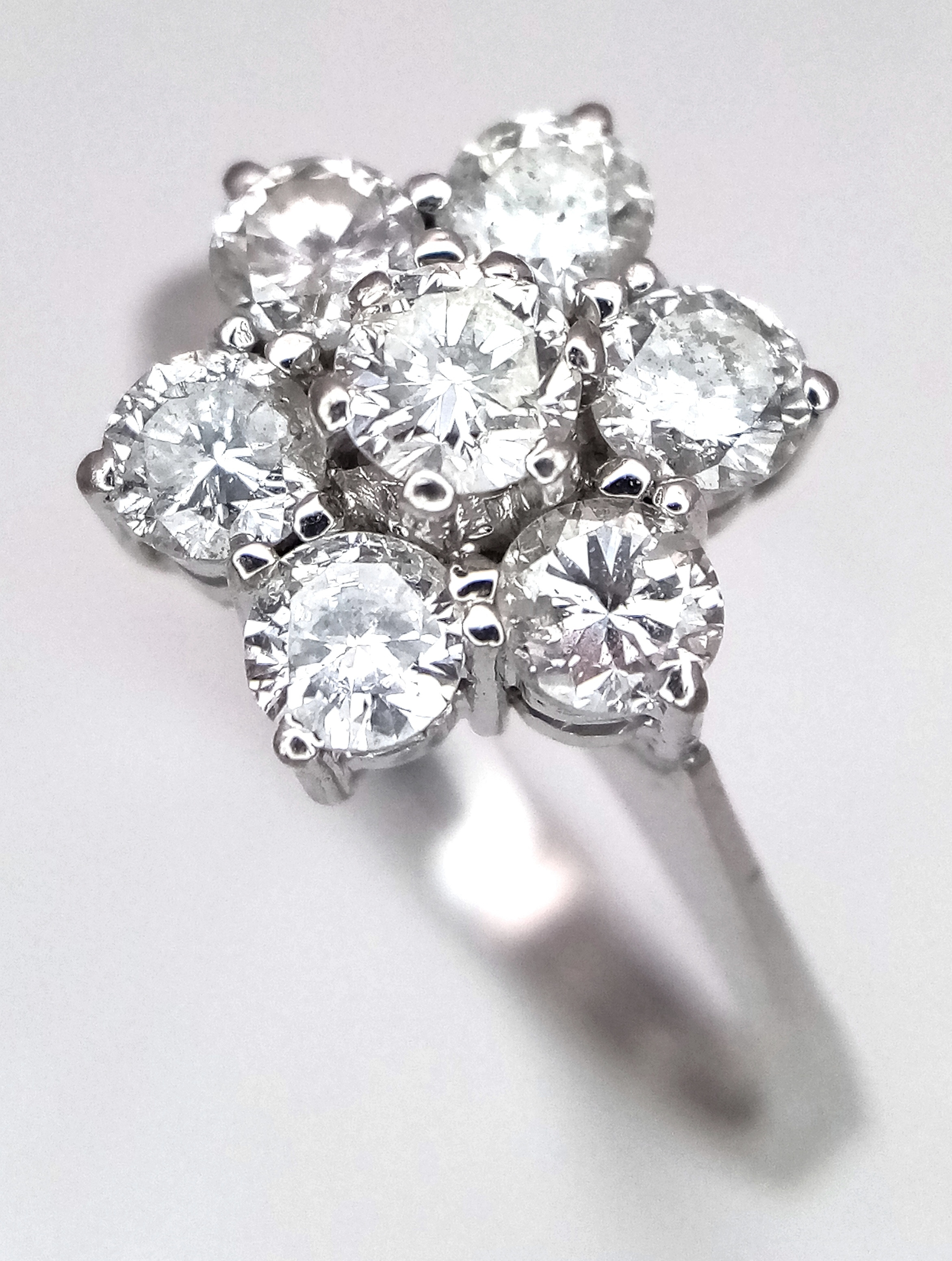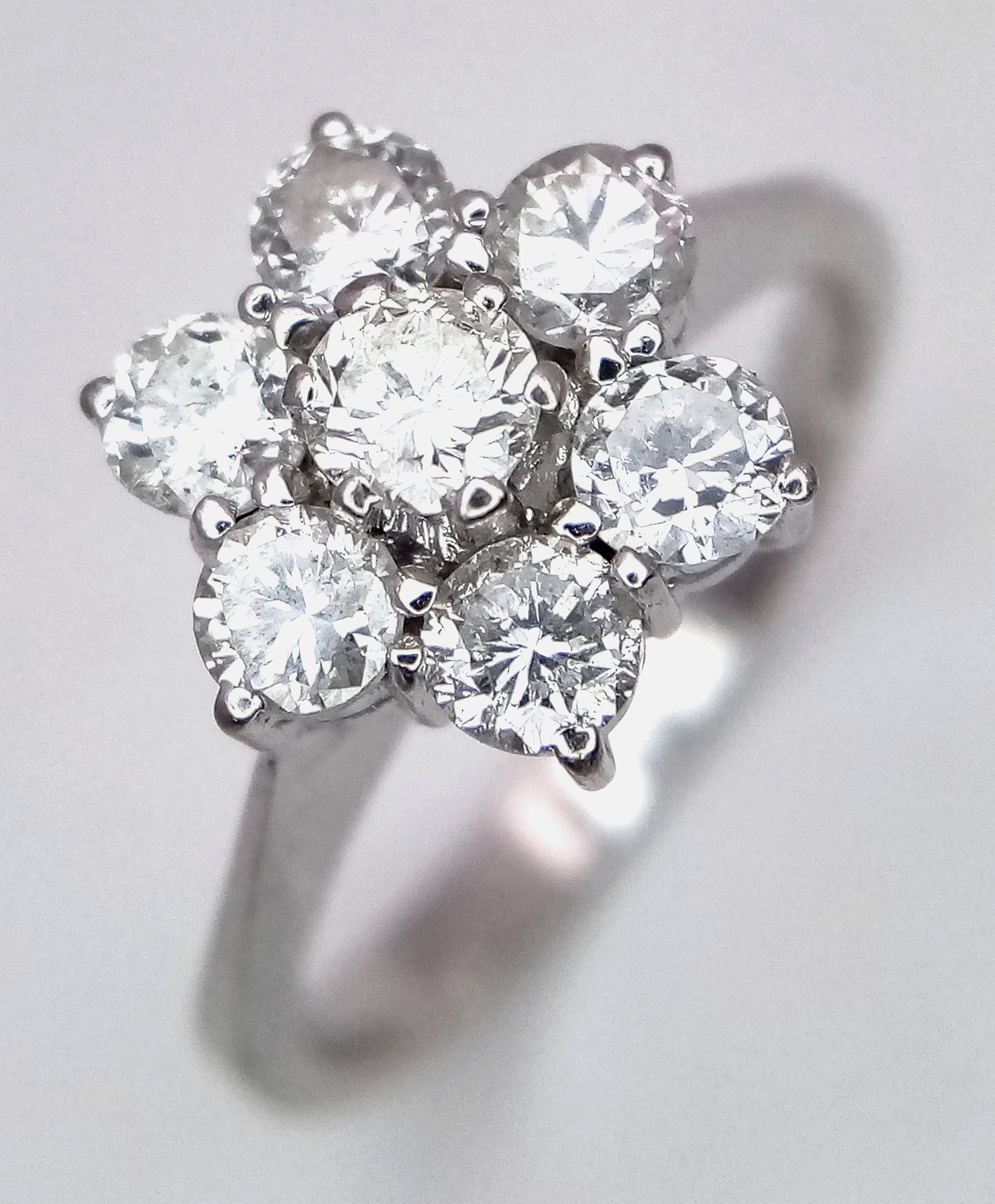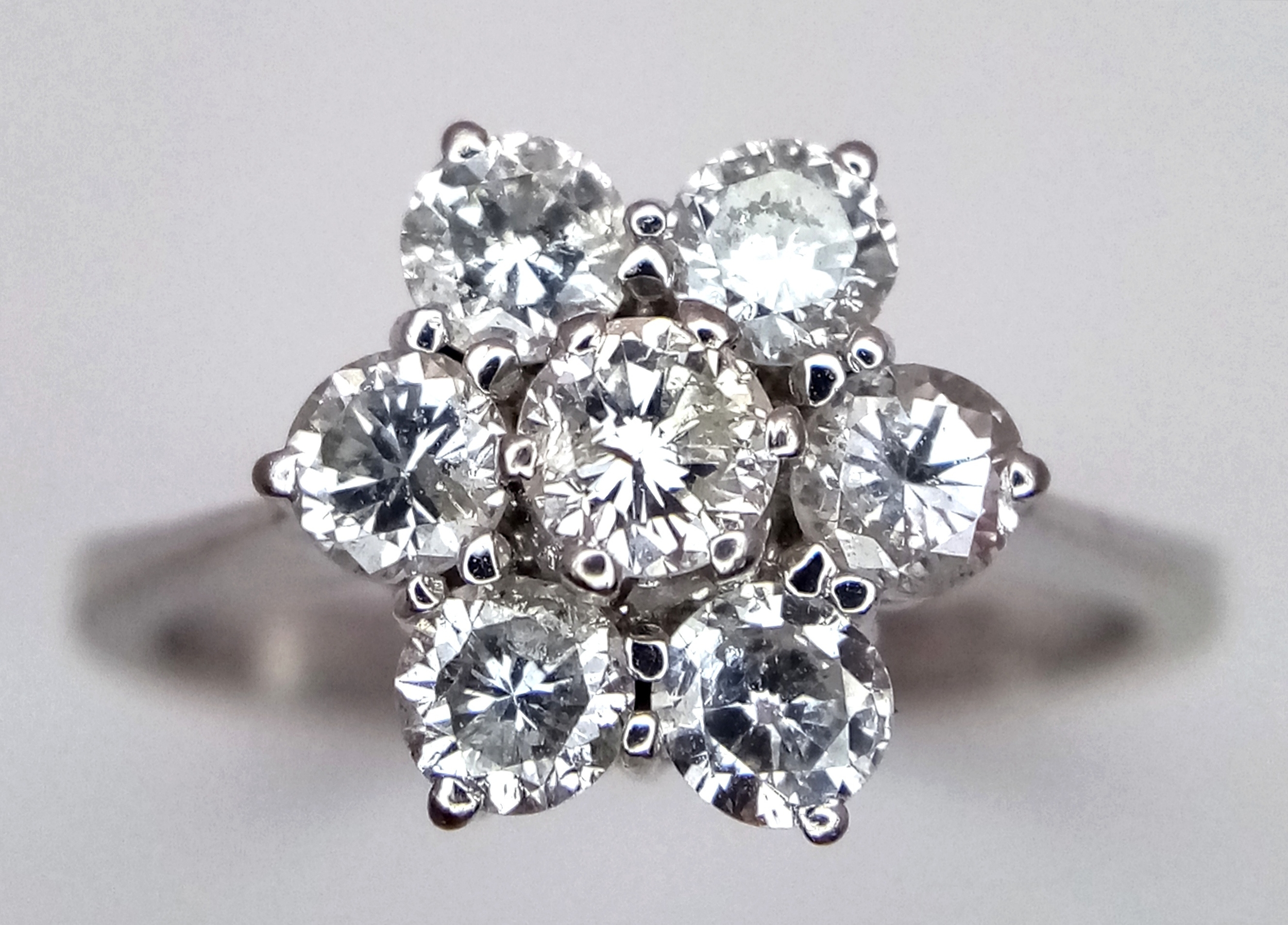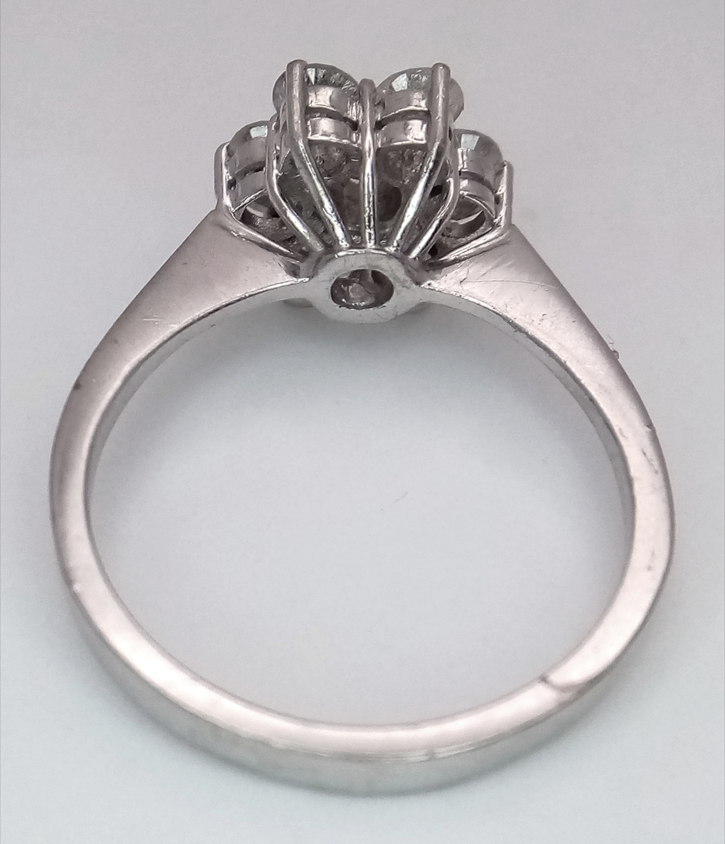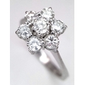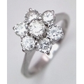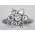 A 9K WHITE GOLD DIAMOND FLORAL CLUSTER RING. DIAMOND WEIGHT 0.70CT. TOTAL WEIGHT 3G. SIZE N. SPSA 2004