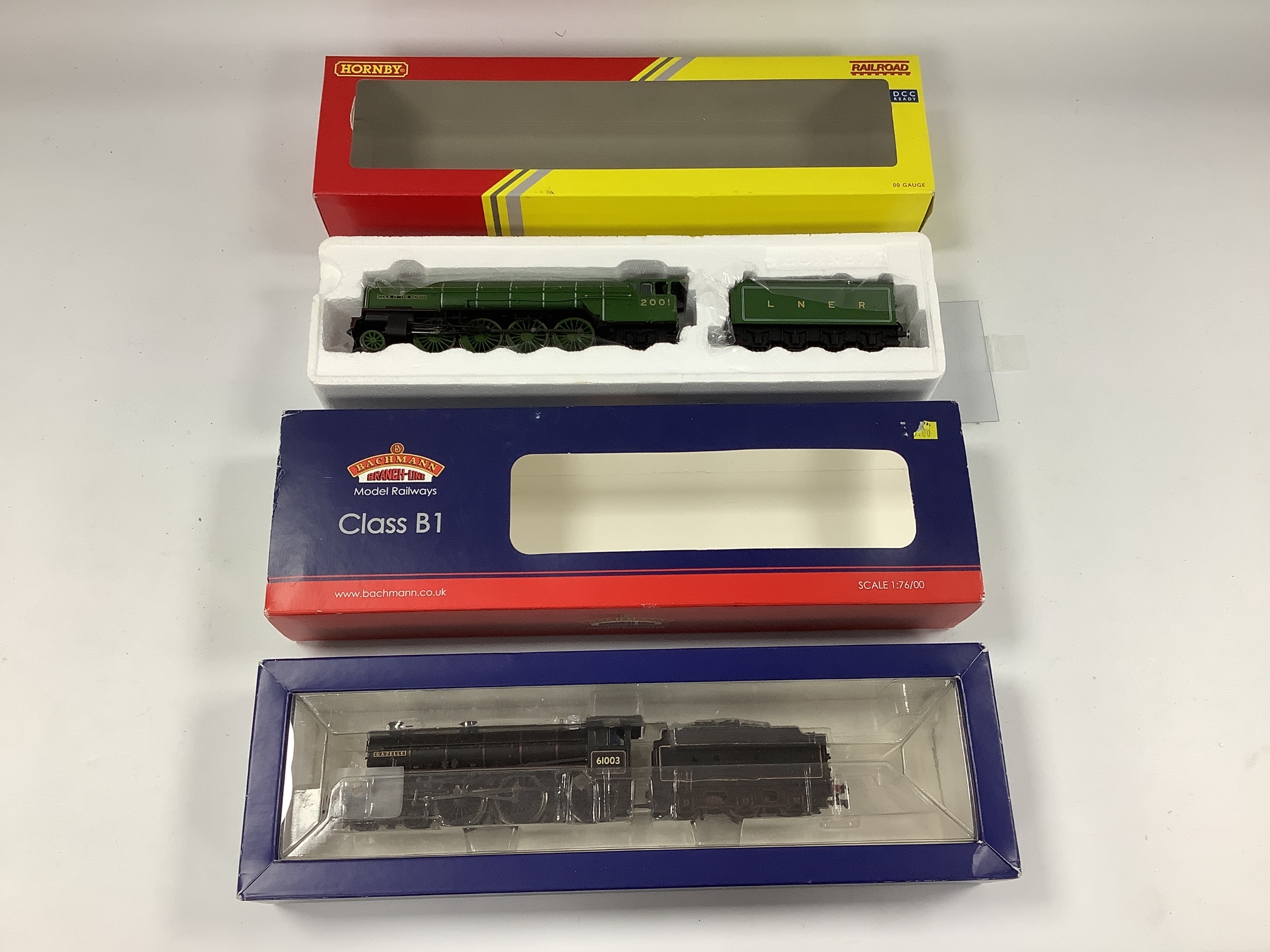 Two boxed 00 gauge LNER locomotives: a Bachmann B1 4-6-0 "61003 Gazelle" in BR black (one crew member fitted); and a boxed Hornby Railroad "Cock of the North" 2-8-2 in LNER Green; both untested in good apparent condition.