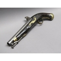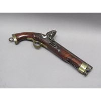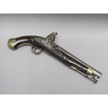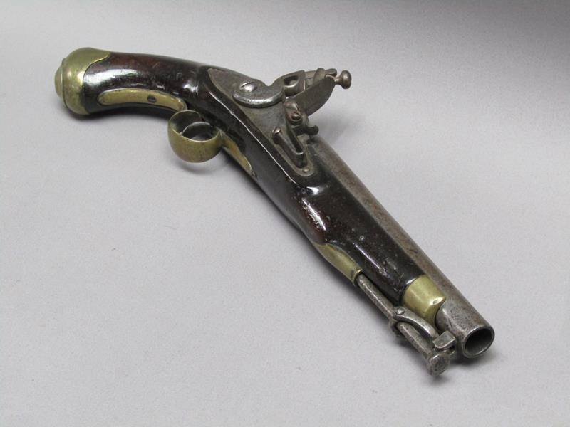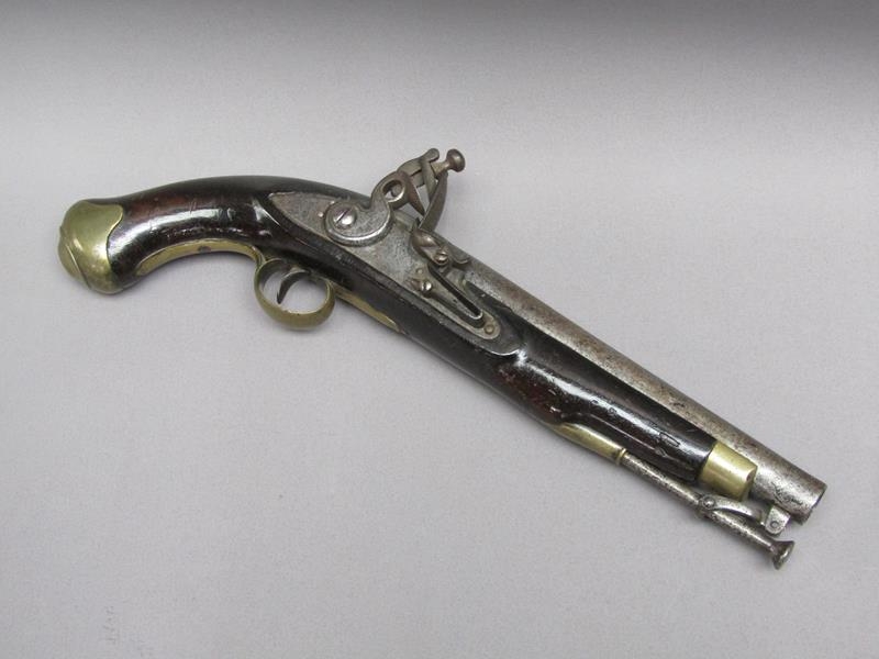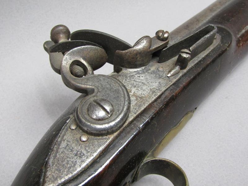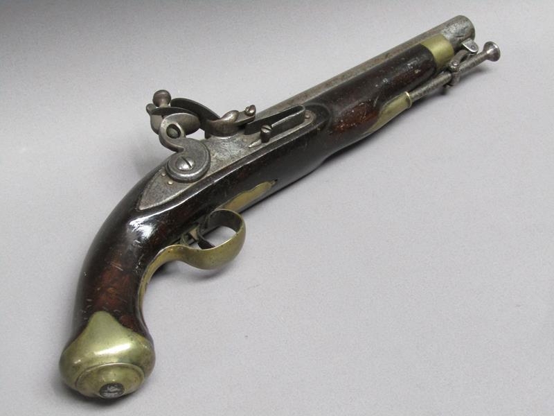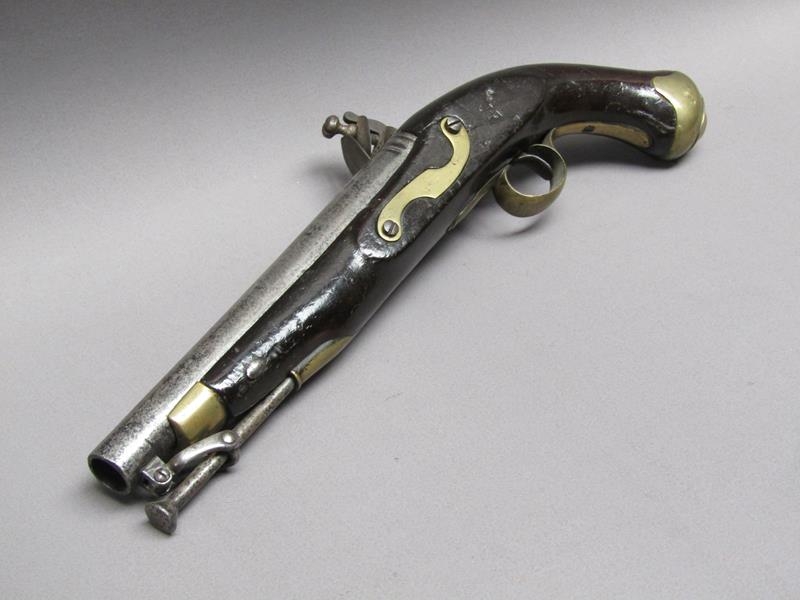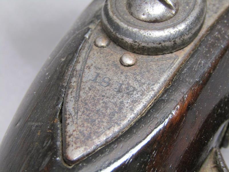 A sixteen bore flintlock pistol of military style, proof marks. The lock stamped 1812, the barrel with a crowned V, 15.5in long overall.