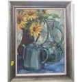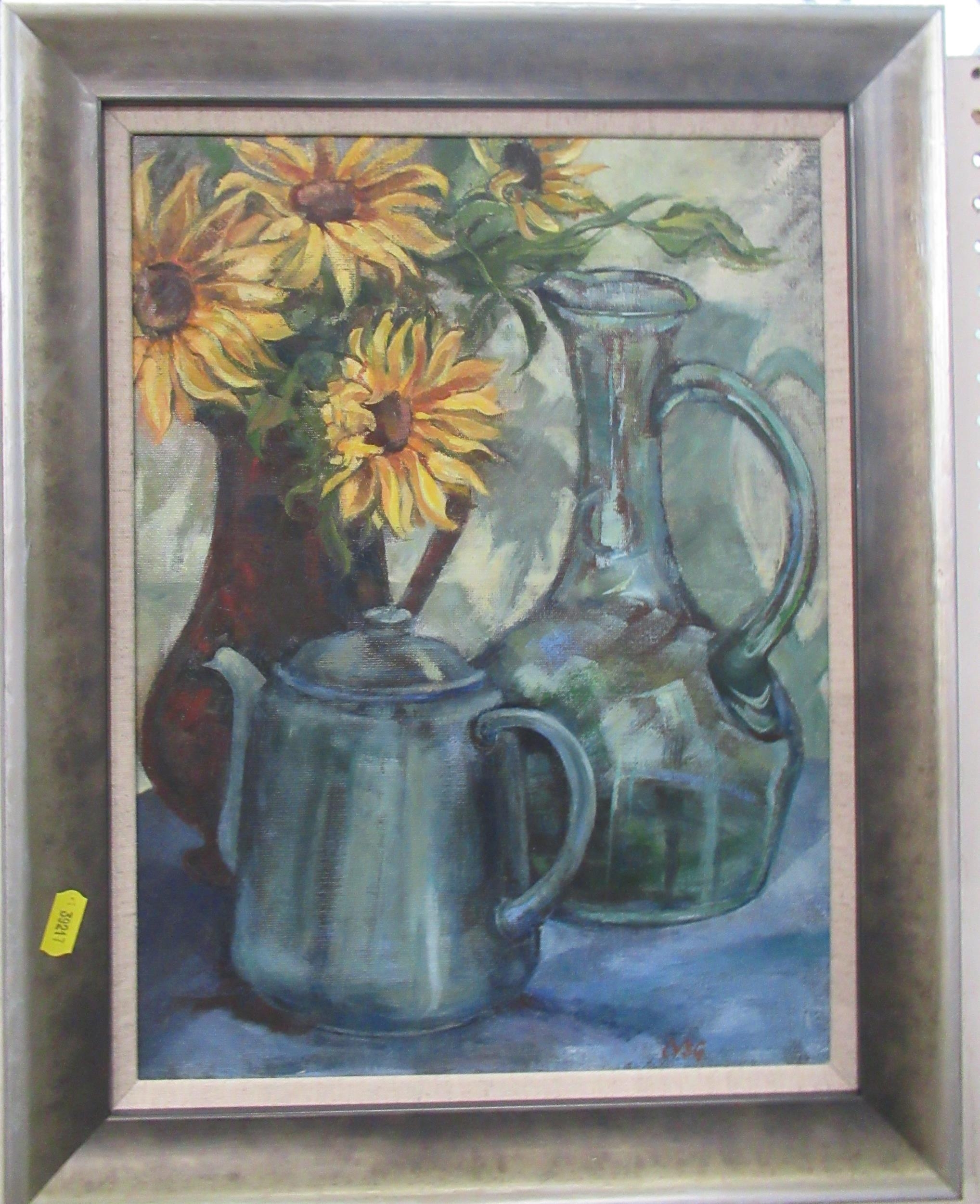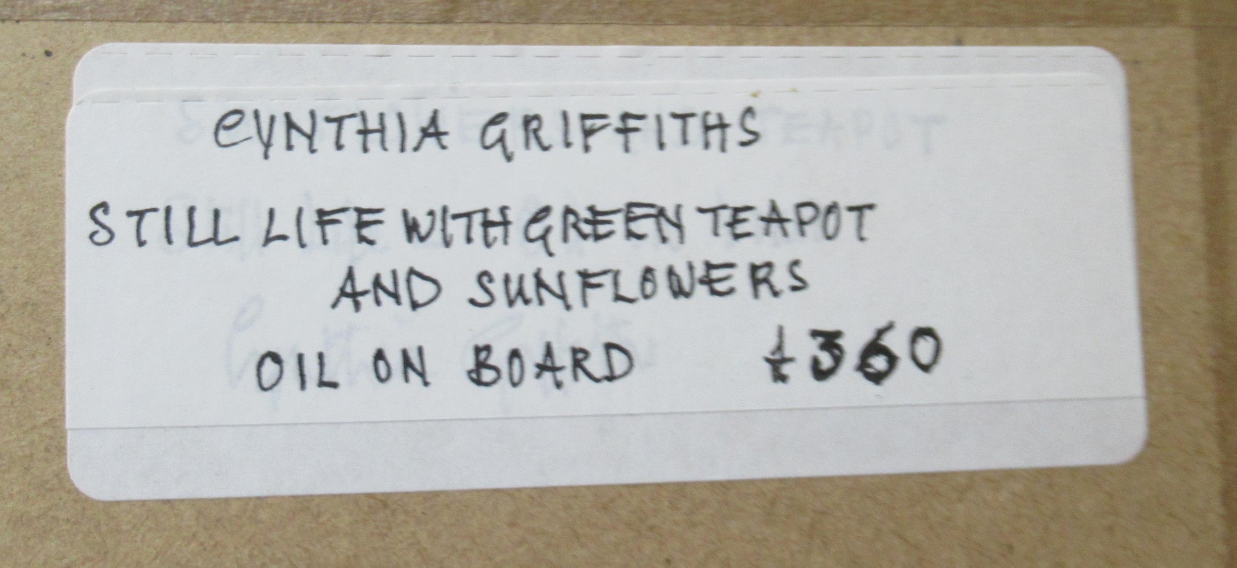 Cynthia Griffiths, oil on board, Still Life with Green Teapot and Flowers, 15ins x 11ins