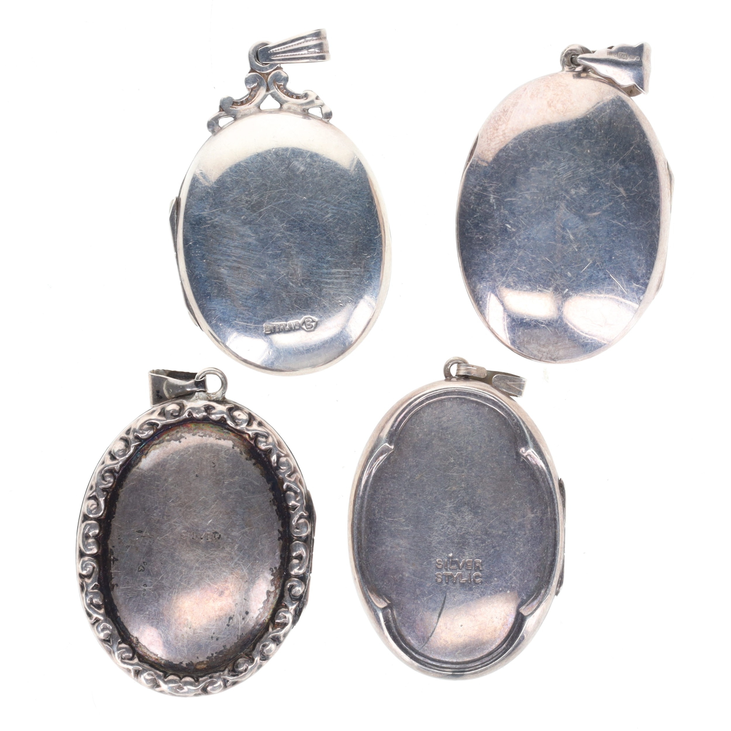 Mid Century Silver Locket Pendant Collection incl. Amethyst. Stamped. Some minor surface scratches and dents, one closure not fully working but does stay closed. Weighs in total 36.8g.