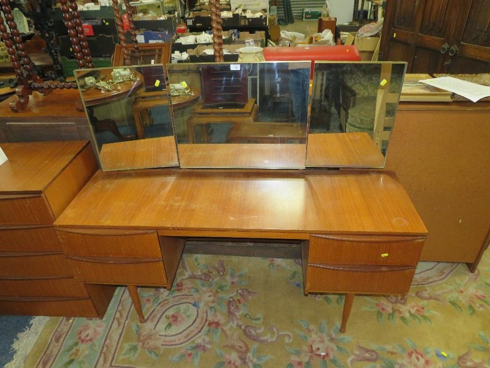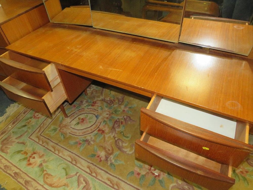 A RETRO TEAK DRESSING TABLE WITH TRIPLE MIRROR W-146 CM