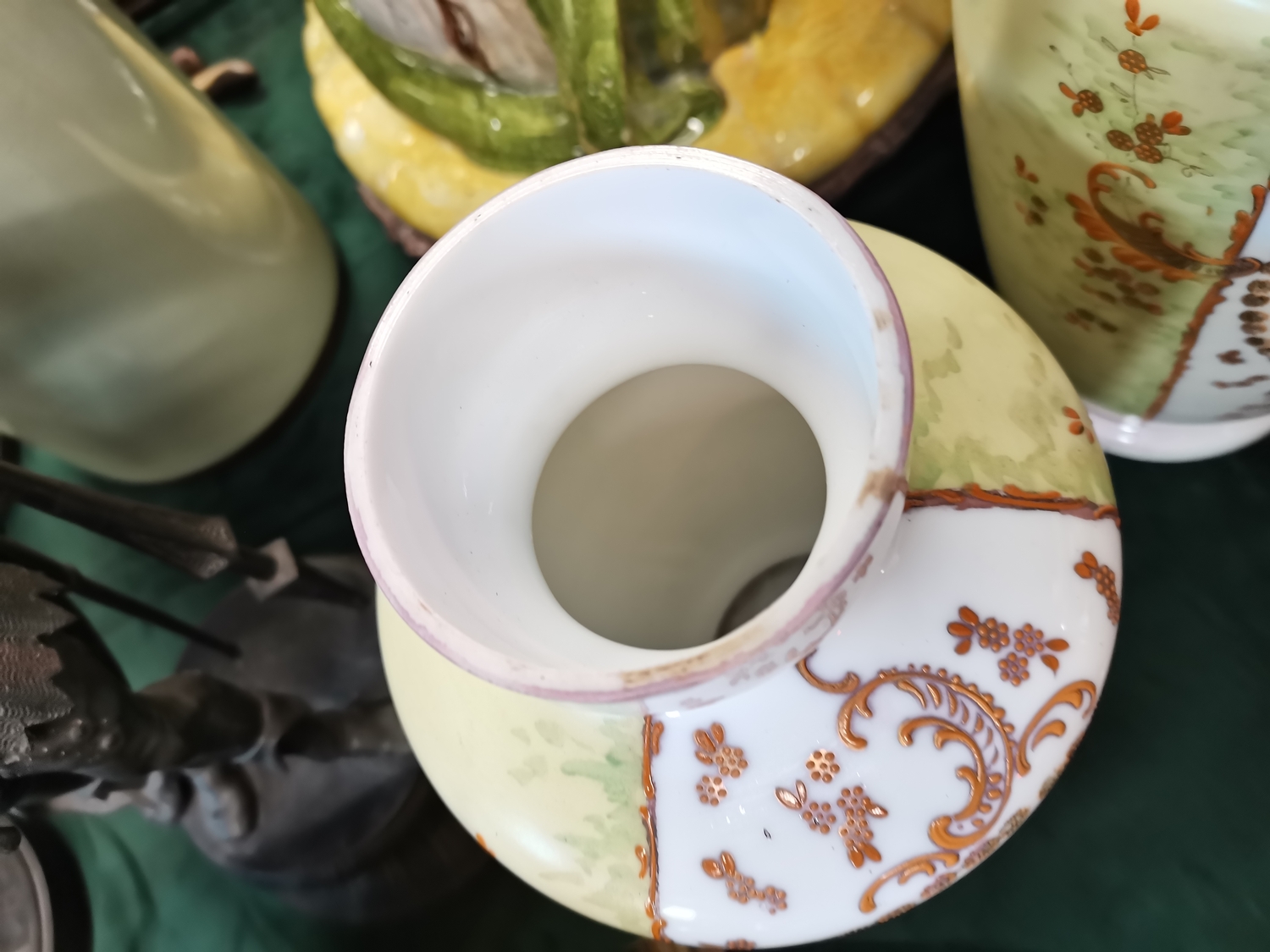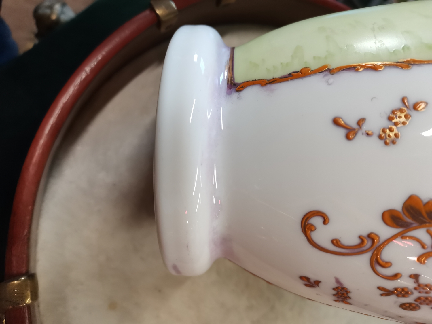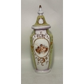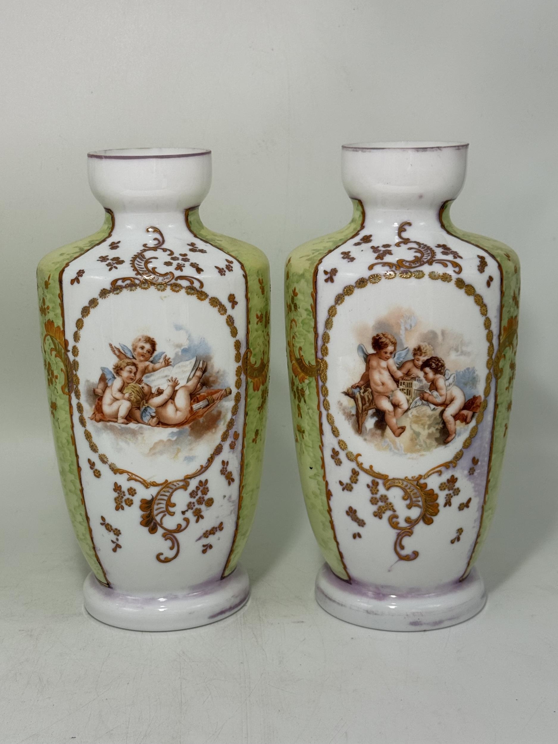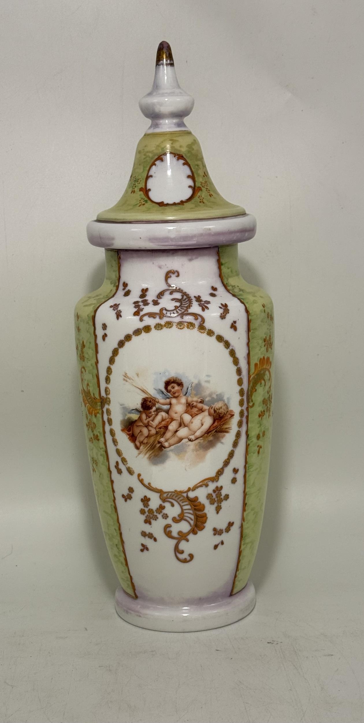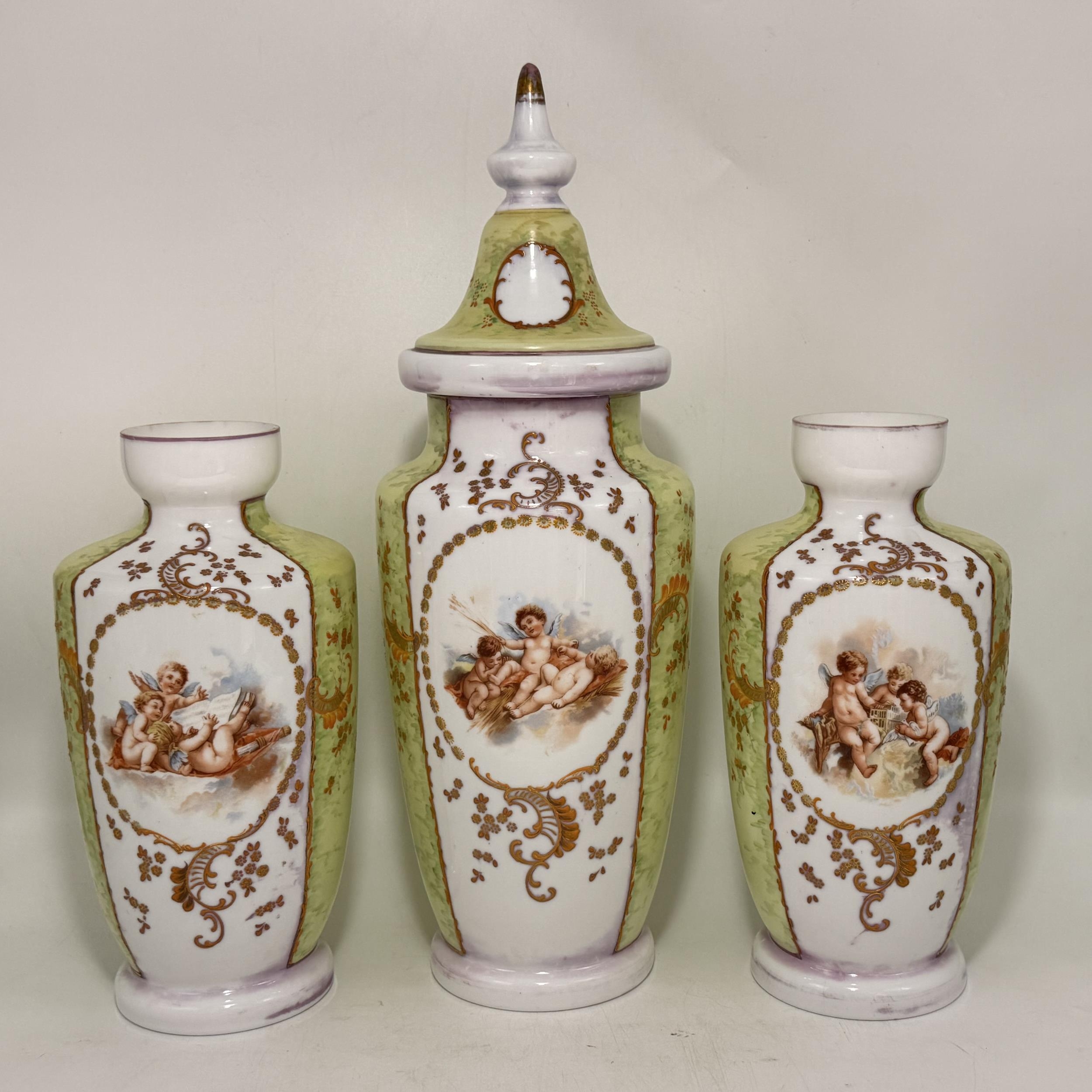 An opaline glass garniture, comprising a large vase and cover together with two smaller vases, each enamel painted to the front white section with a trio of winged putti within a foliate cartouche, the sides and back painted green. (3) Tallest 51.5cm high overall