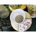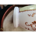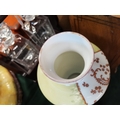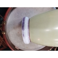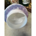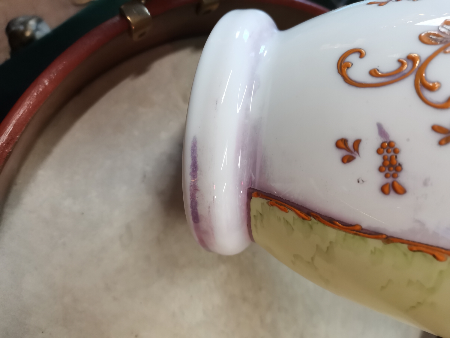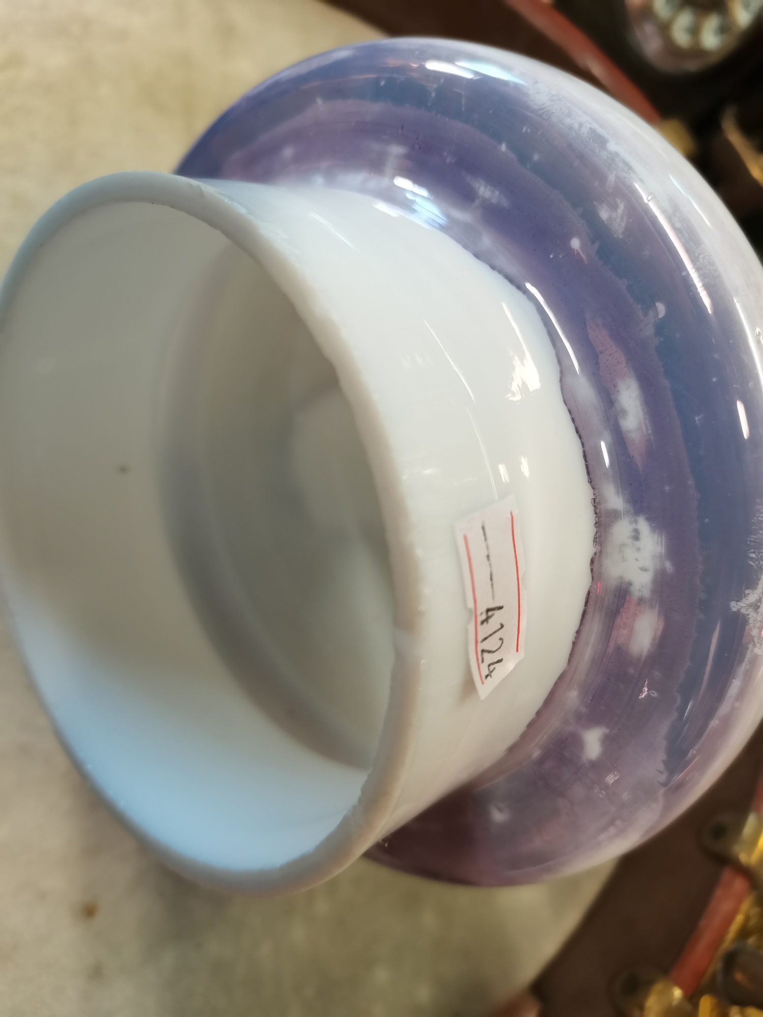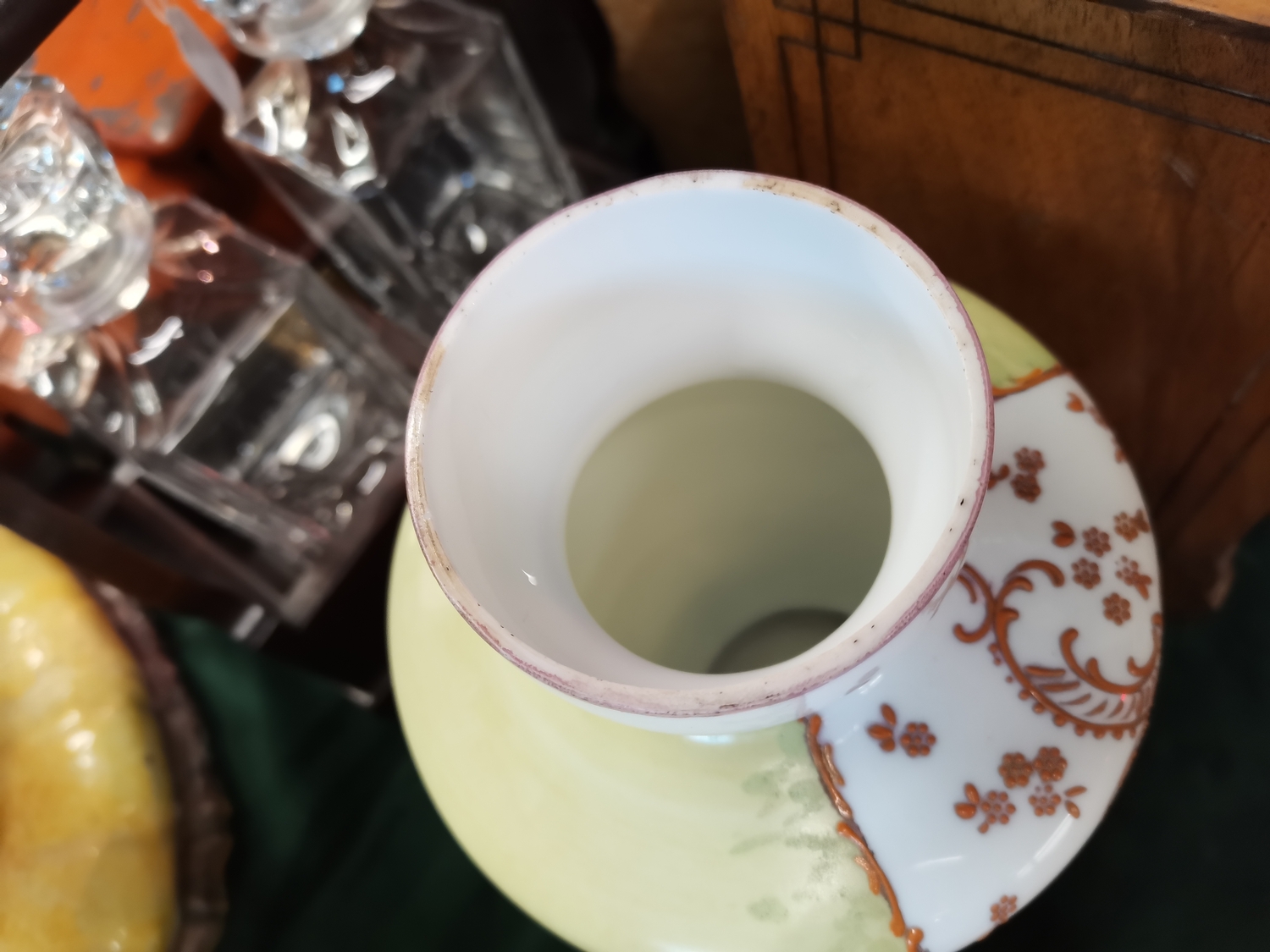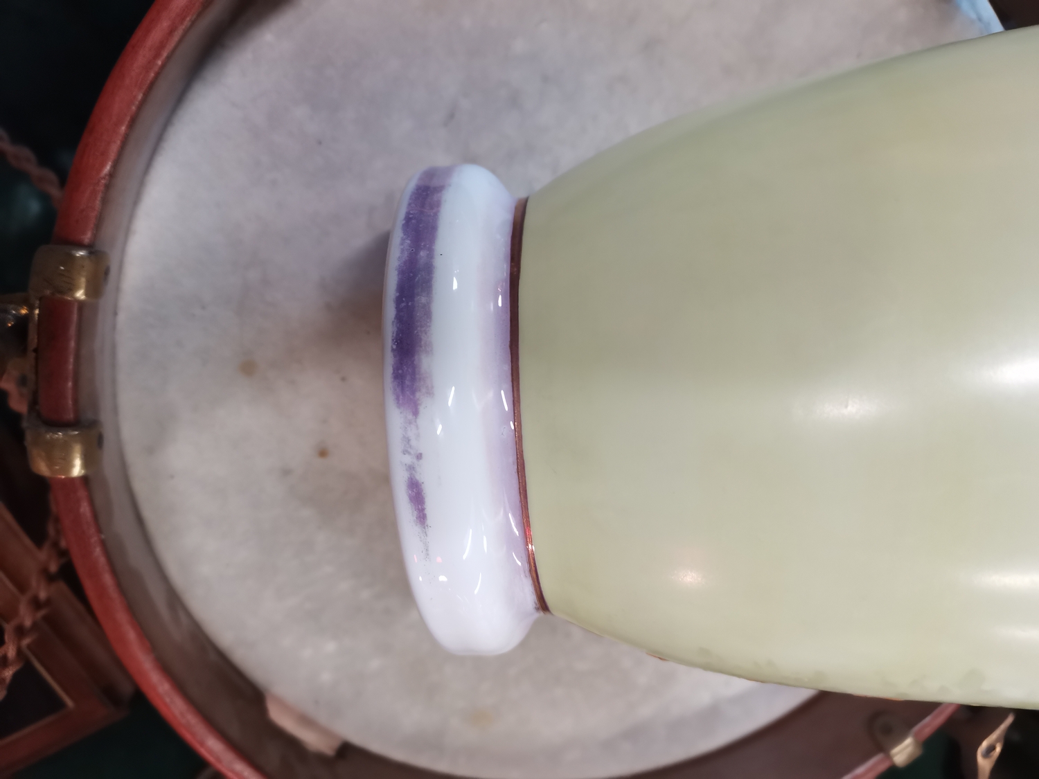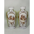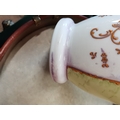 An opaline glass garniture, comprising a large vase and cover together with two smaller vases, each enamel painted to the front white section with a trio of winged putti within a foliate cartouche, the sides and back painted green. (3) Tallest 51.5cm high overall