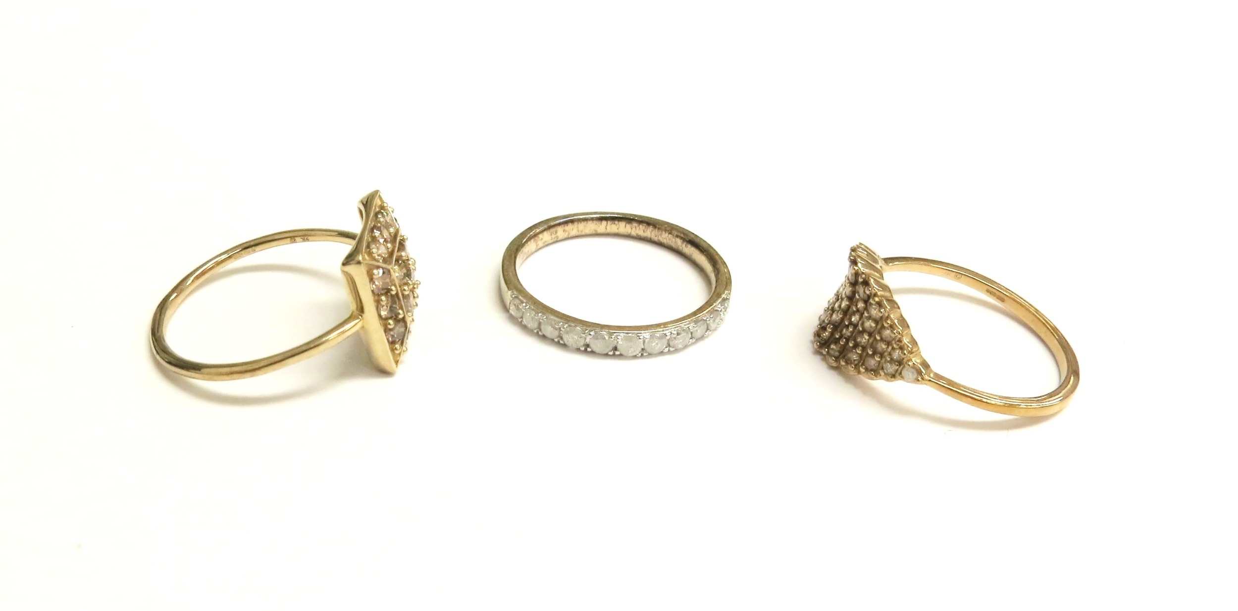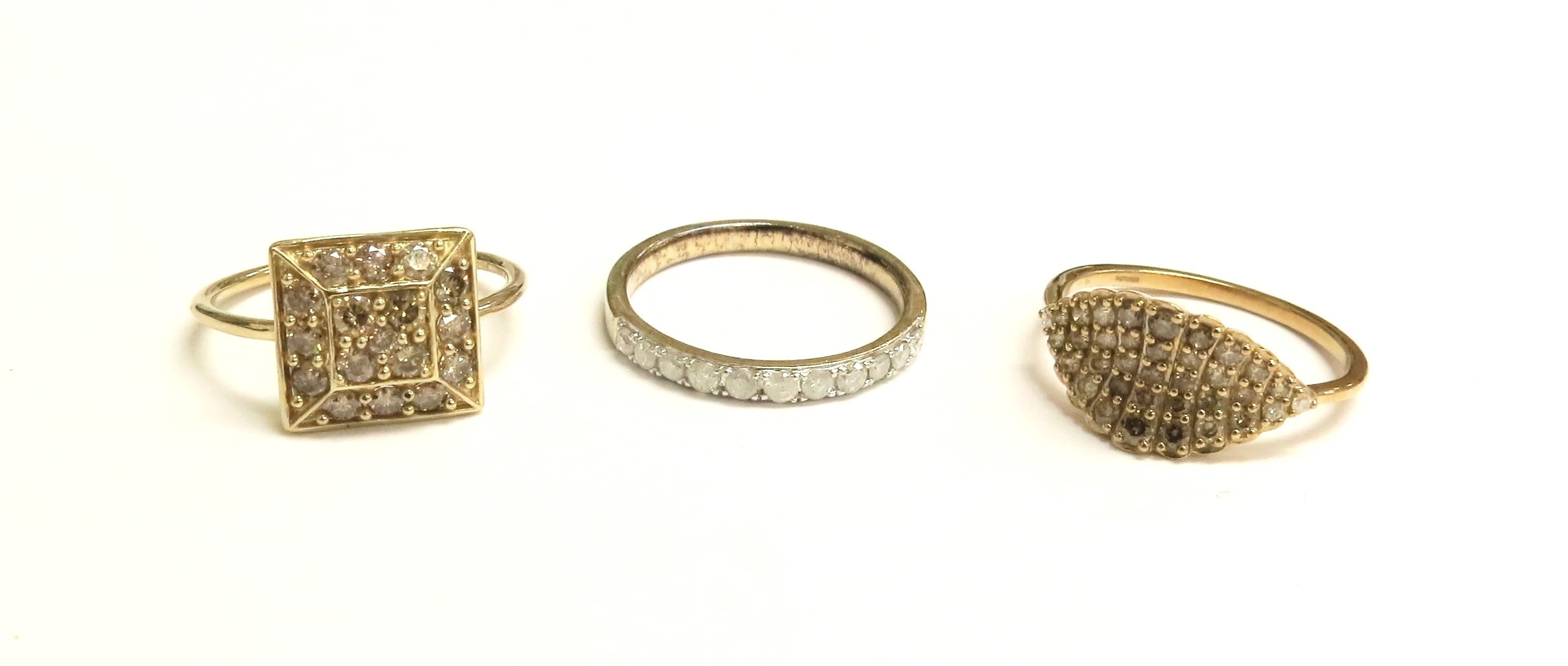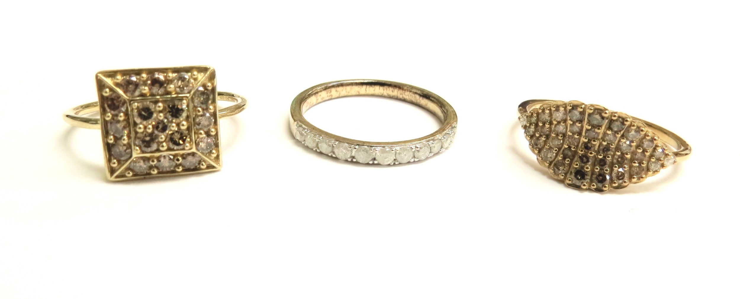 Three 9ct gold champagne diamond and diamond rings, sizes N/O and O, 5.6g