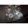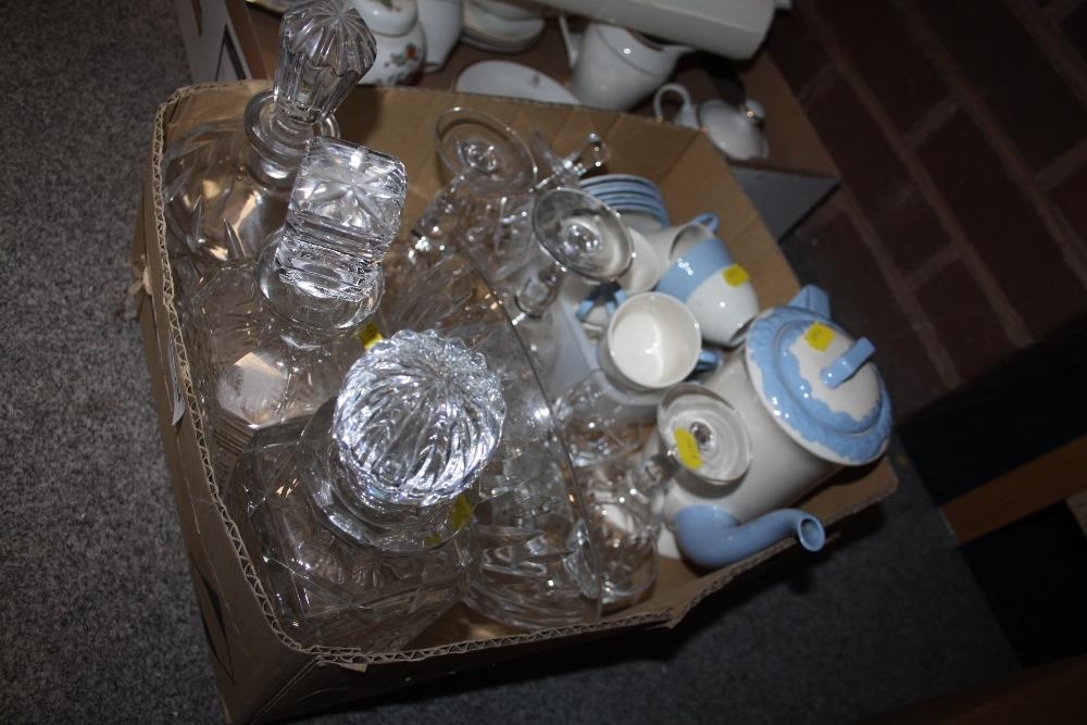 A BOX OF GLASSWARE TO INCLUDE DECANTERS TOGETHER WITH A JOHNSON ROSE ENGLISH OAK COFFEE SET