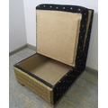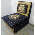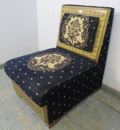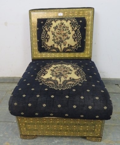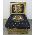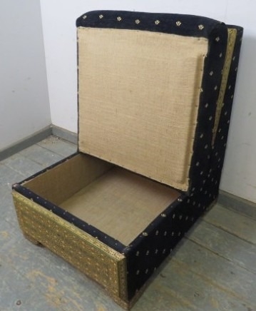 A highly decorative ottoman seat, upholstered in navy material with tapestry decoration, the back and front with profuse marquetry inlay in the Syrian taste, on inlaid block feet. The seat has a loose lid, revealing a storage well.
