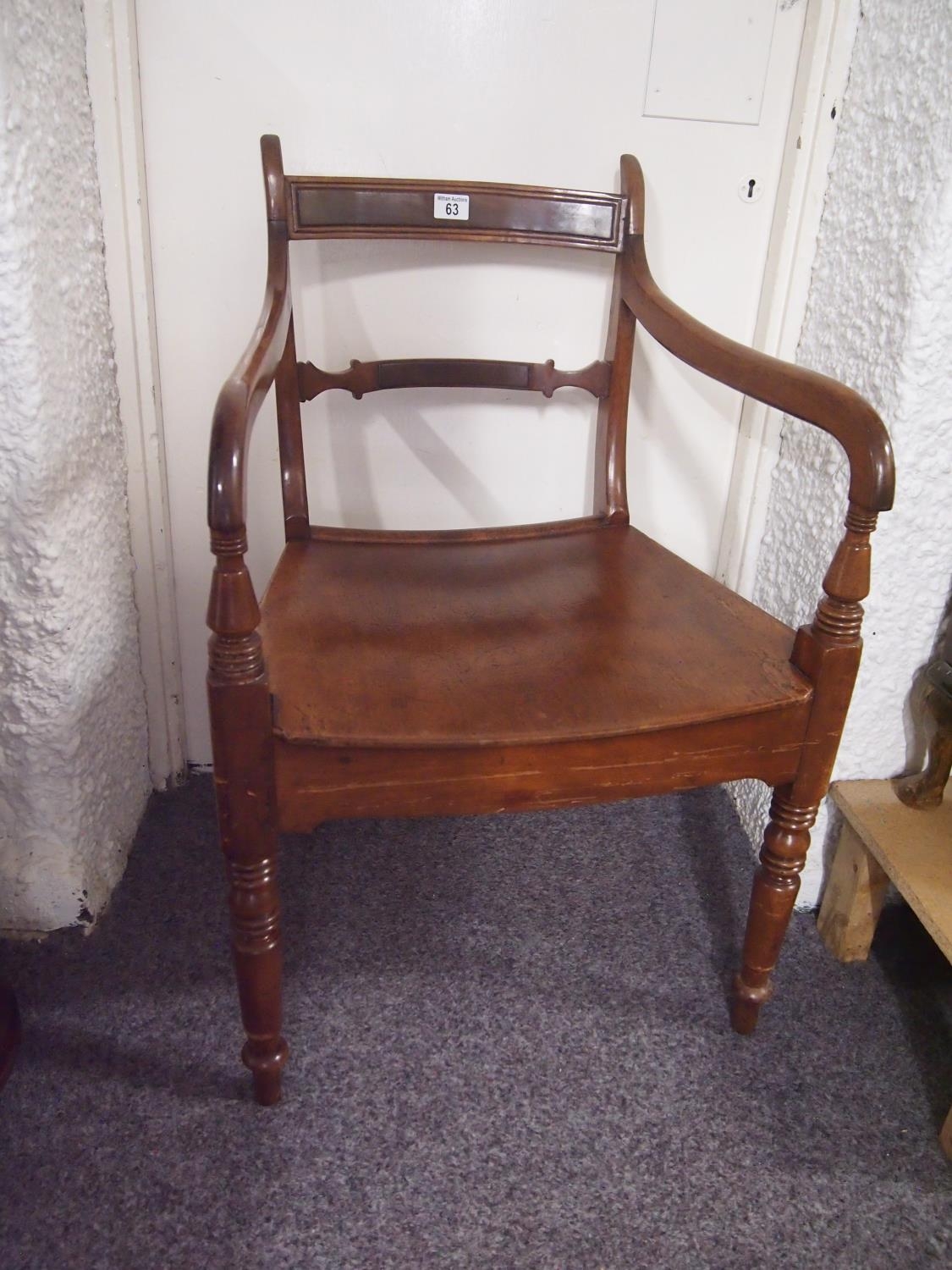An antique solid mahogany open arm elbow chair with bar back and turned leg detailing