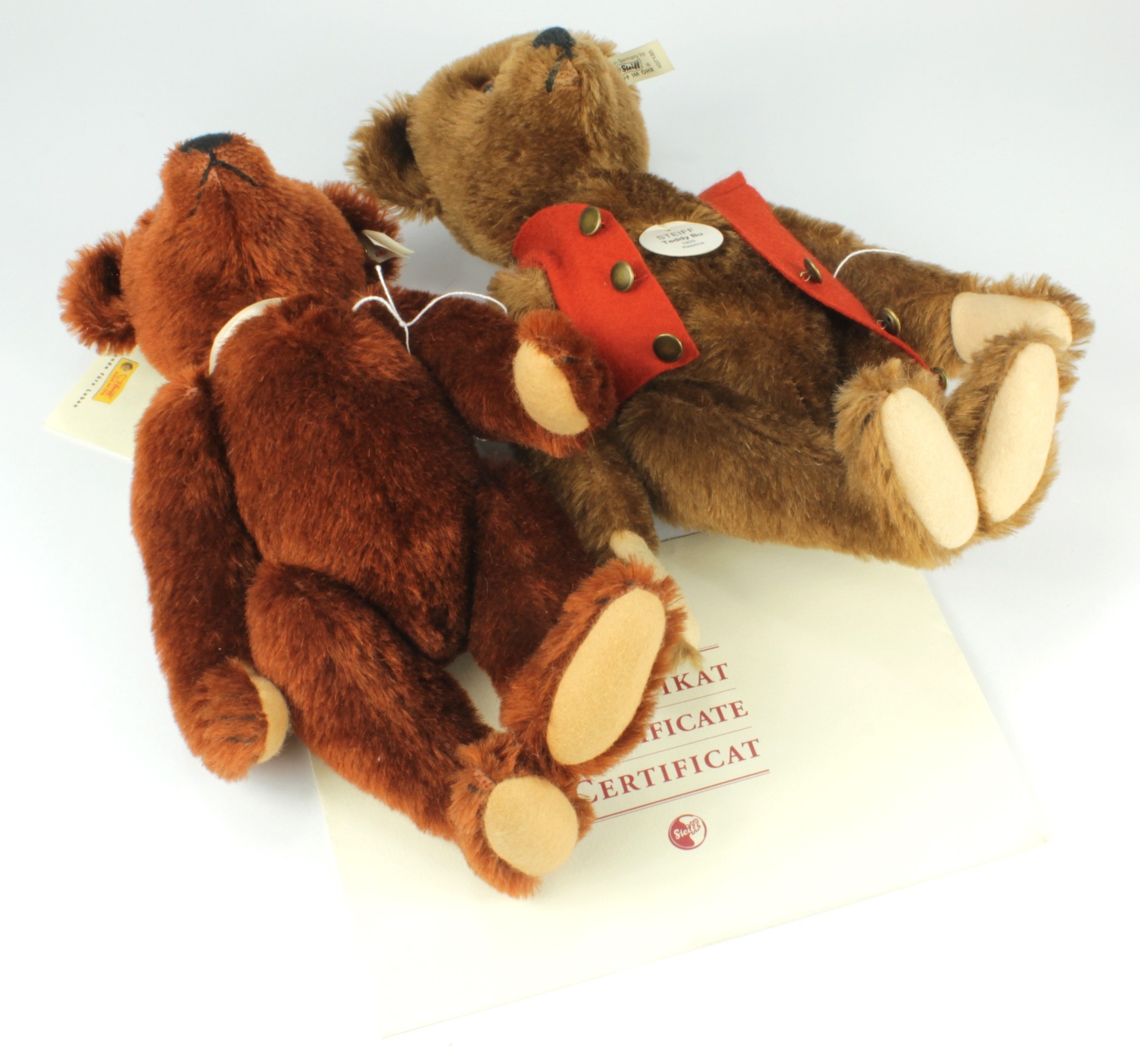 Steiff. Two Steiff bears, comprising Steiff Classic 1925 Replica Teddy Bu bear (with certificate) & Margarete Steiff Museum 1999 bear, both with button and label to ear, with original tag, length 30cm approx.