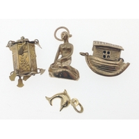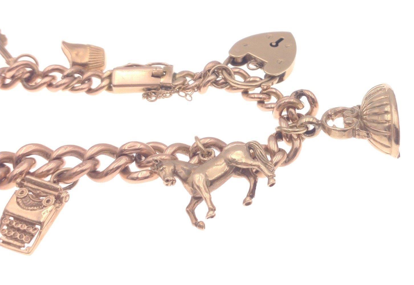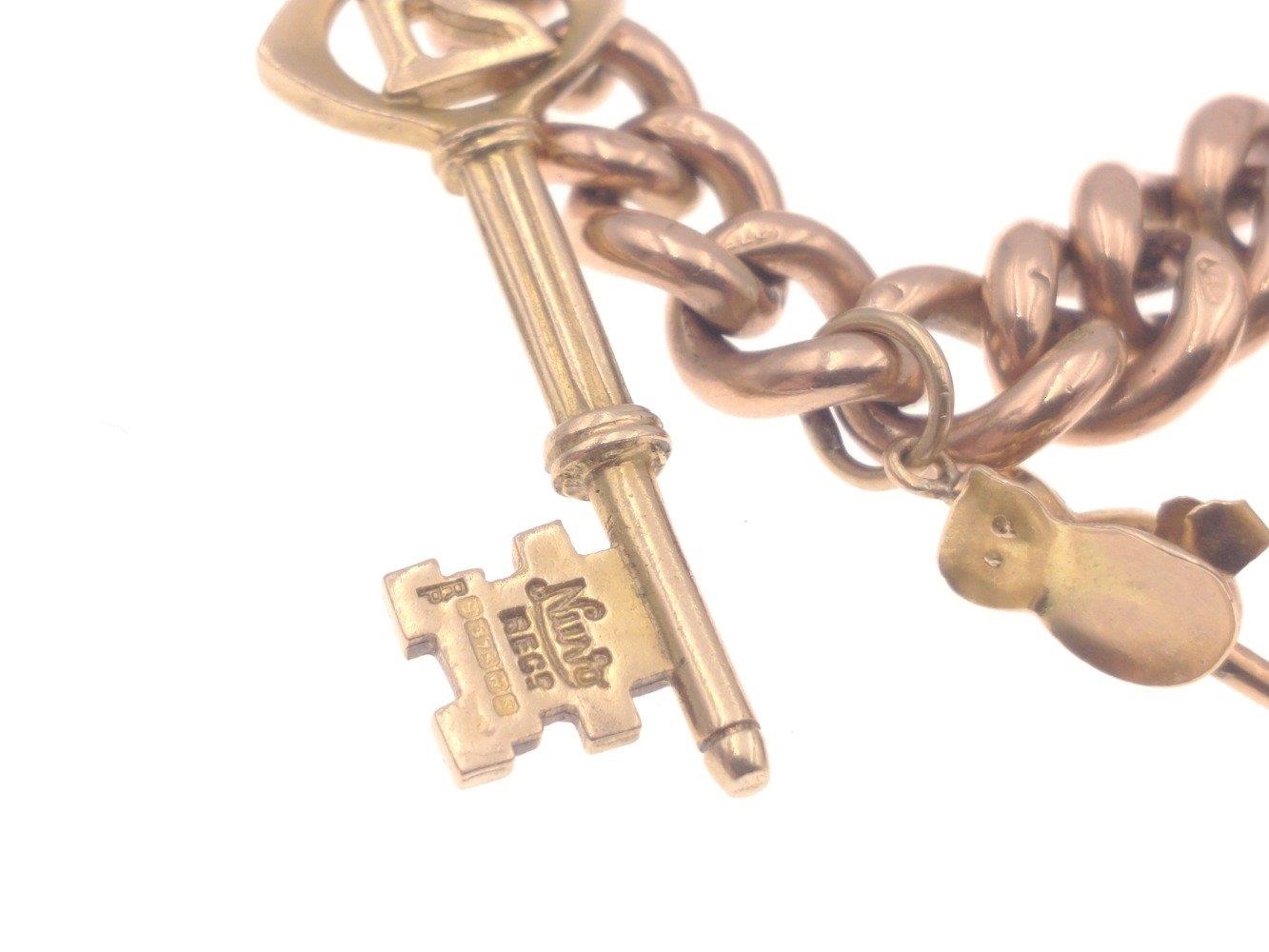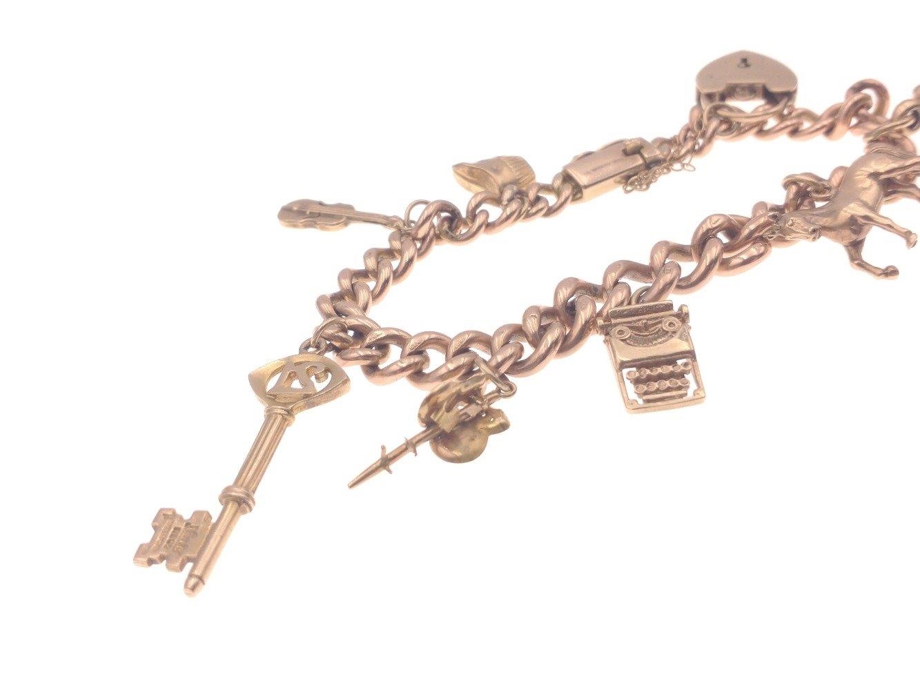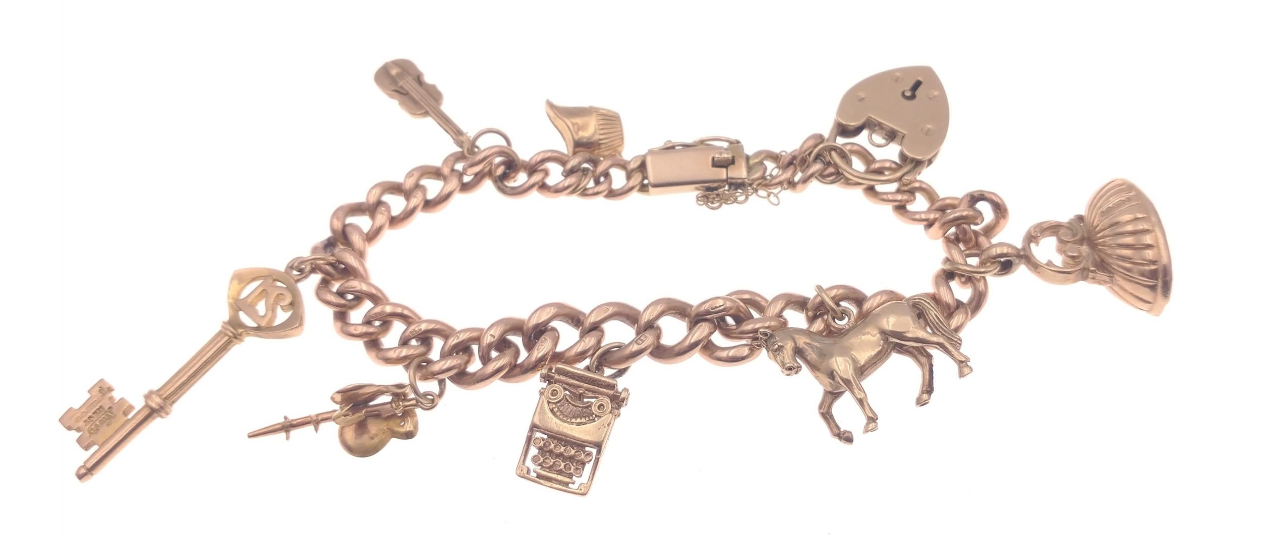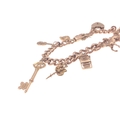 A gold 375 charm bracelet with 7 charms, six of which are stamped 375, bracelet length approx 18cm, gross weight 35.5g