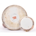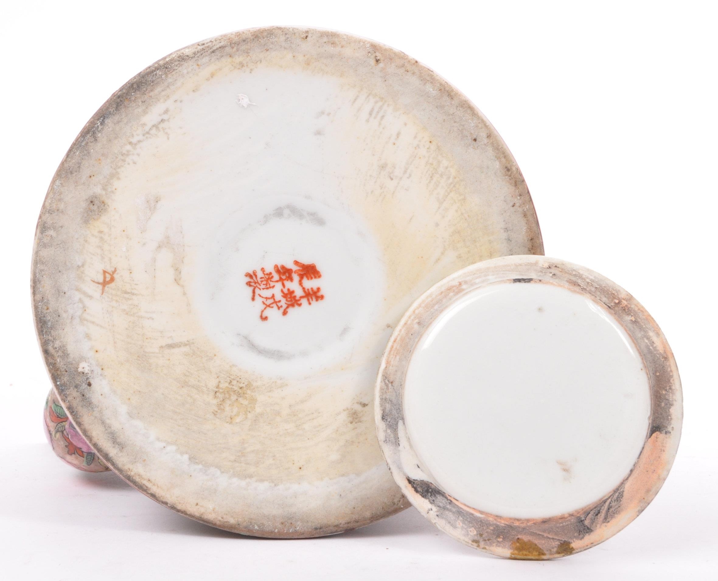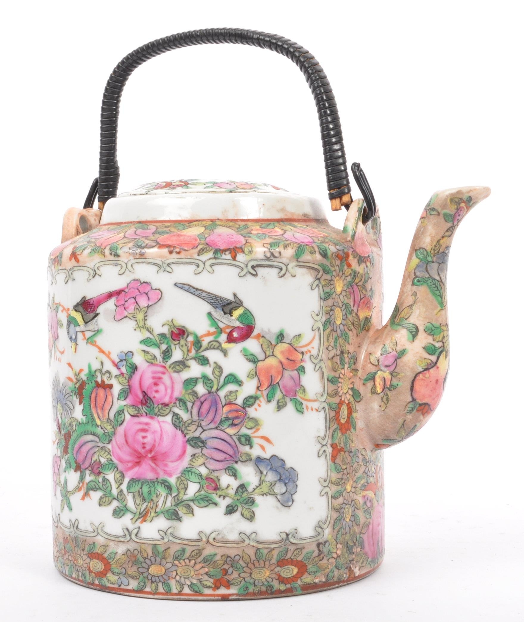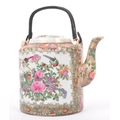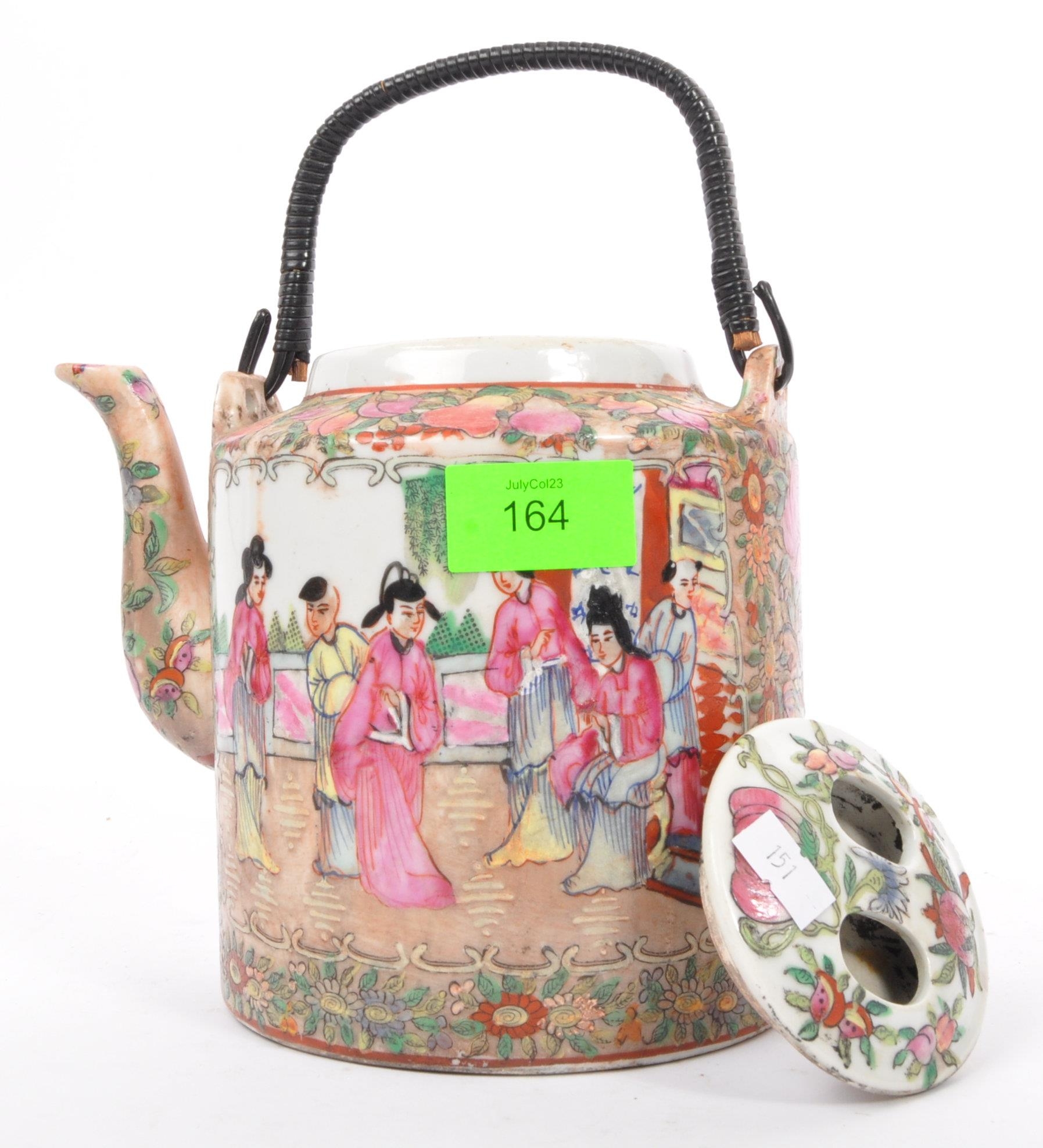 A 19th century Chinese famille rose large teapot. Decorated with scenes of people - geisha to one cartouche, floral spray to the reverse, Rattan handle atop and with lid.