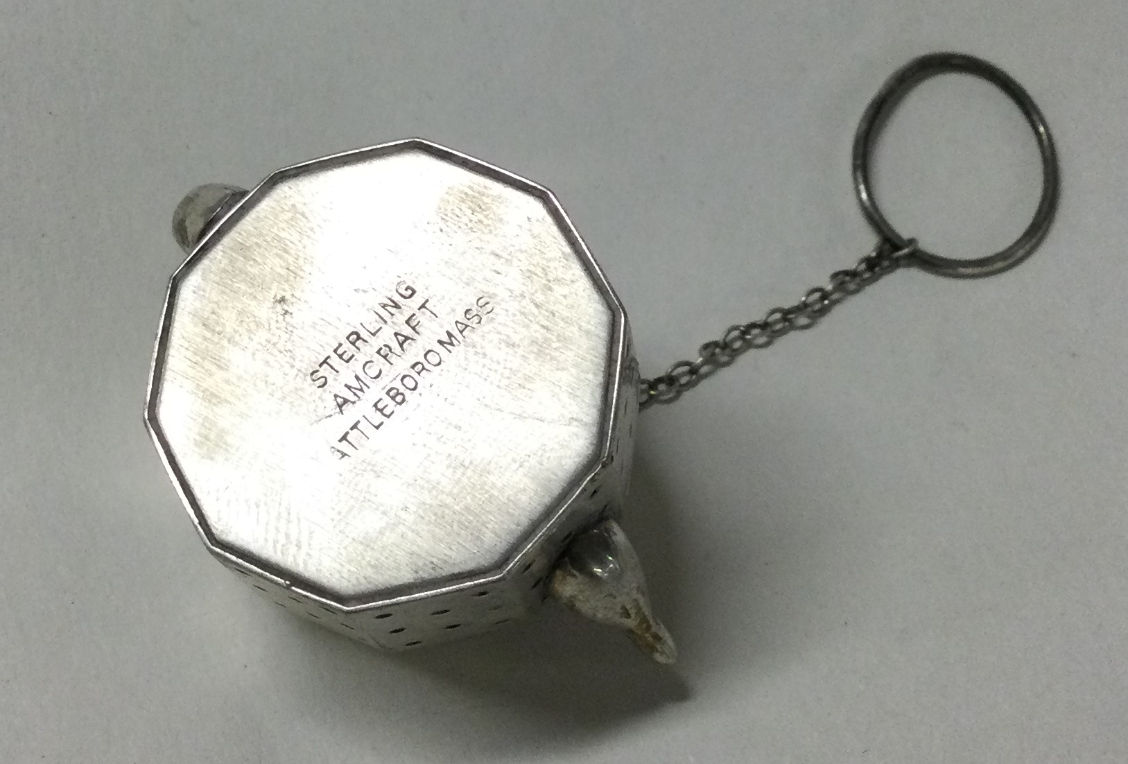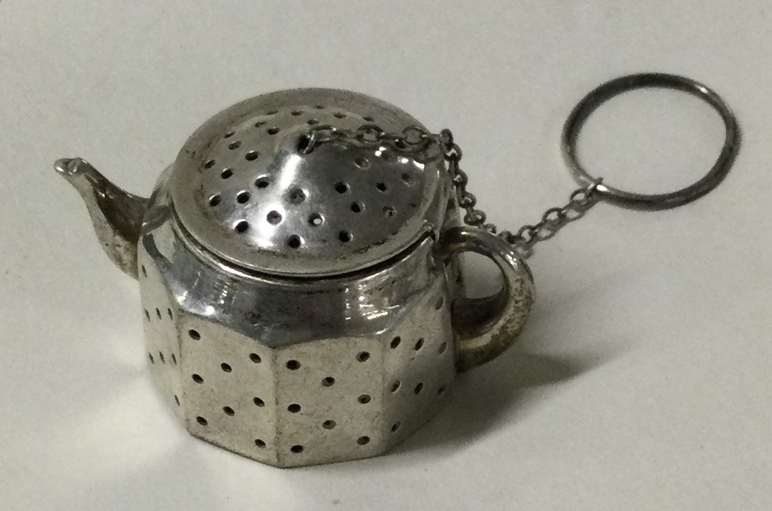 An American silver tea strainer in the form of a teapot. Approx. 22 grams. Est. £30 - £50.