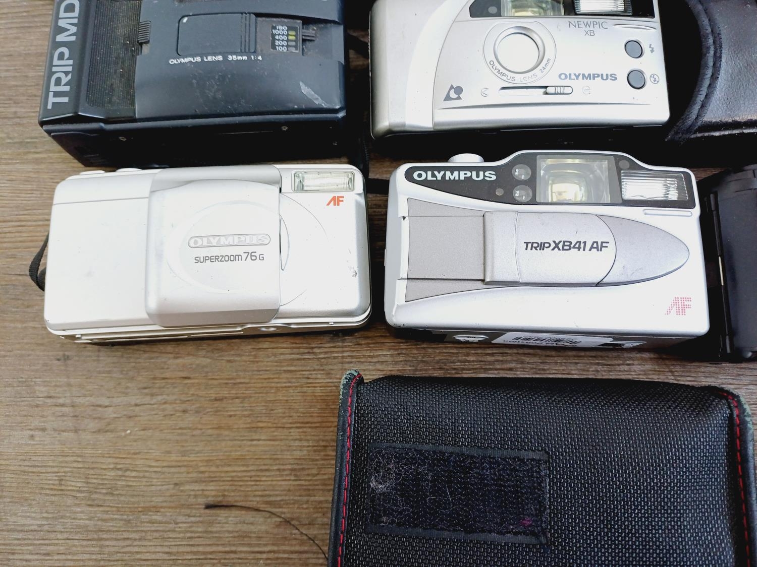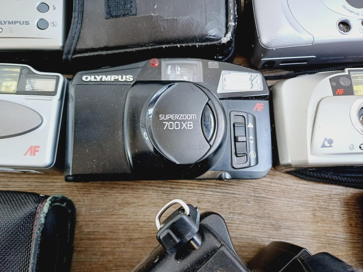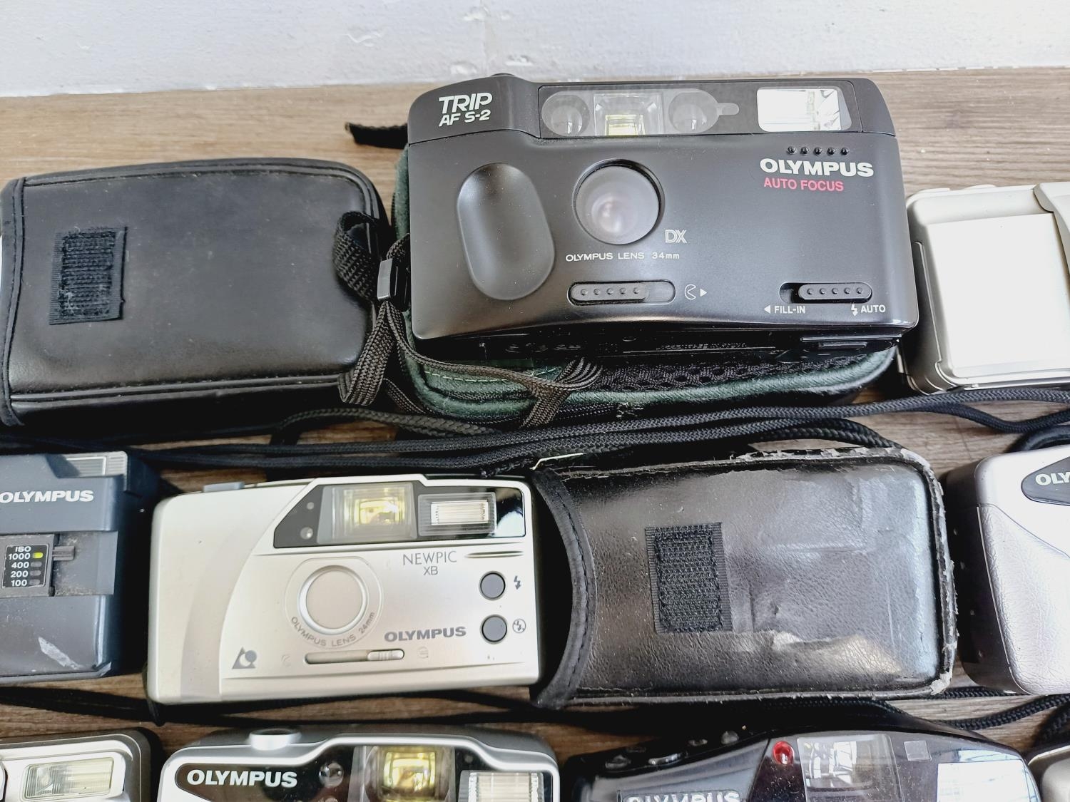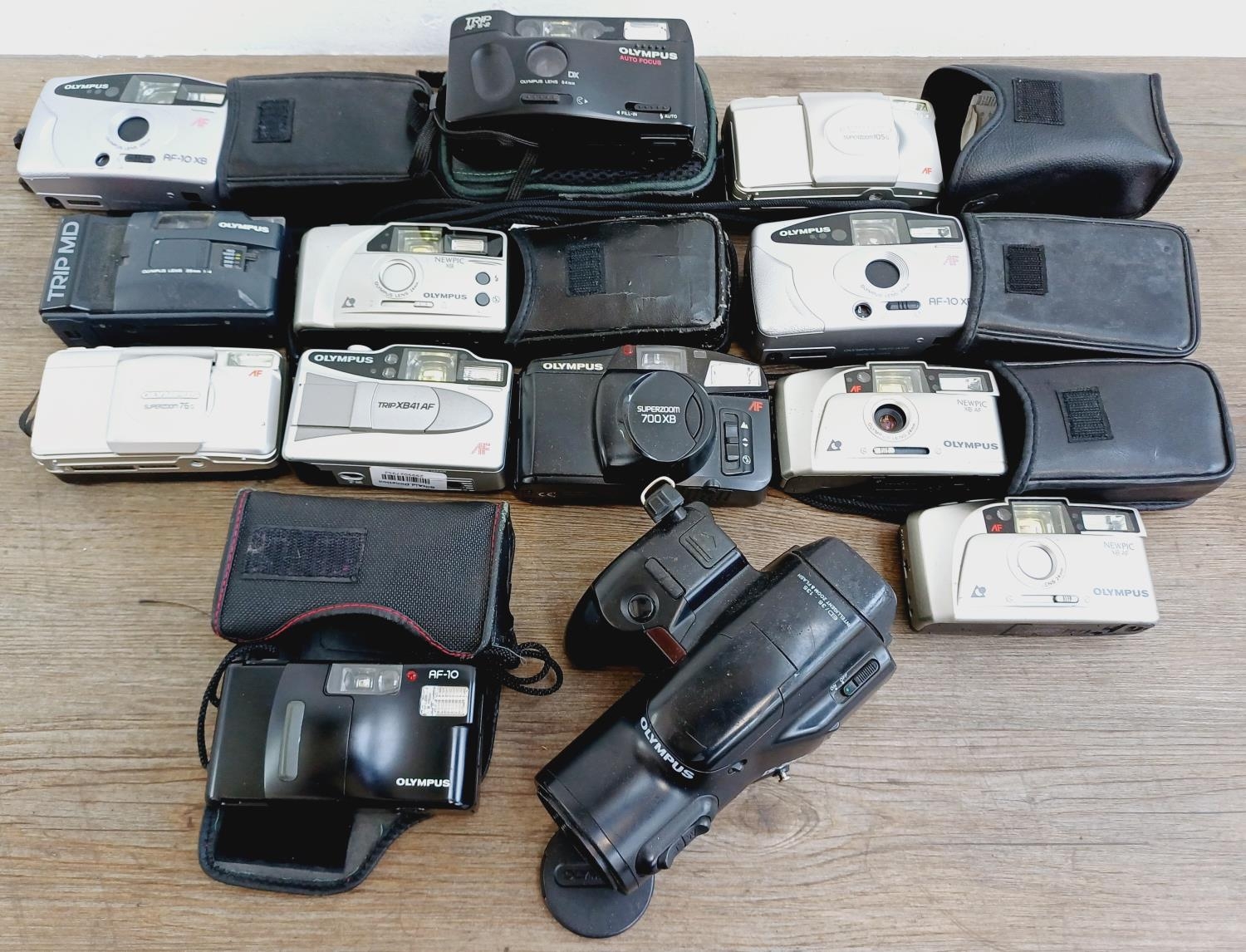 Thirteen Olympus 35mm cameras to include cased AF-10, iS-2000 fixed lens autofocus SLR, Trip MD, Superzoom 700XB, 105G and 76G, Trip AF S-2 etc.