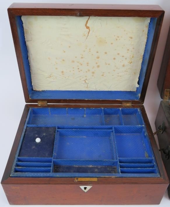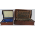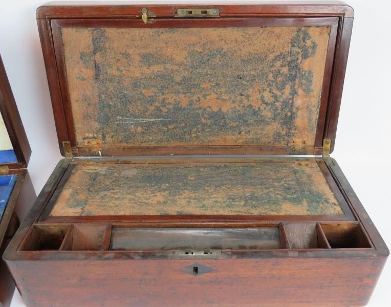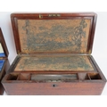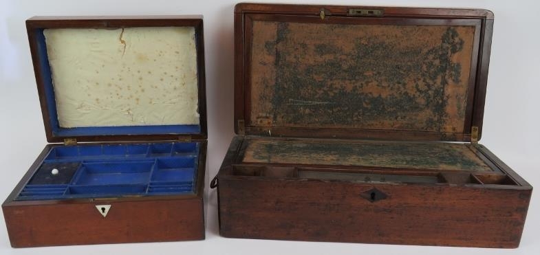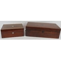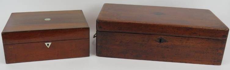 A 19th century Mahogany writing slope with brass fittings and a 19th Century Rosewood sewing box with fitted tray and M.O.P. inlay. Largest: 48cm x 25cm. (2).
