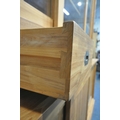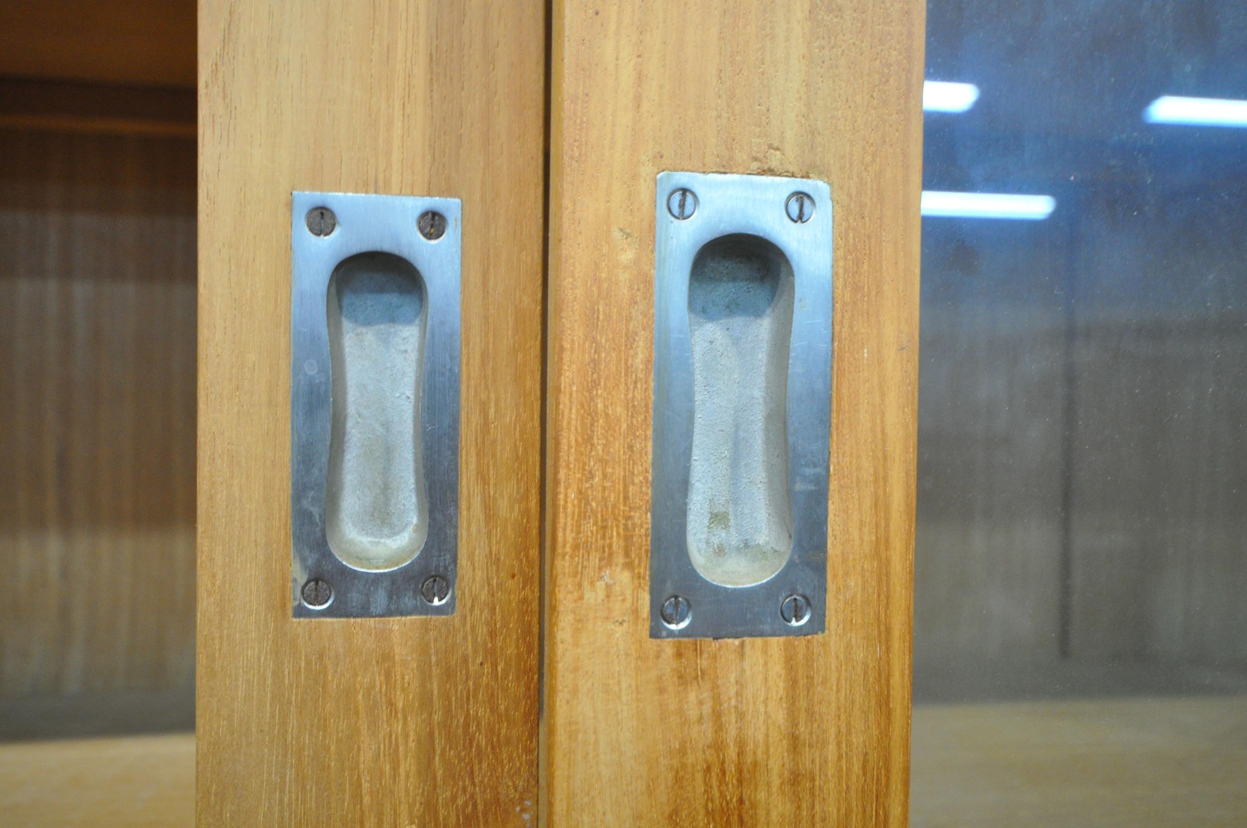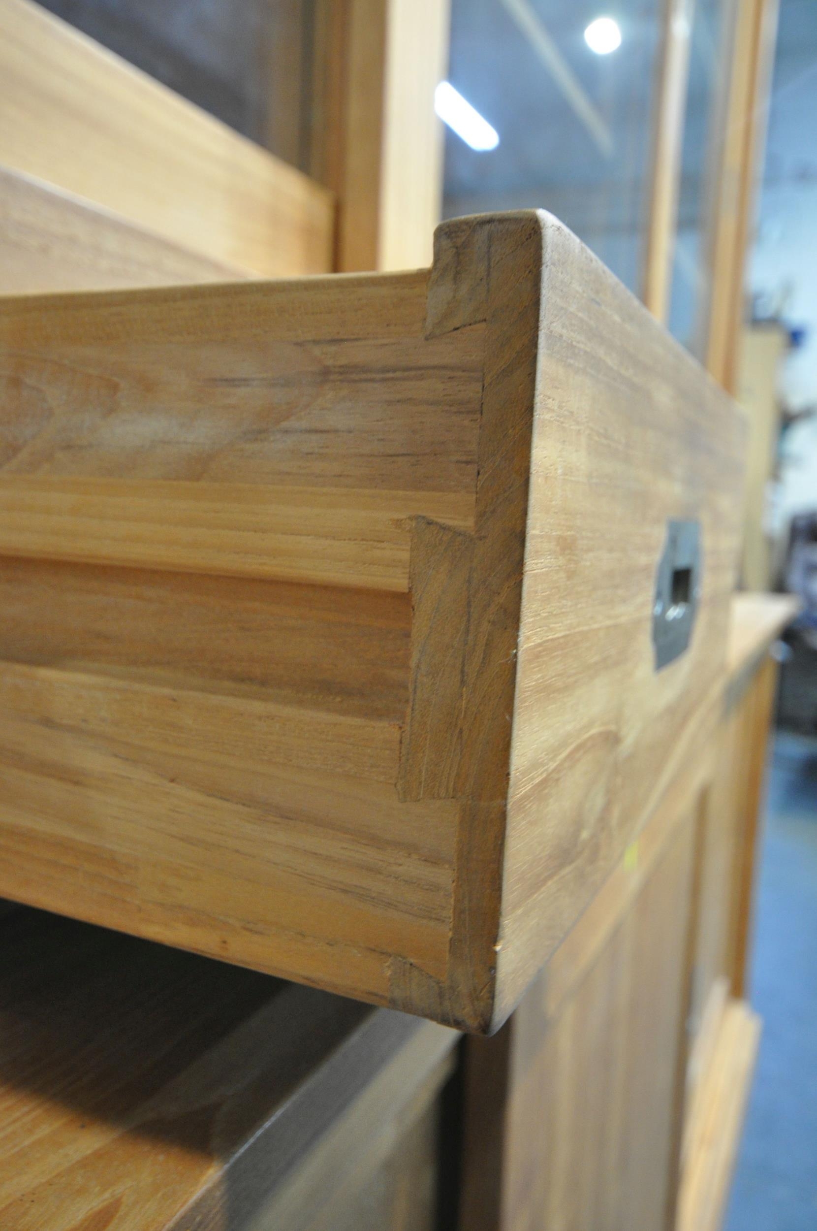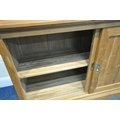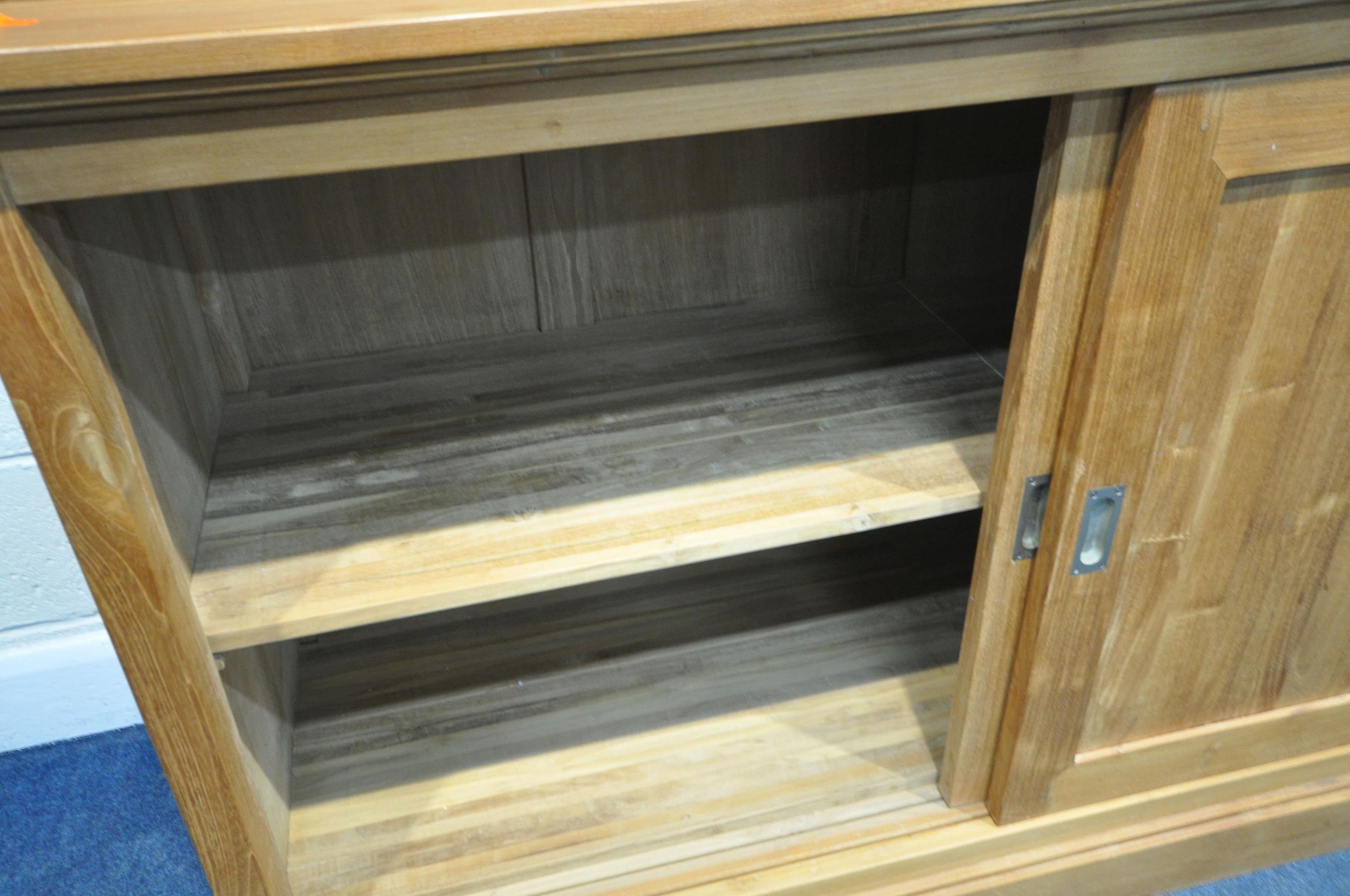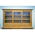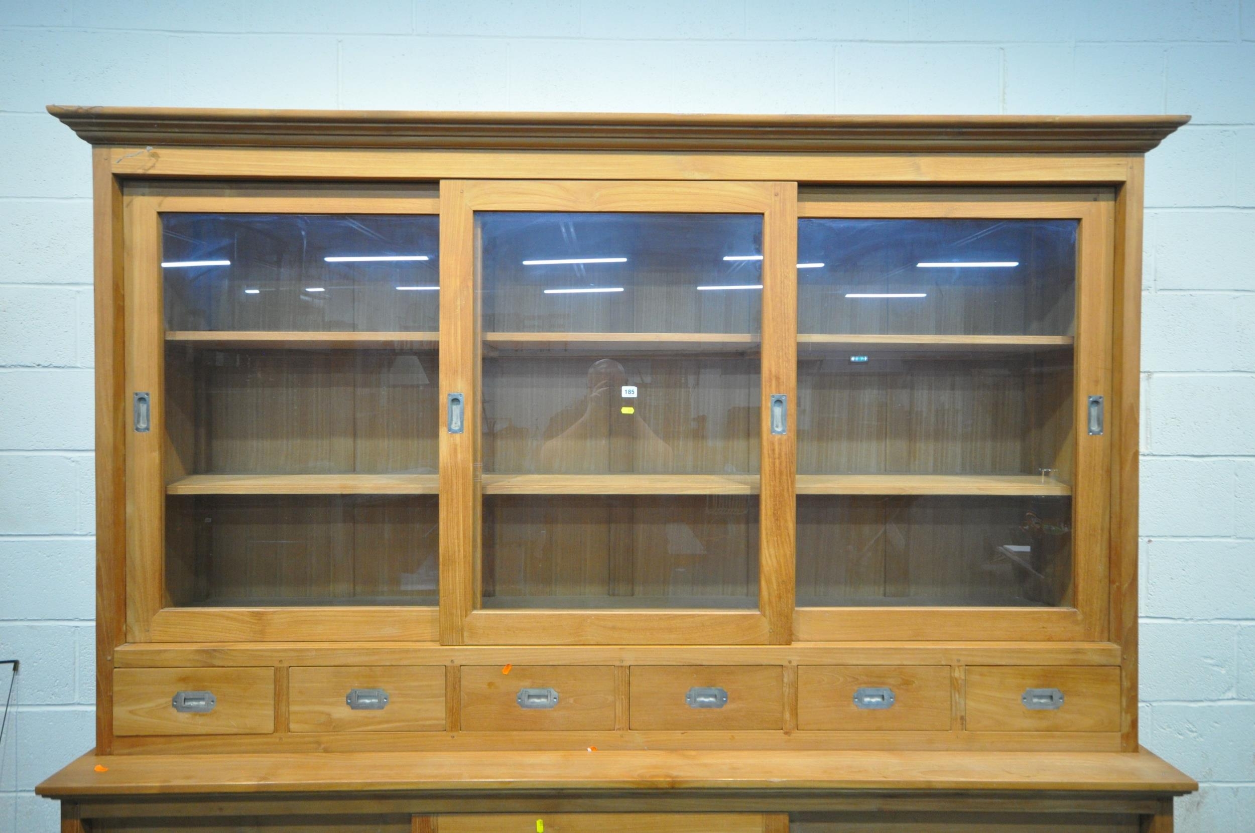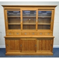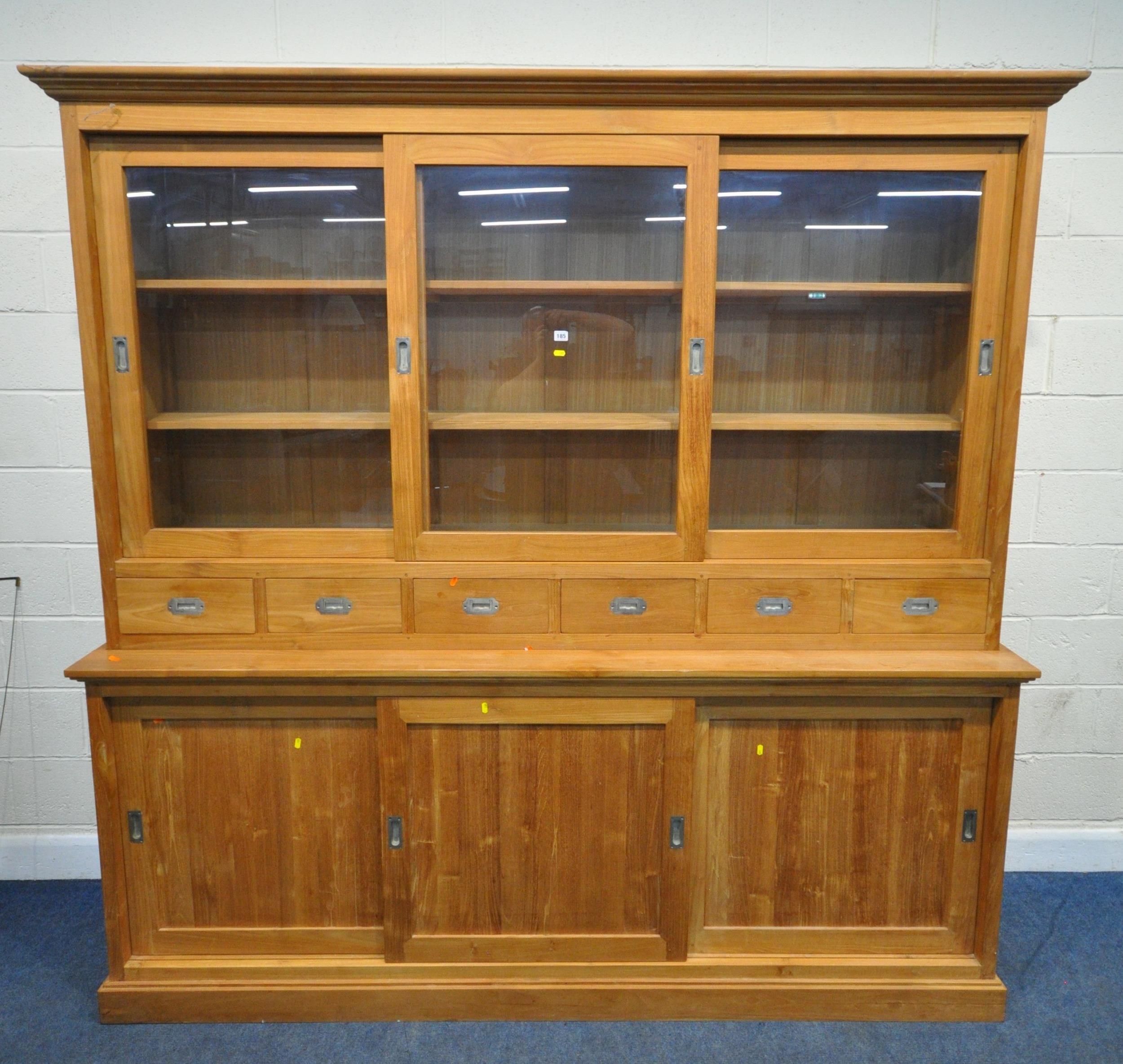 A LARGE MODERN OAK HOUSEKEEPERS CUPBOARD, fitted with triple glass sliding doors, six drawers, atop a base with triple sliding cupboard doors, length 226cm x depth 53cm x height 226cm height of base 92cm, condition report: large and heavy so ideal transport is required, the item does separate, marks, scuffs, discolouration, other signs of usage