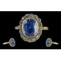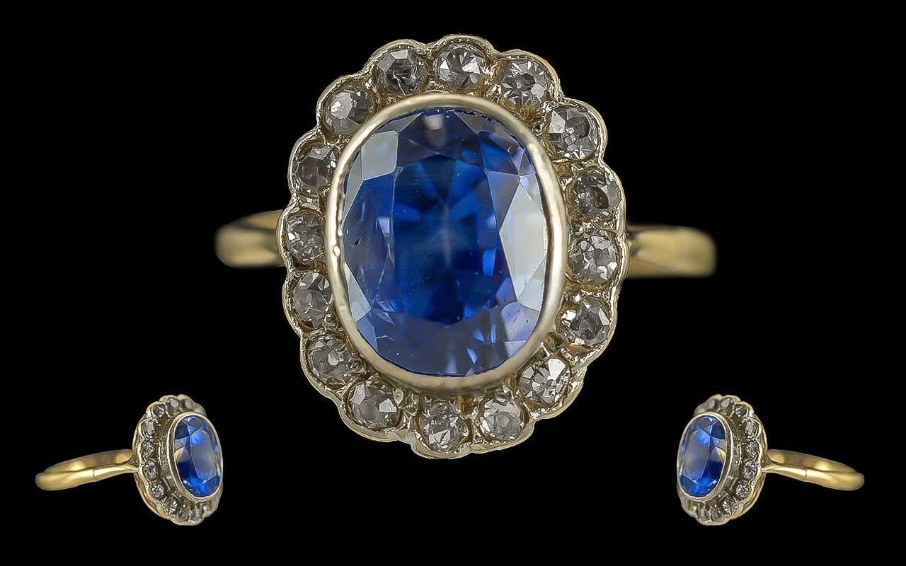 Antique Period Ladies Quality 18ct Gold Blue Sapphire and Diamond Set Cluster Ring, Marked 18ct to Interior of Shank. The Central Oval Faceted Blue Sapphire of Good Colour and Clarity. Est Weight of Sapphire 2.00 cts, Ring Size K. Weight 3.9 grams.