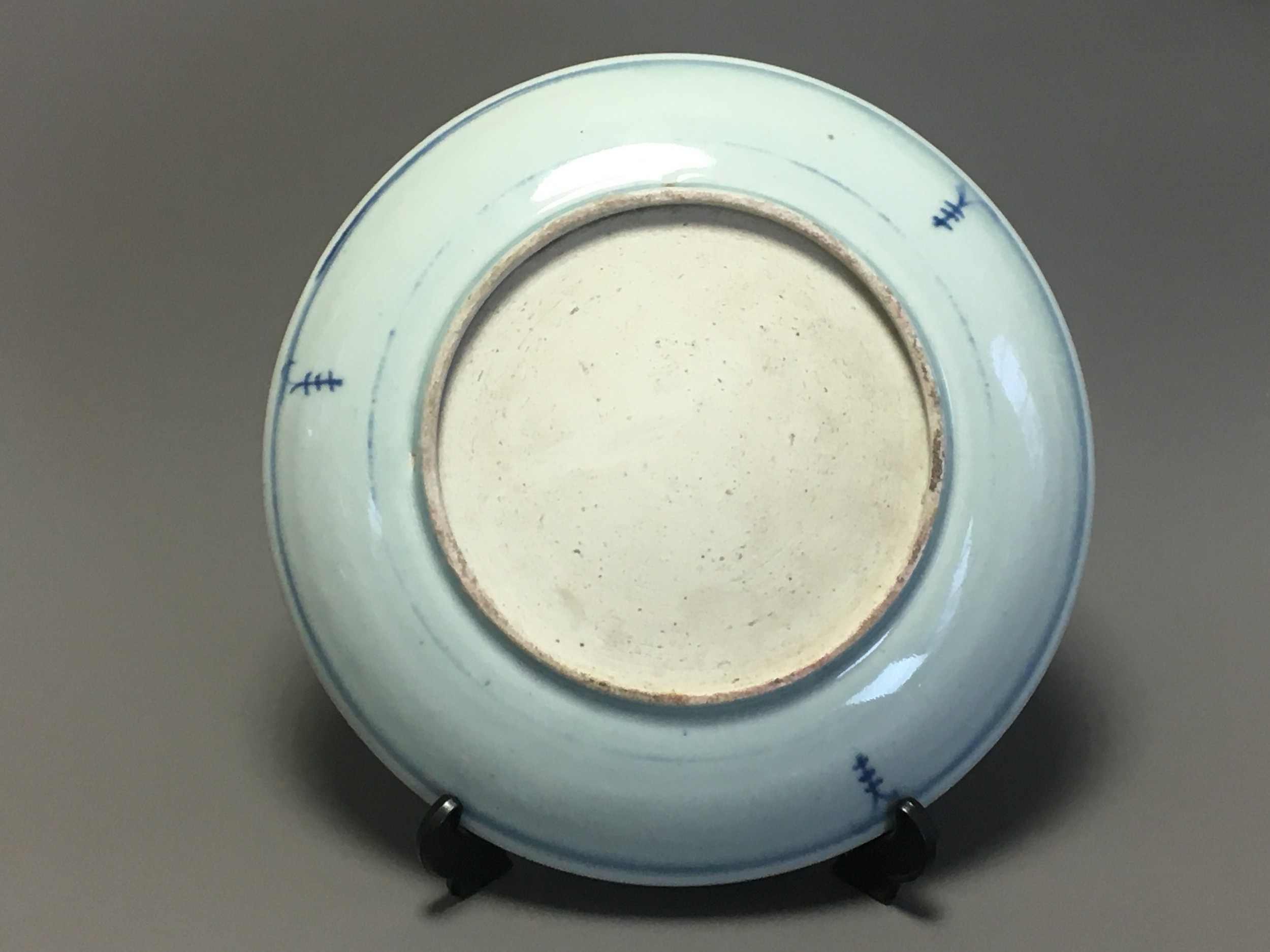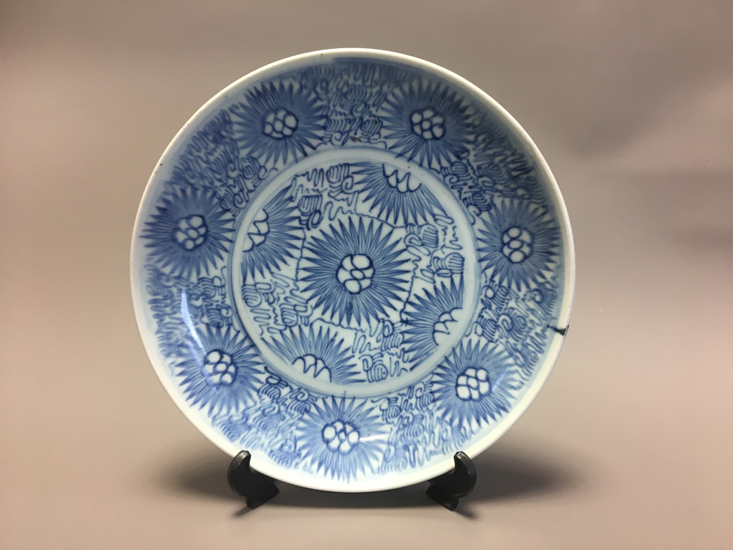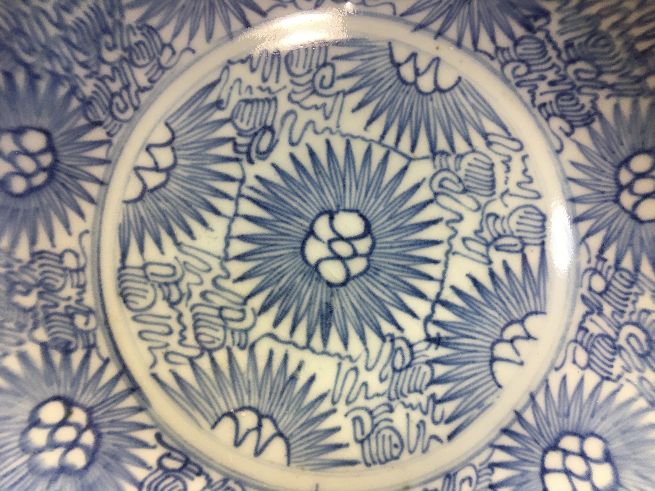 Chinese Antique Blue and White Starburst Pattern Deep dished Plate/Bowl 26.5cm Dia. Blue/White Glaze with Starburst Blue hand Decoration.
