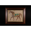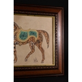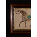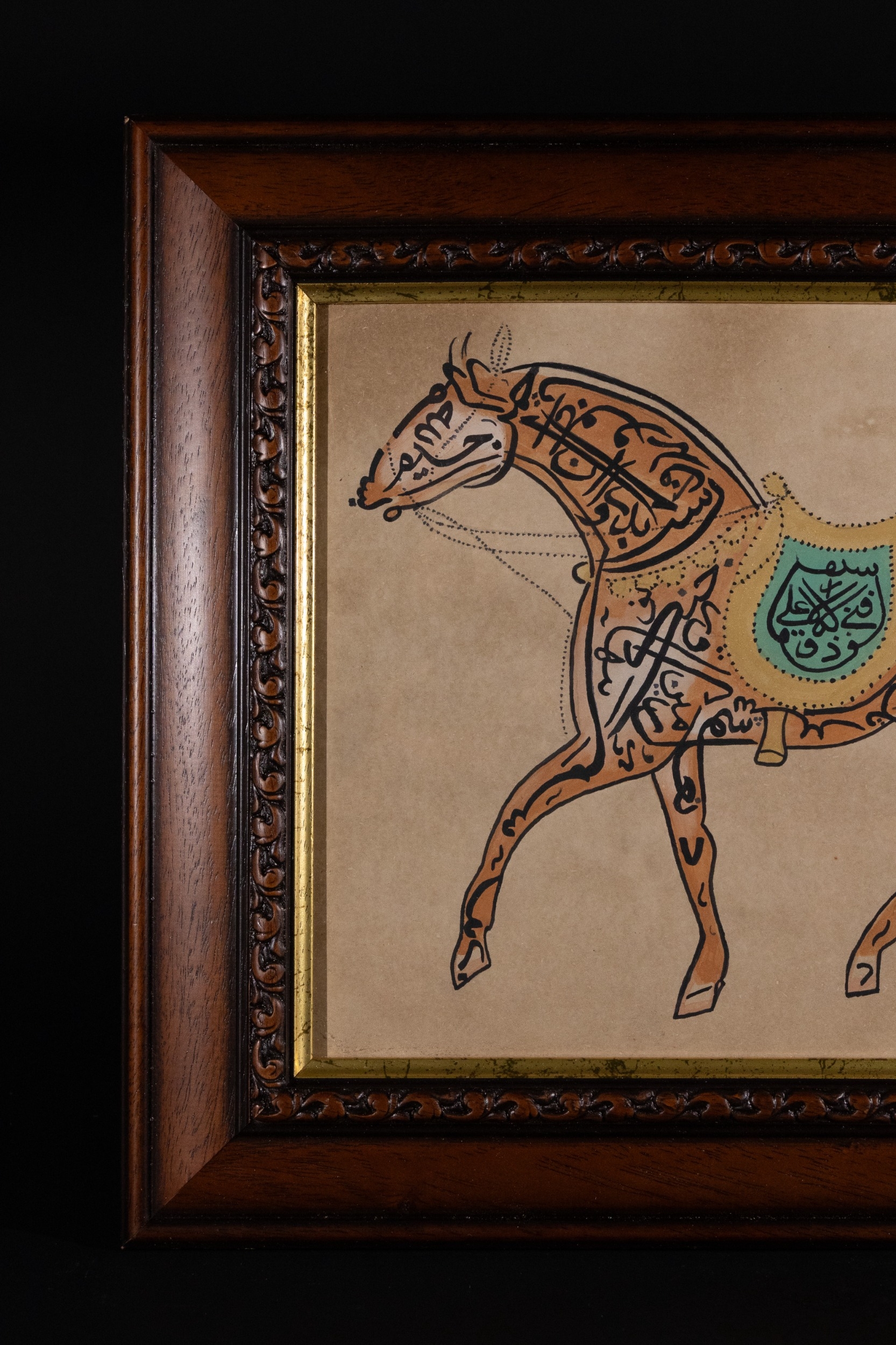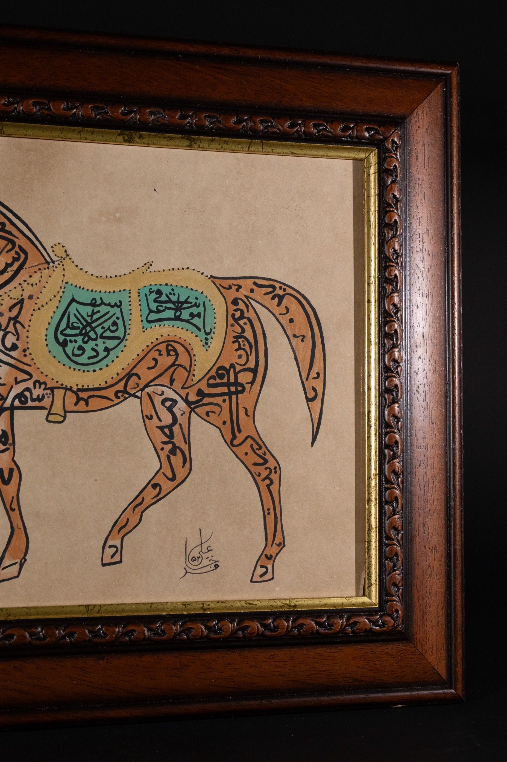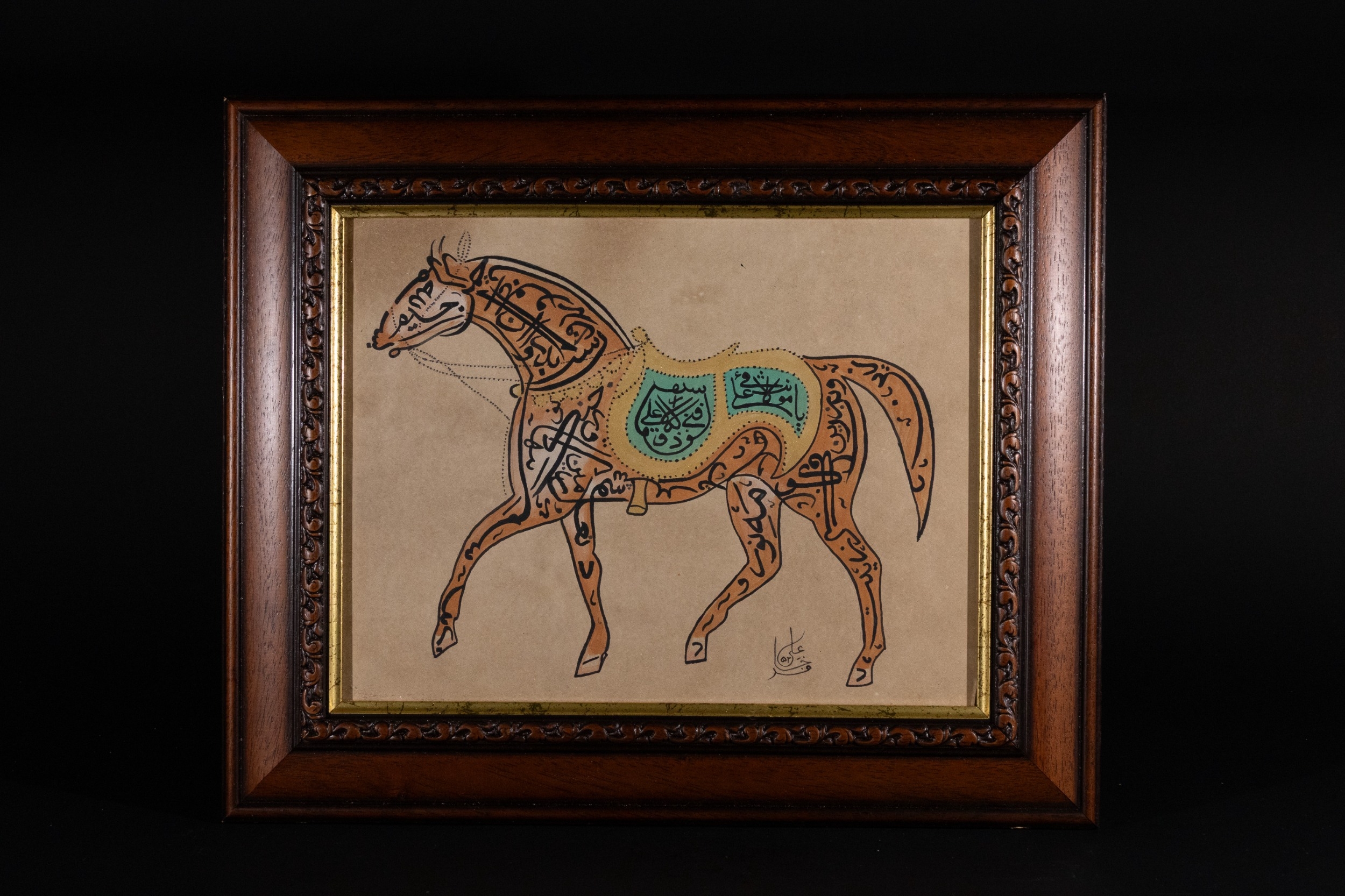 An Islamic Ottoman Zoomorphic Calligraphy of a Horse, Signed 'Ali' - An Islamic Ottoman zoomorphic calligraphy piece depicting a horse rendered entirely through stylized black Arabic script on a tan paper substrate. Sections of the horse are highlighted in pale yellow and teal green, with additional Arabic text legible within the teal saddle. An Arabic signature, appearing to read "Ali" (علي) and additional script, is visible in black ink at the bottom right.