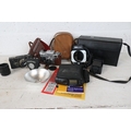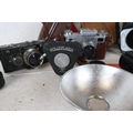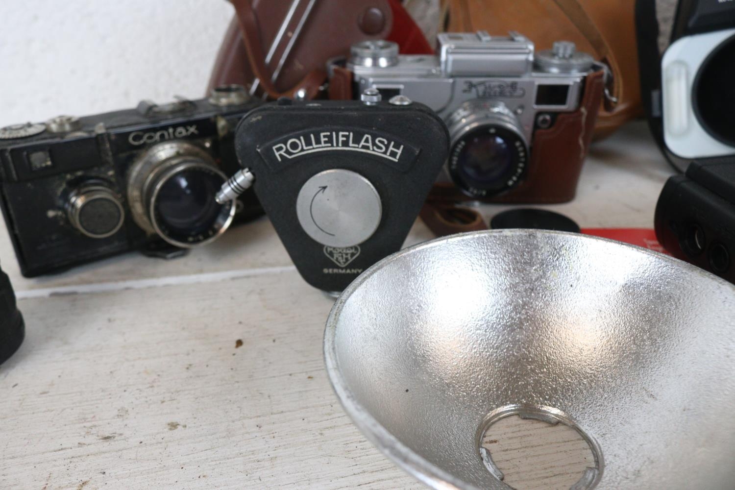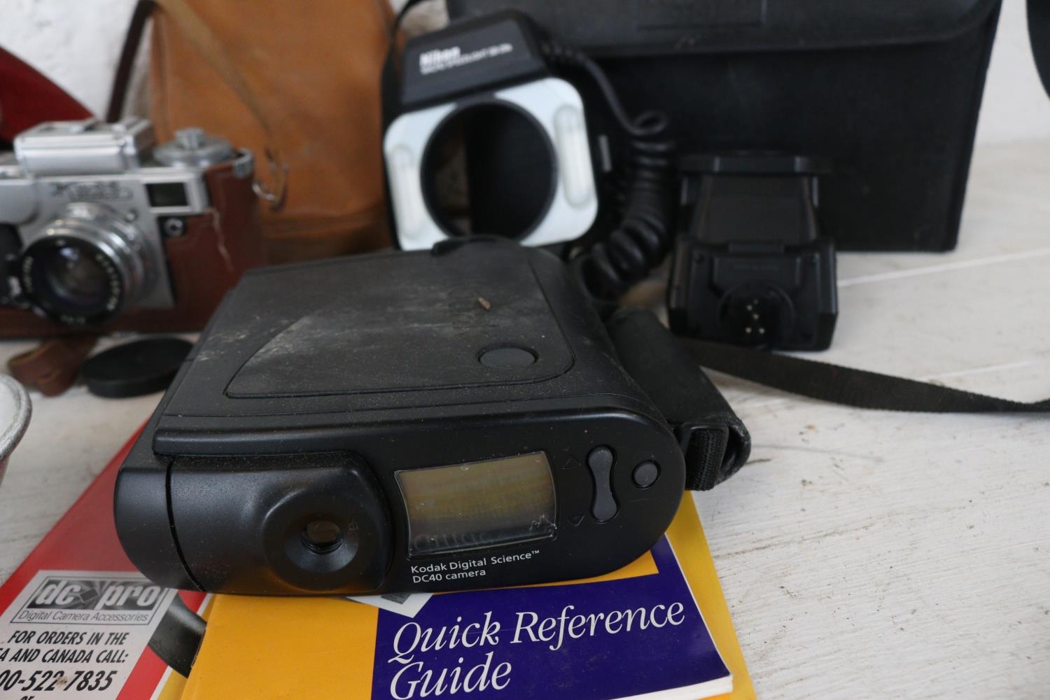A selection of cameras and equipment; Contax, RollieFlash, Kieve, A cased Nikon Macro Speedlight and an early Kodak Digital Science DC40 camera. carton not included