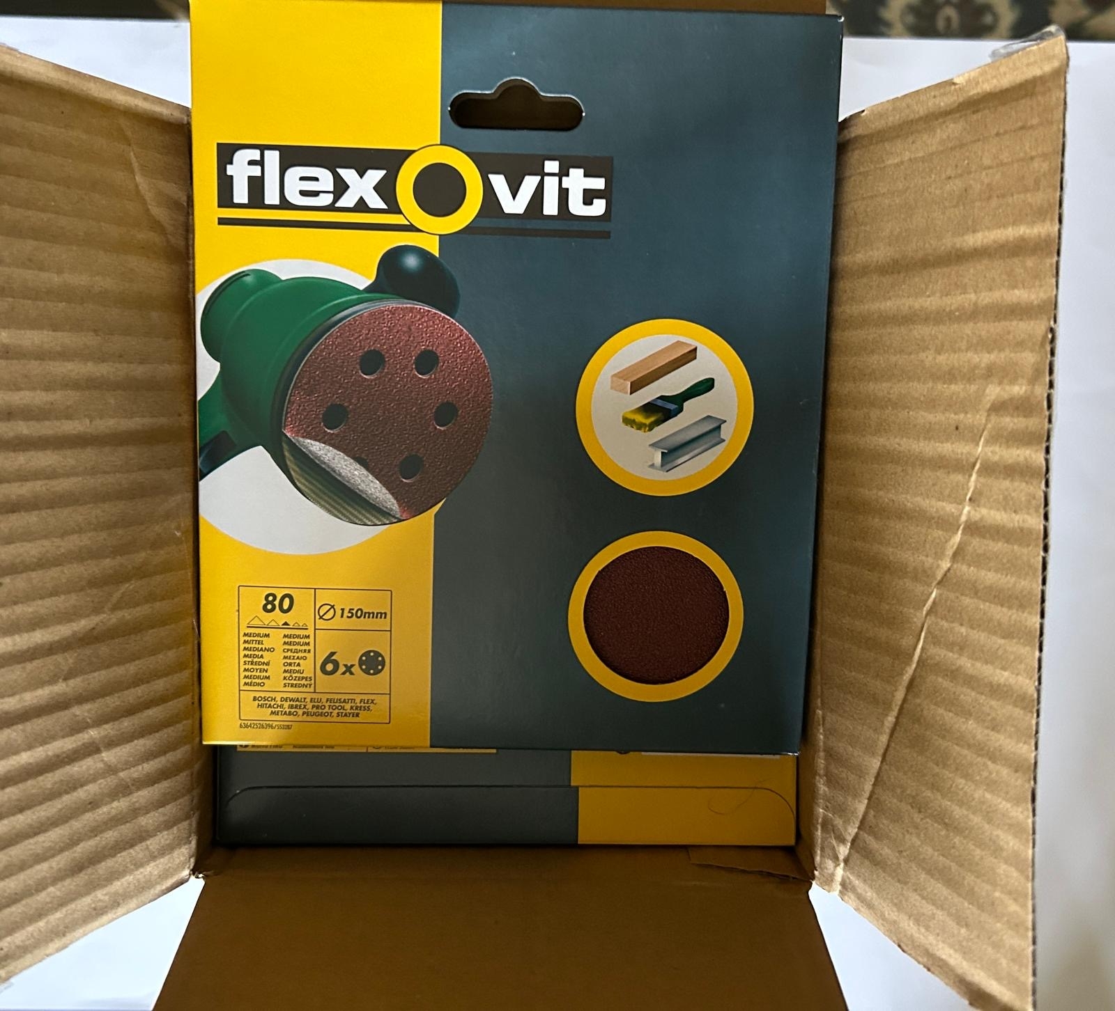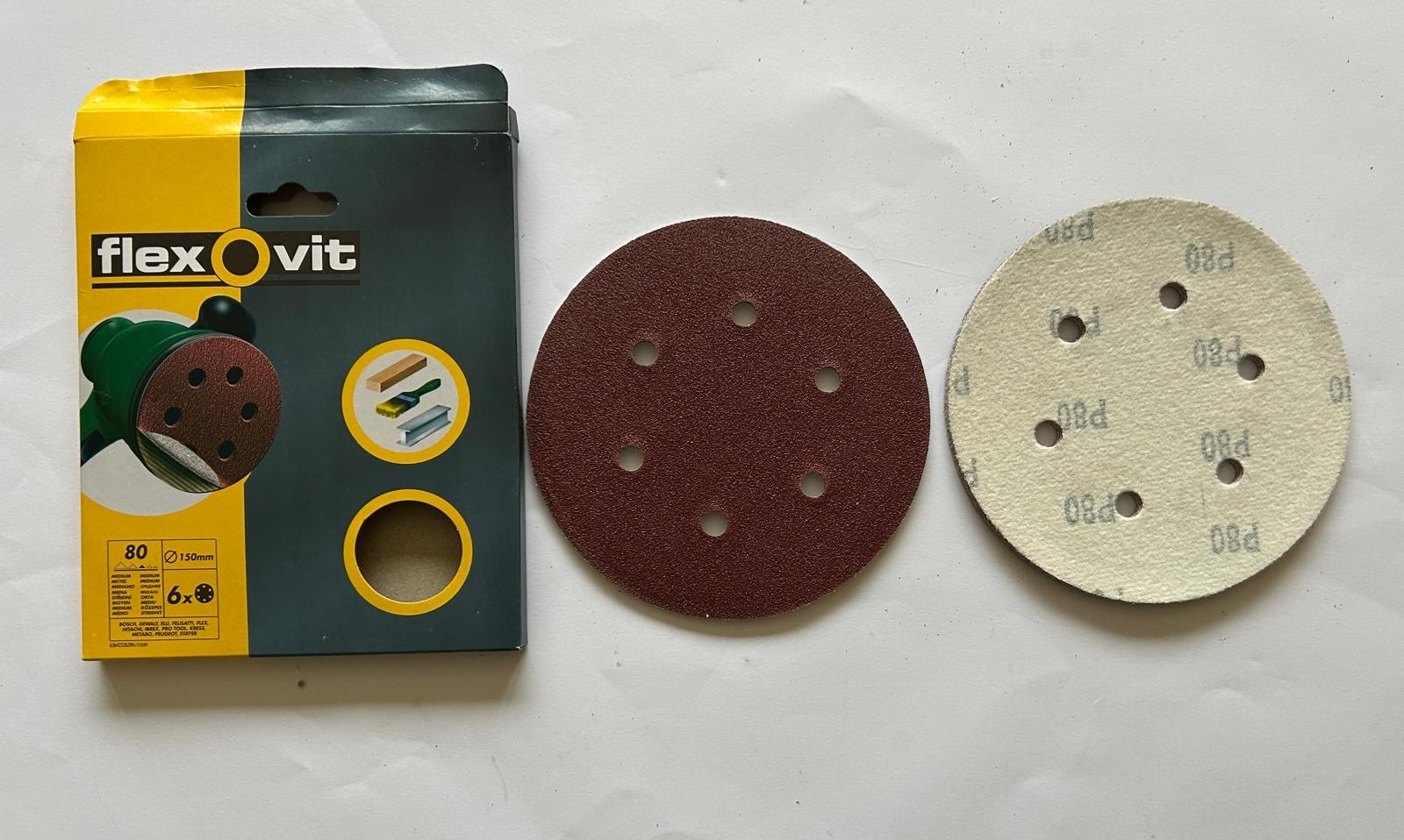 1 box of 80 grit orbital ventilated sanding discs. Diameter 150mm. The box contains 20 packs and each pack contains 6 disks.