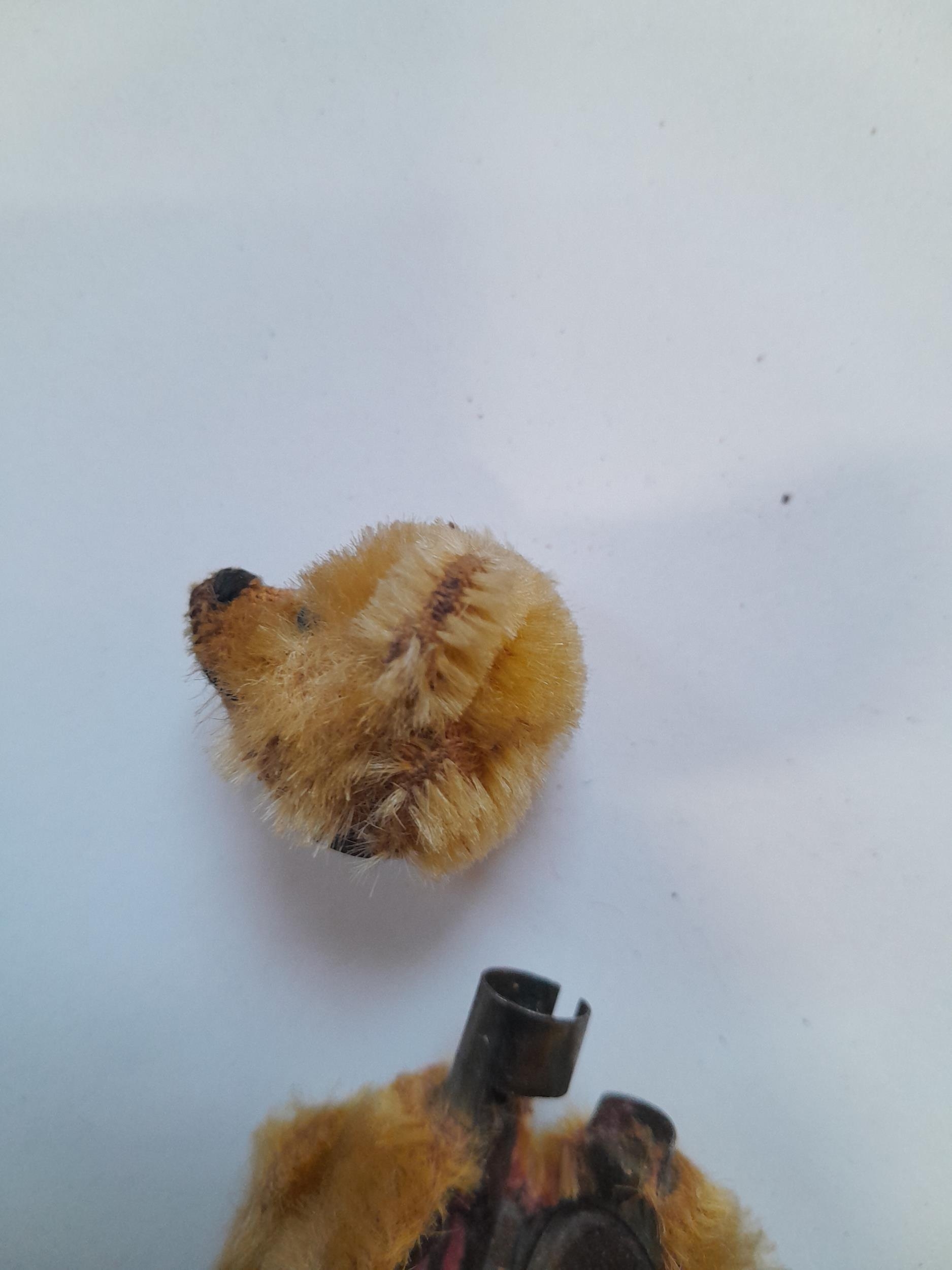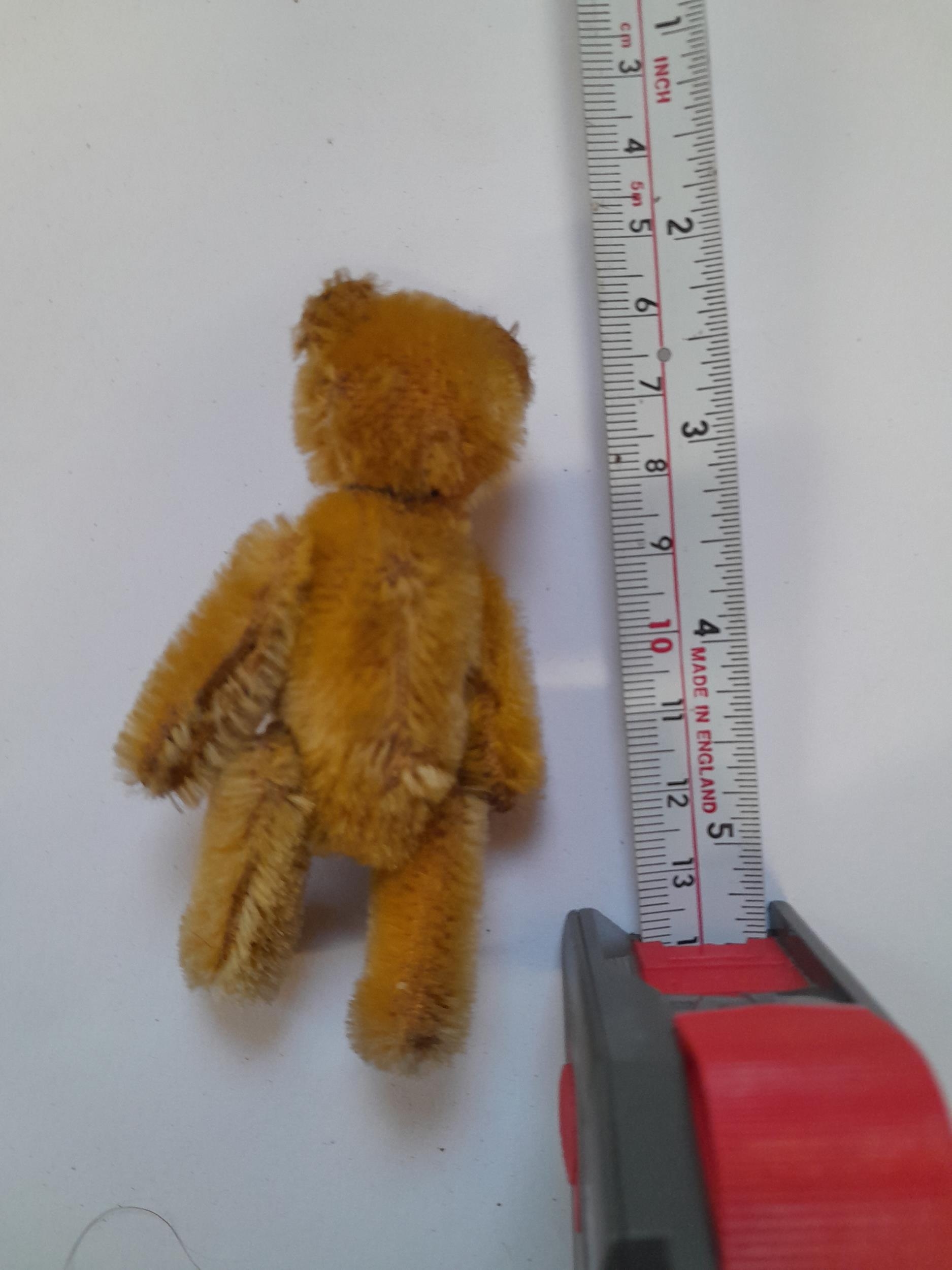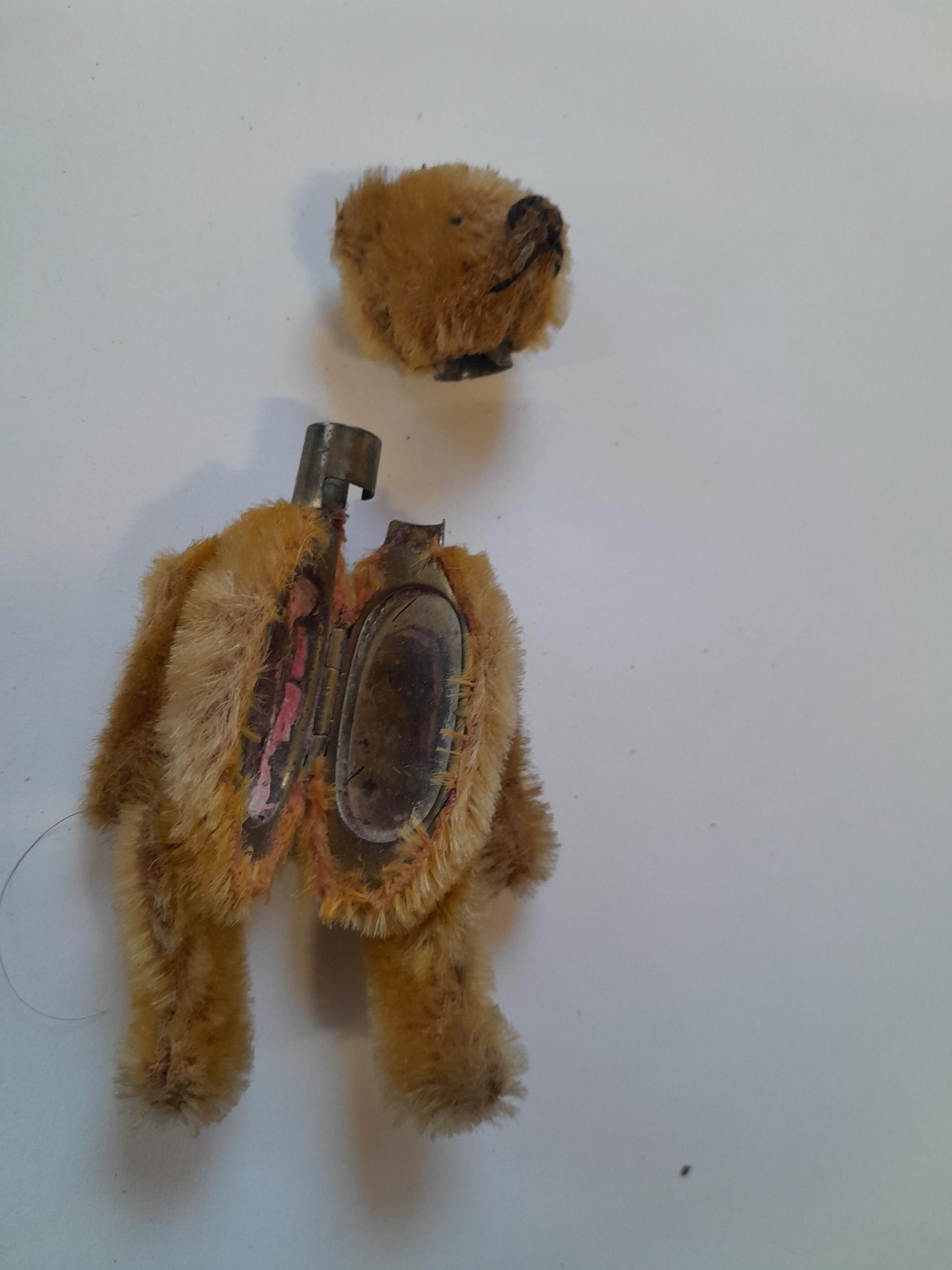 Shuco powder compact teddy bear with articulated arms and legs, lift off head and opening body with compact and mirror inside and section for powder