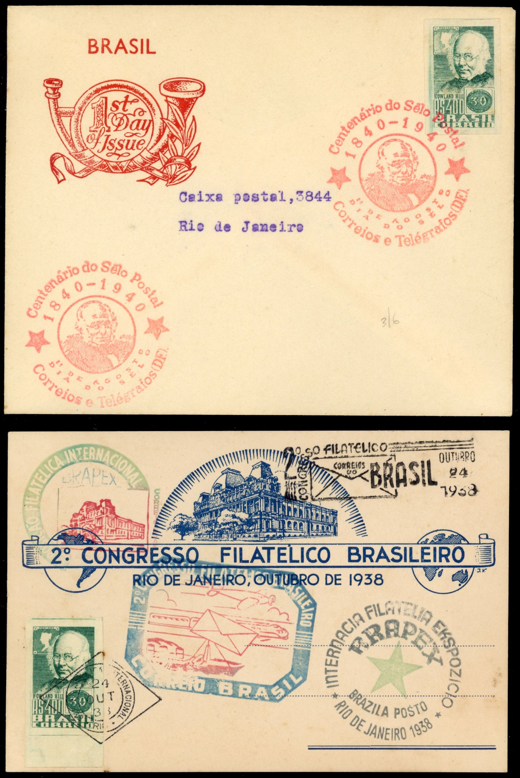 1938 International Philatelic Exhibition 400r Rowland Hill miniature sheet large part o.g. and used plus two first day covers from exhibition, a printed card and a toned cover with red handstamps