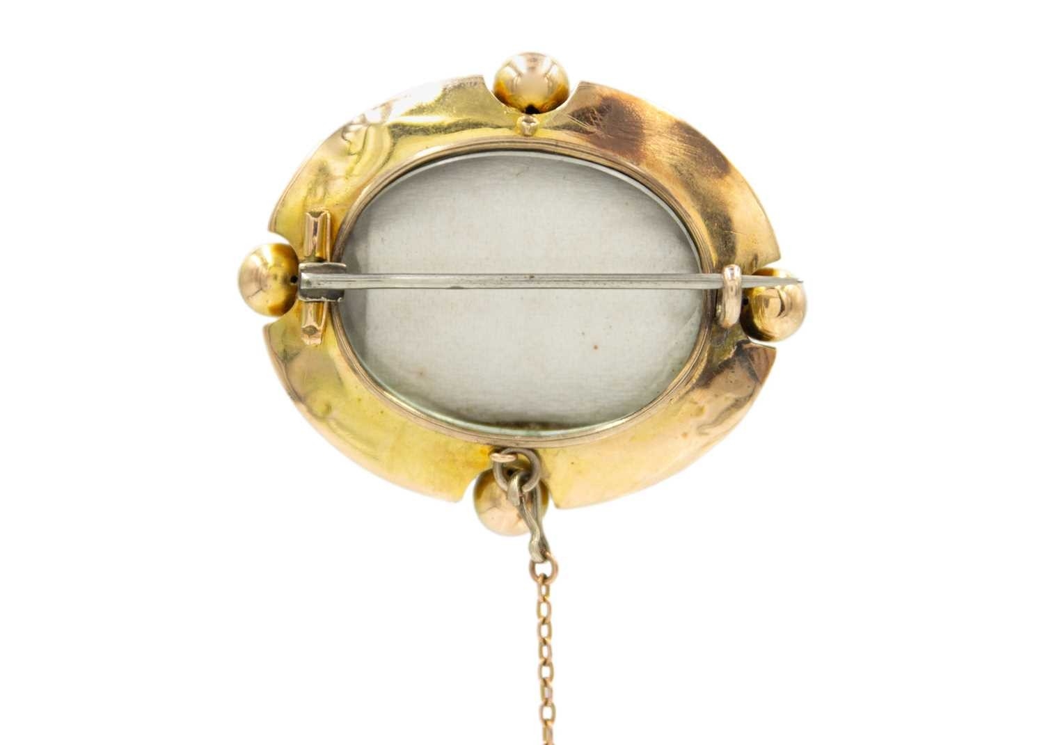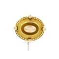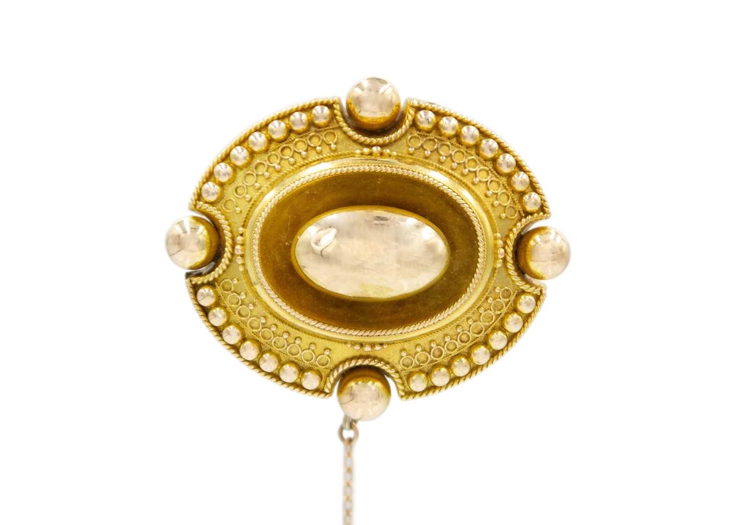 A Victorian Etruscan revival high-purity gold brooch. The brooch has a locket back and a safety chain, fitted with a base metal pin, 4.5cm x 3.8cm, total weight 13.44g.