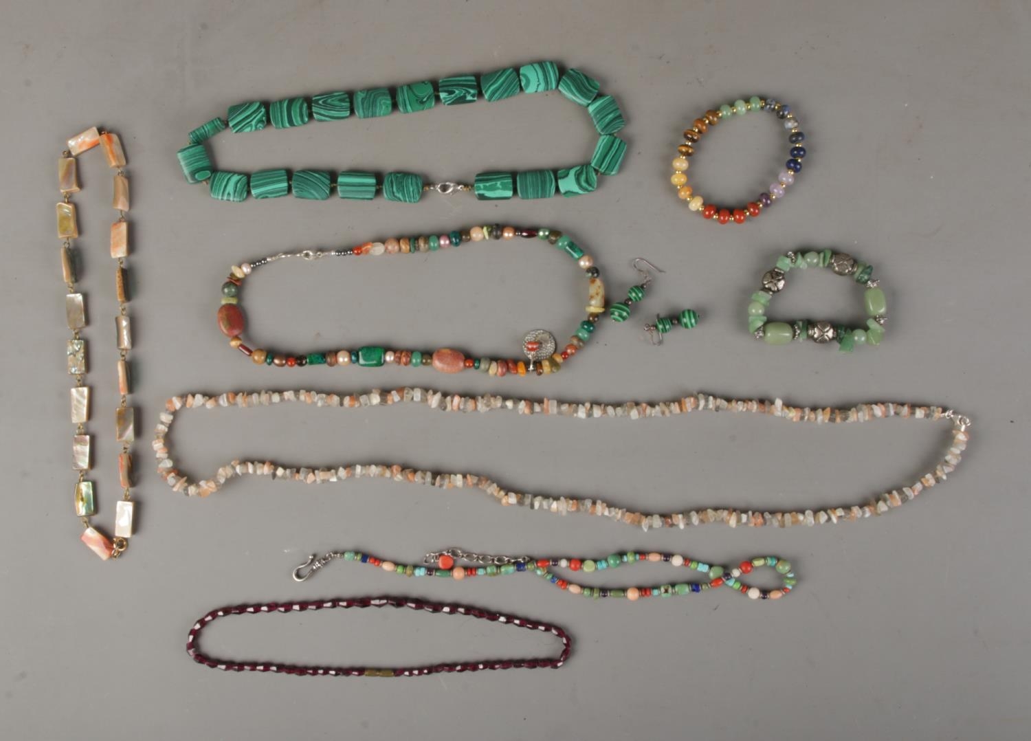 A collection of gemstone jewellery to include pair of silver drop earrings, silver clasped necklaces, bracelets, etc.