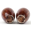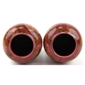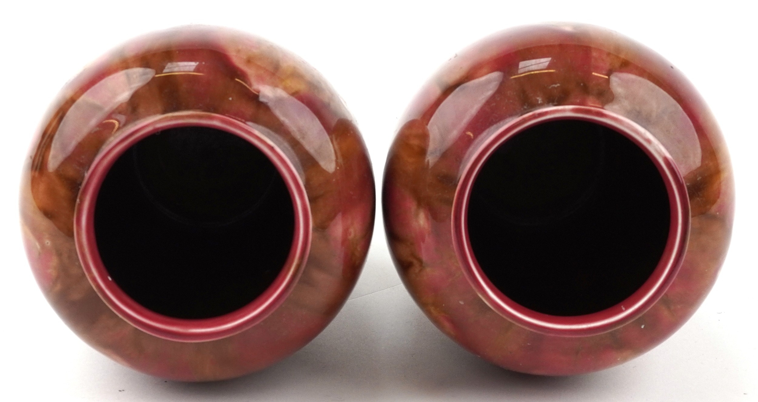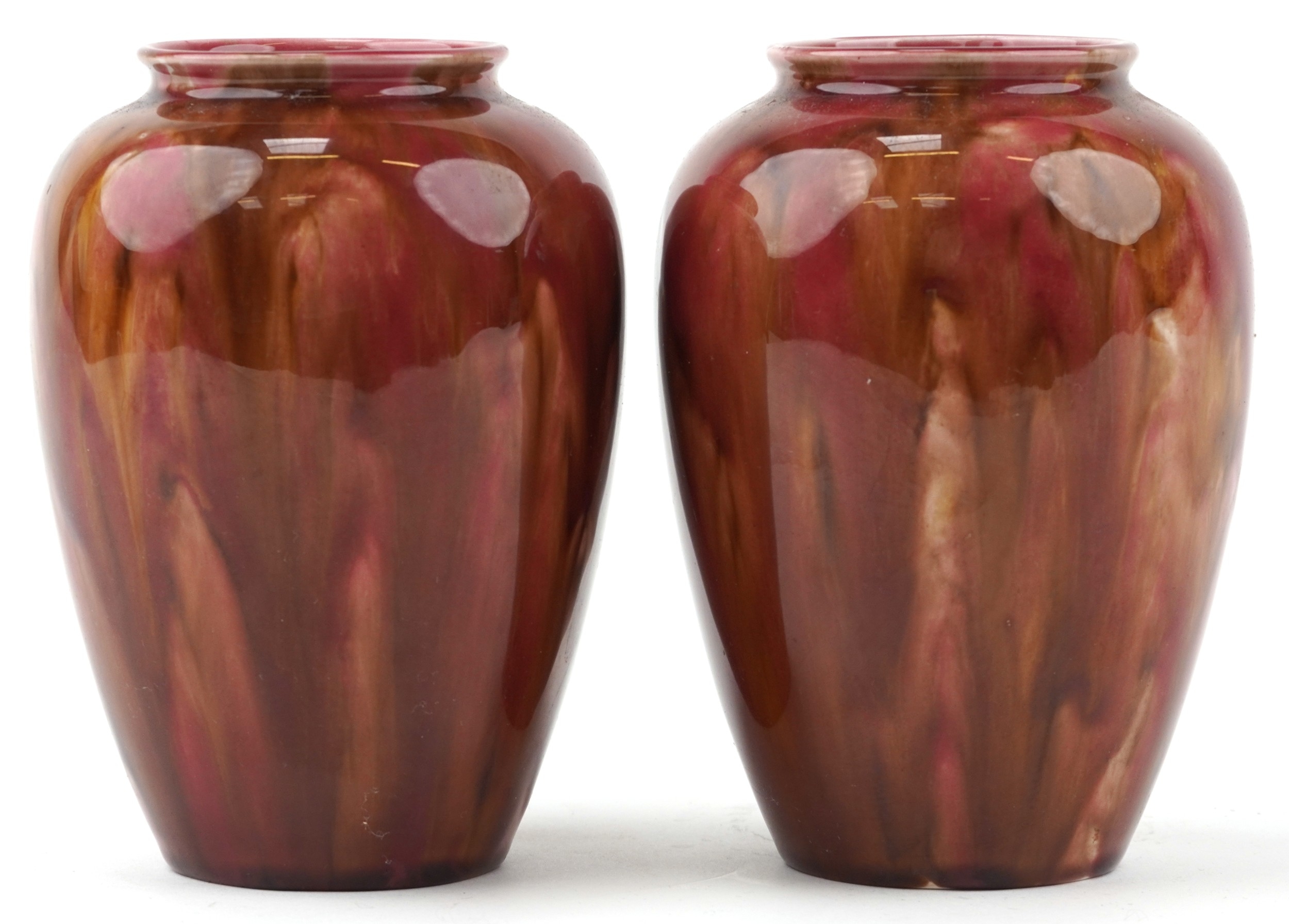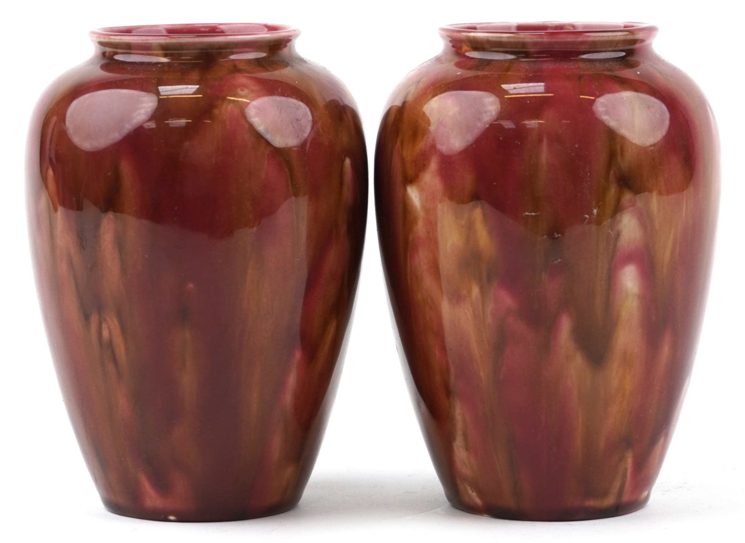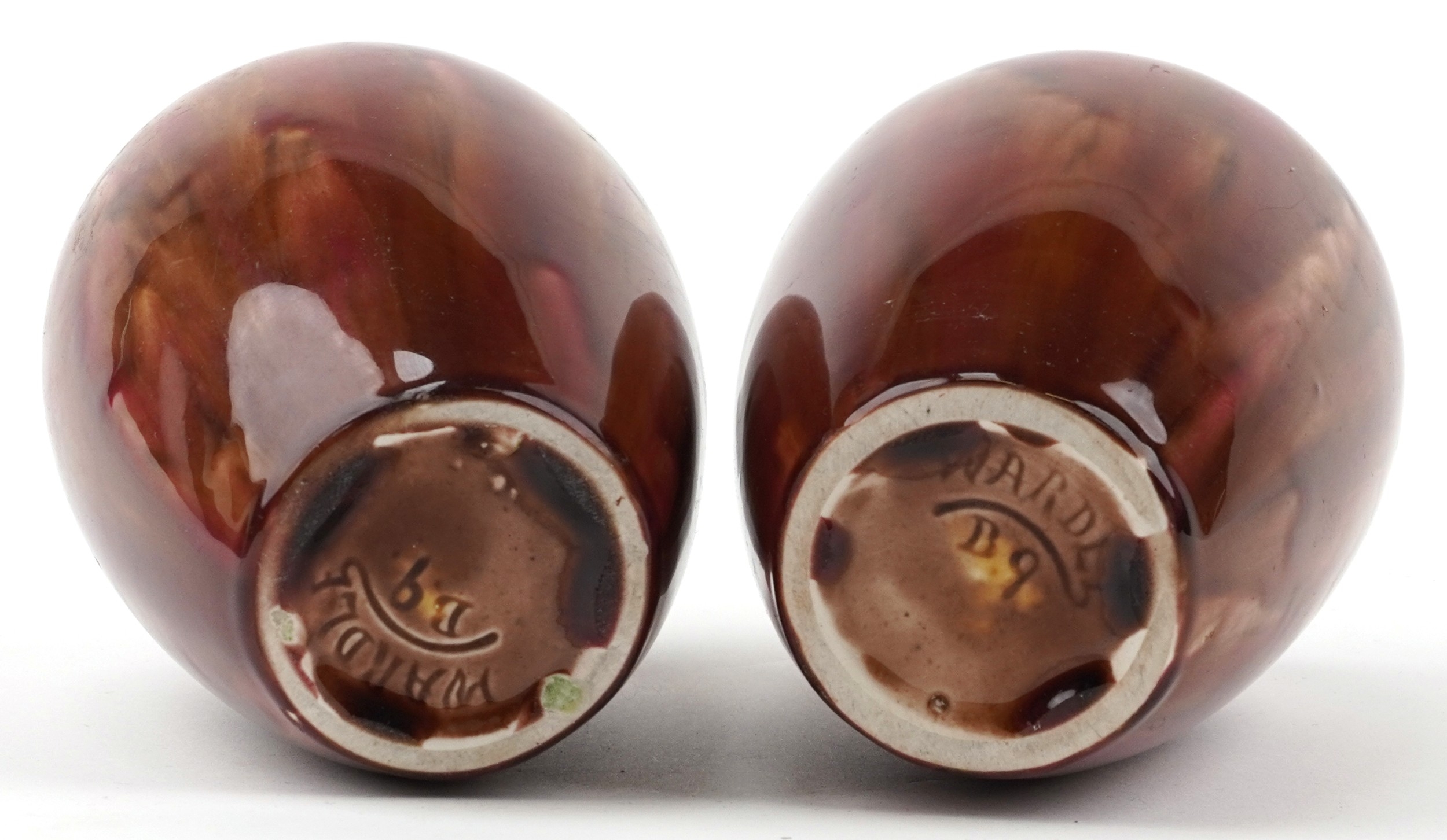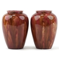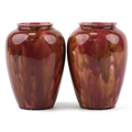 A pair of early 20th century Wardle pottery vases, each with a red and pink abstract glaze, bearing impressed marks to the base, 15cm high.