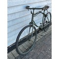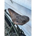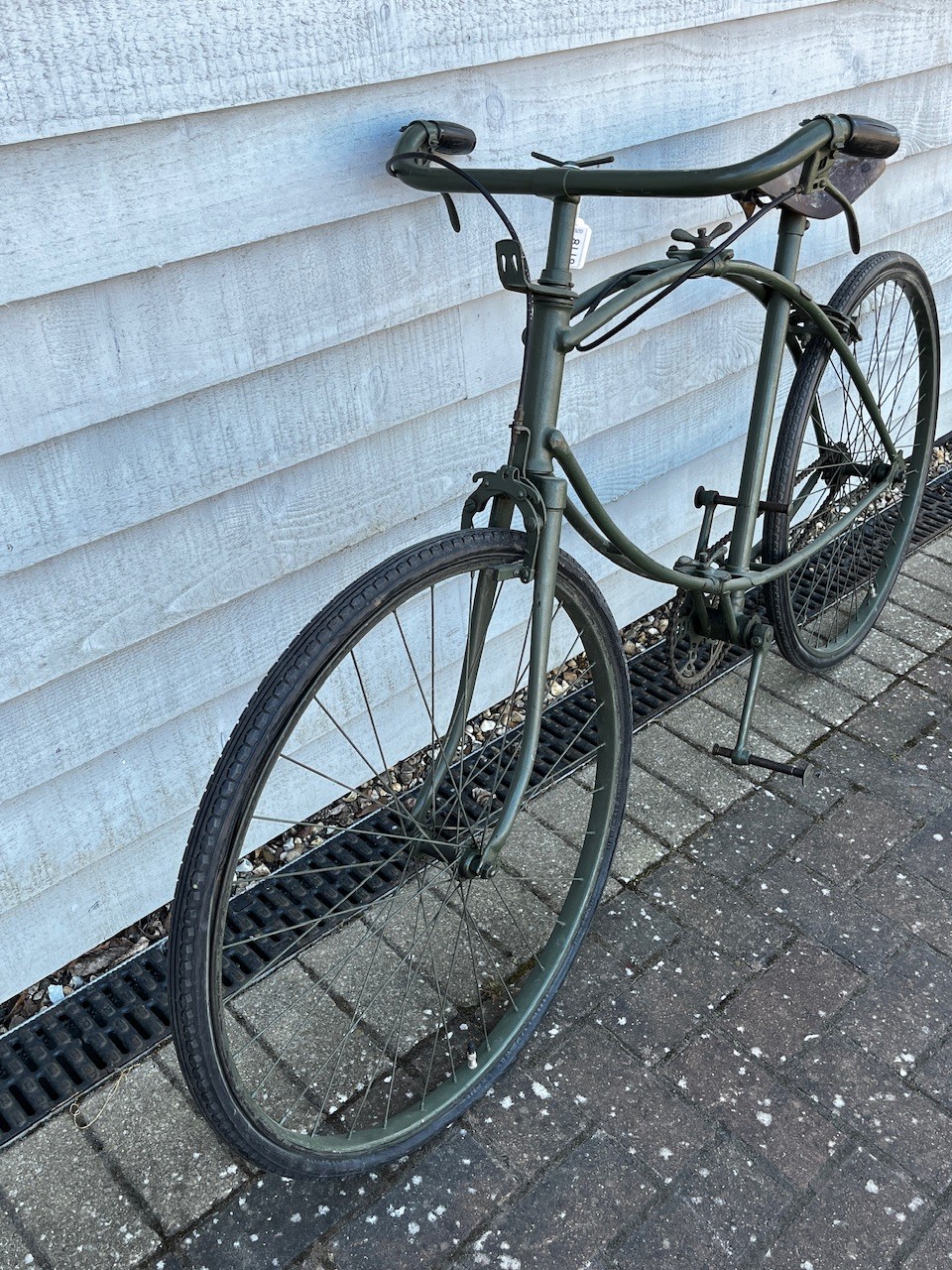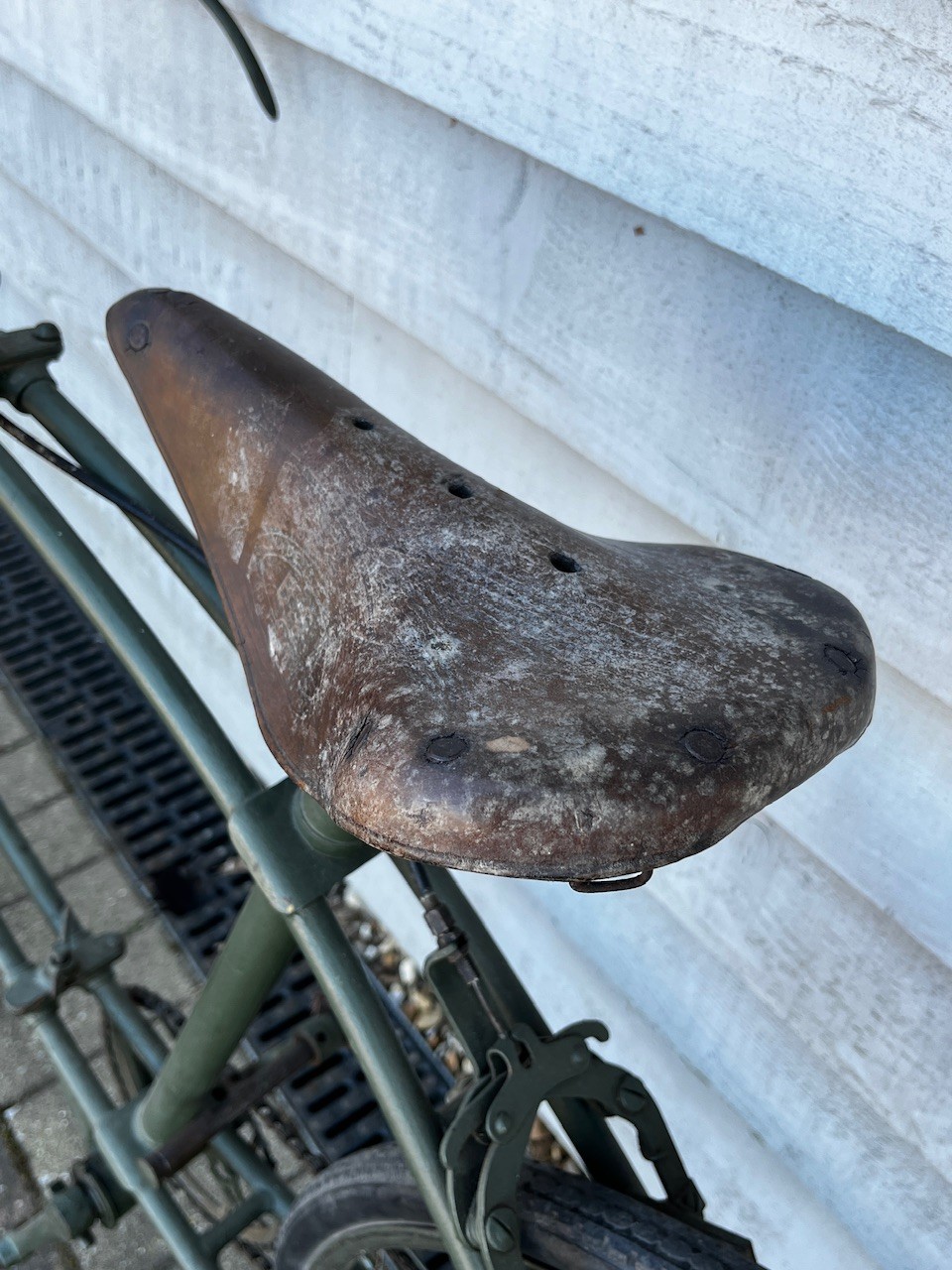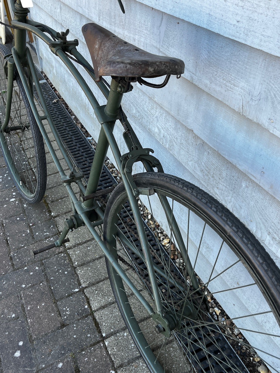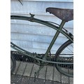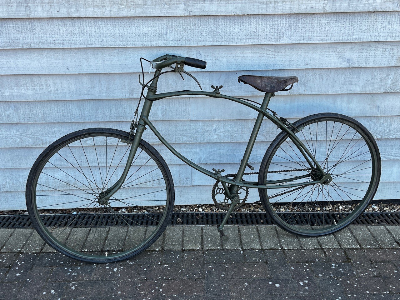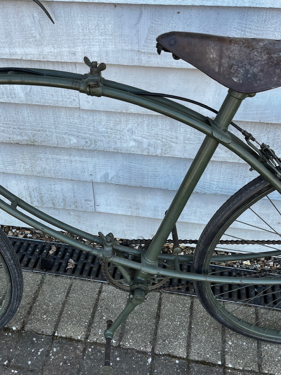 A BSA folding paratrooper / airborne forces bicycle, green painted frame with brown leather saddle. These bikes were famously issued to the British Airborne Forces who parachuted into Normandy on D-Day and Arnhem in 1944. They were issued as a way for troops to quickly cover large areas of ground in a quiet manner behind enemy lines. Unfortunately many deemed them to be too cumbersome and were abandoned after landing. They were held out in-front of the paratroopers when they parachuted in. Serial number appears to be R47334
