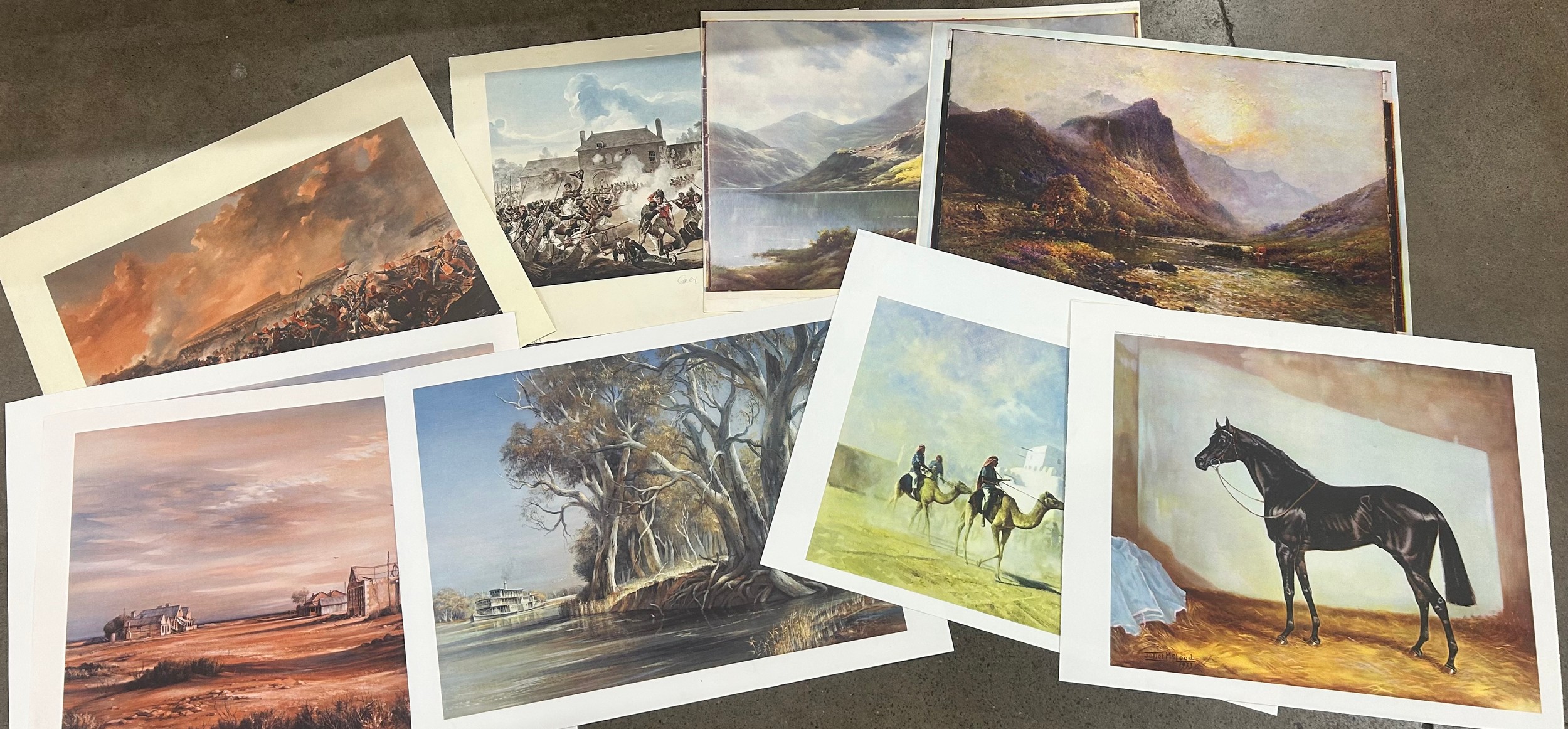 Nine large colour lithographic prints from the late 1970s, include military, topographical views, race horse, etc., printed on heavy duty paper