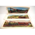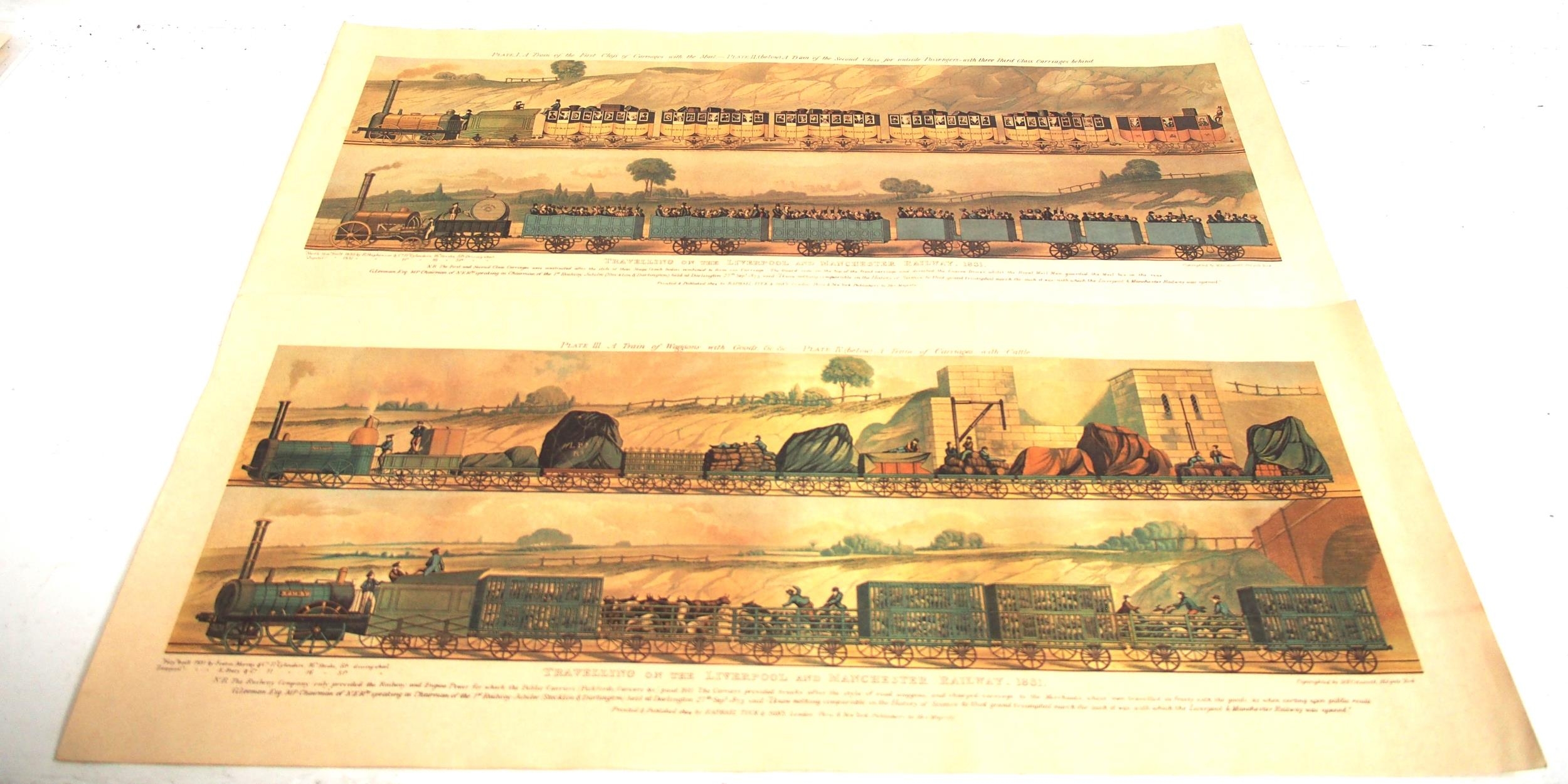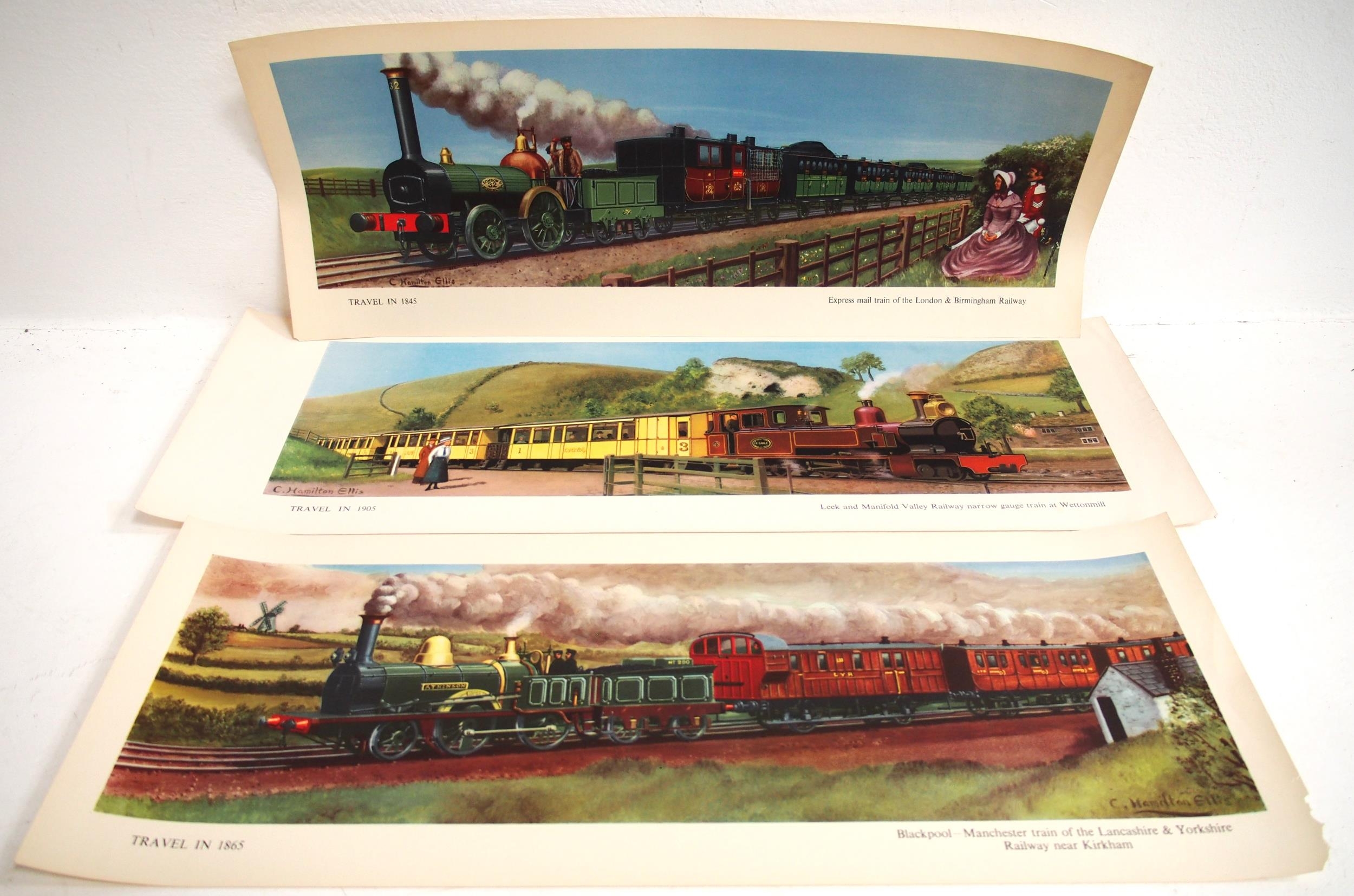 BR (LMR) unframed carriage prints - "Travel in 1845 London & Birmingham Rly" (good), "Travel in 1865 L&Y Rly" (loss bottom R/H), "Travel 1905 Leek & Manifold Rly" (good) all by C Hamilton-Ellis, "Travelling in 1831 Liverpool & Manchester Rly" x2 (mottled). (5) (B3) (Dispatch by Mailboxes/Collect from Banbury Depot)