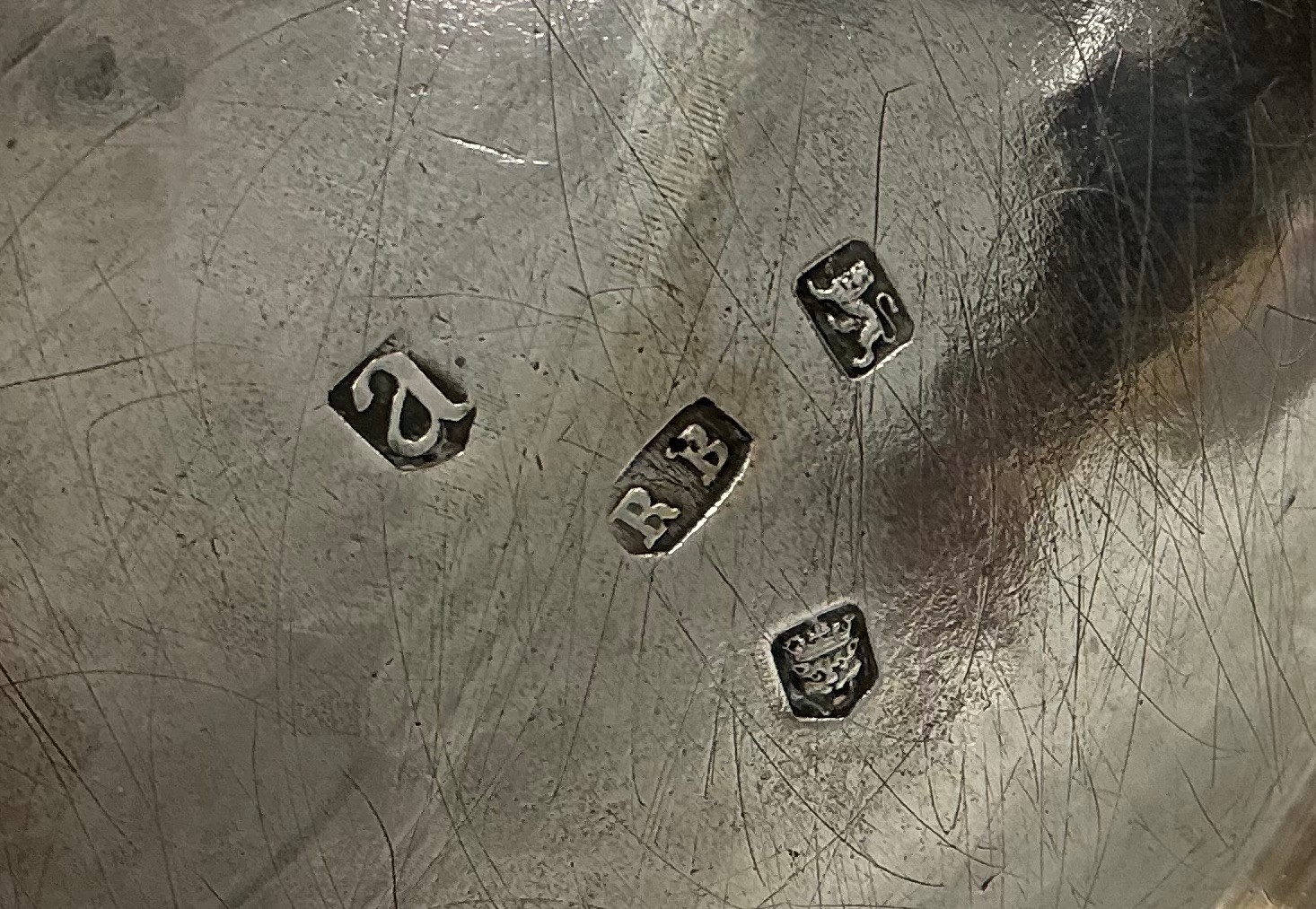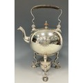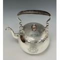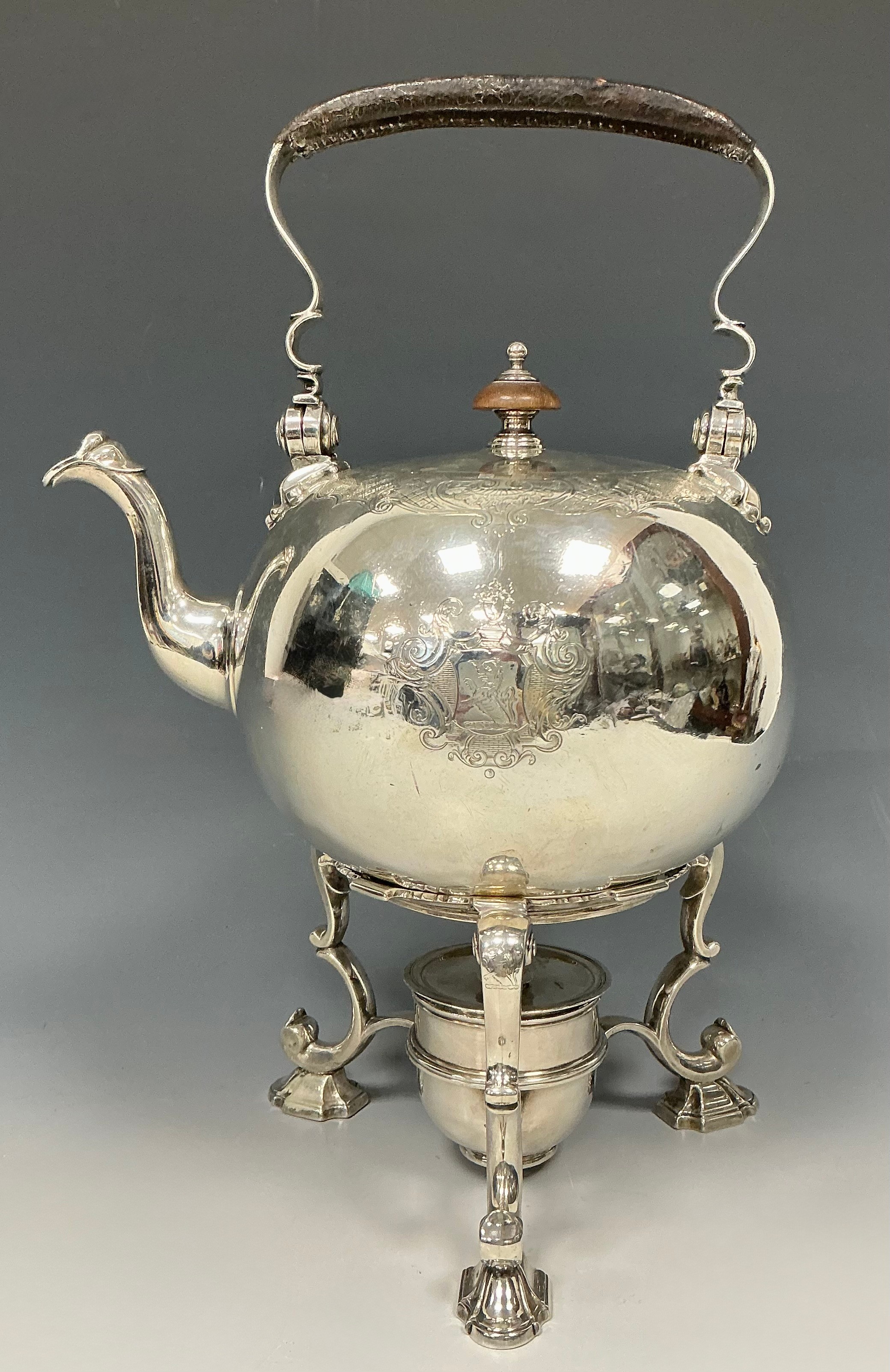A George II silver compressed globular tea kettle on stand, flush-hinged cover within an engraved Rococo border, scroll feet, 38cm high over raised handle, Richard Bayley, London 1736, 2376g