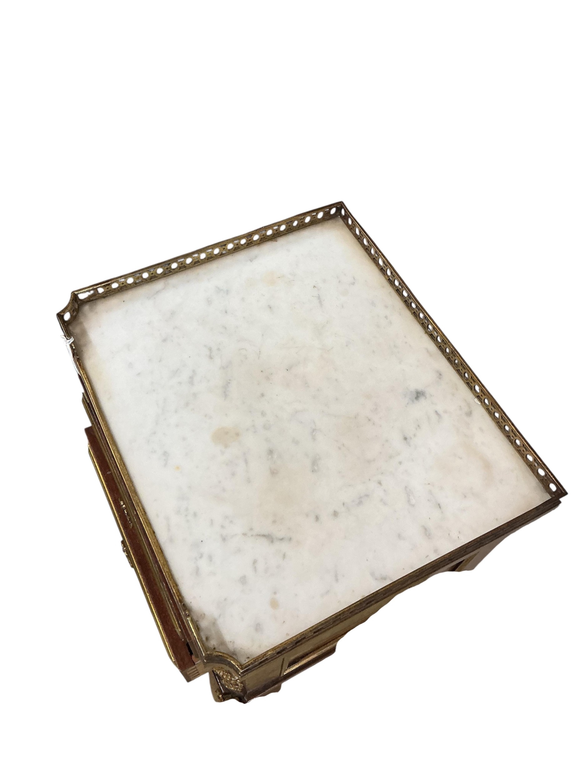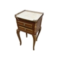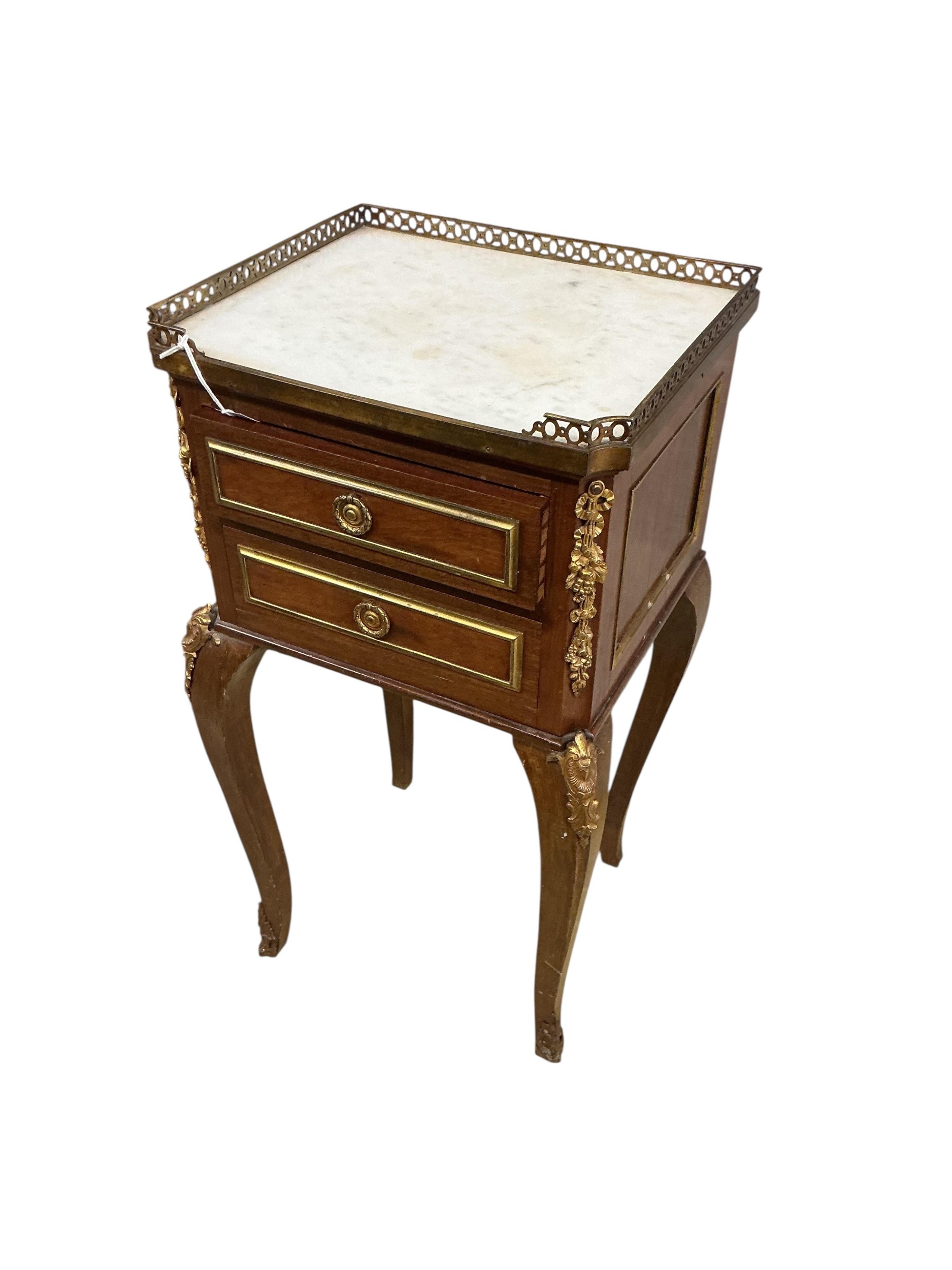 An early 20th century French gilt metal mounted marble topped mahogany bedside chest, width 37cm, depth 32cm, height 74cm