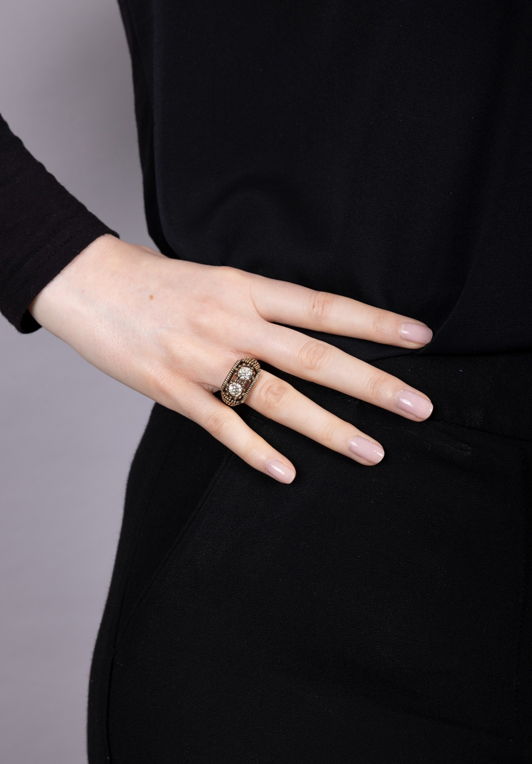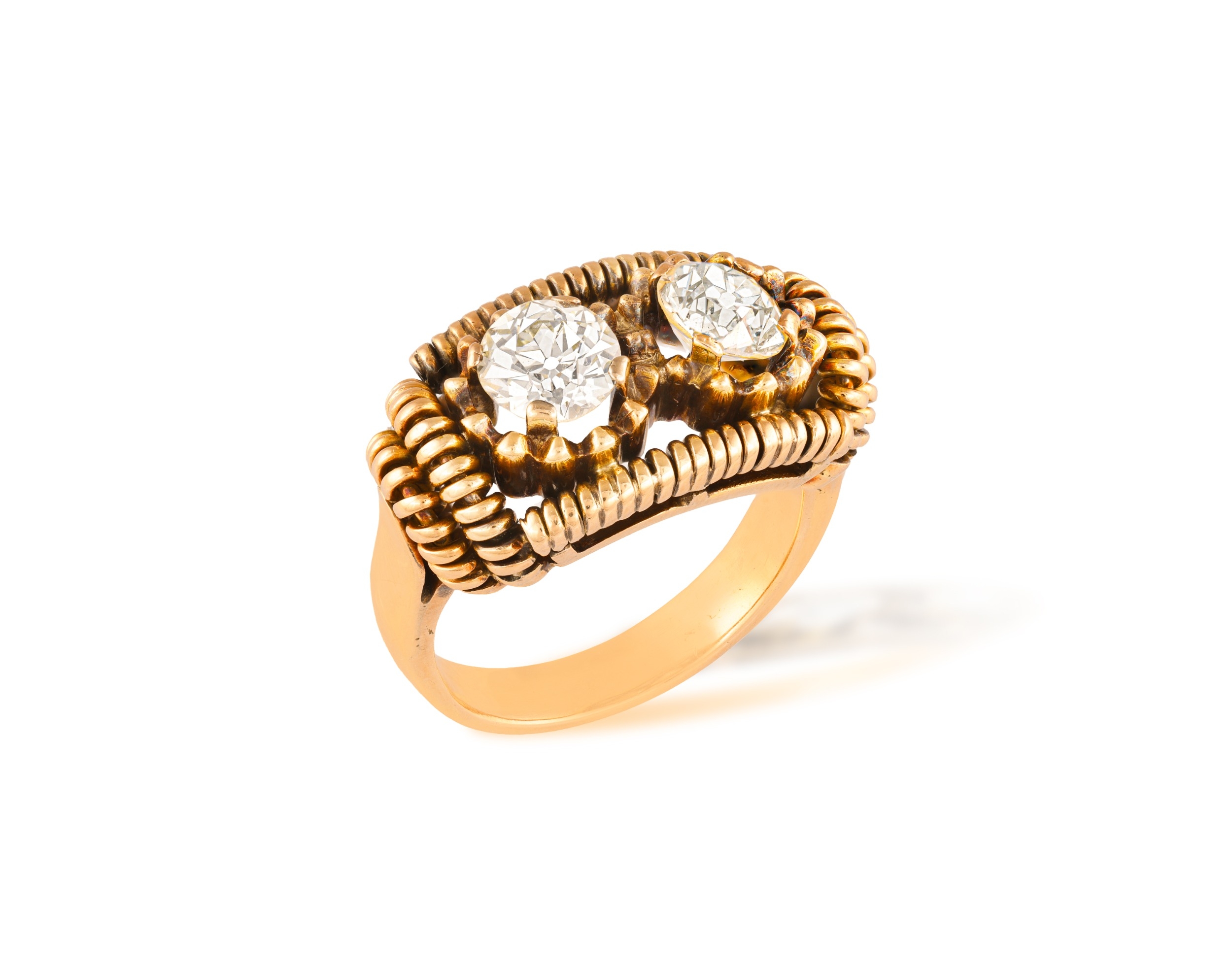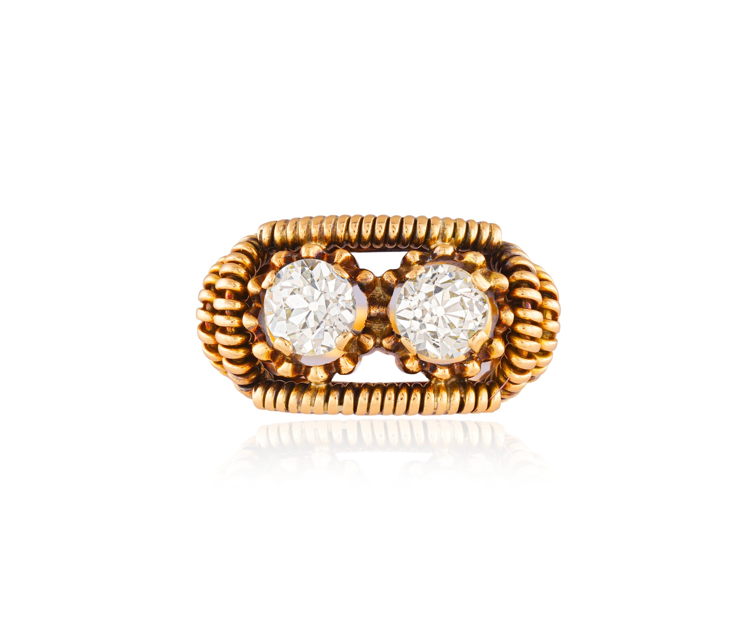 A RETRO DIAMOND TWO-STONE RING, CIRCA 1950 Composed of two old-brilliant-cut diamonds within claw-setting, within a ropetwist and coiled wirework mount, to a plane polished hoop, mounted in 18K gold, diamonds approximately 1.60cts total, ring size N