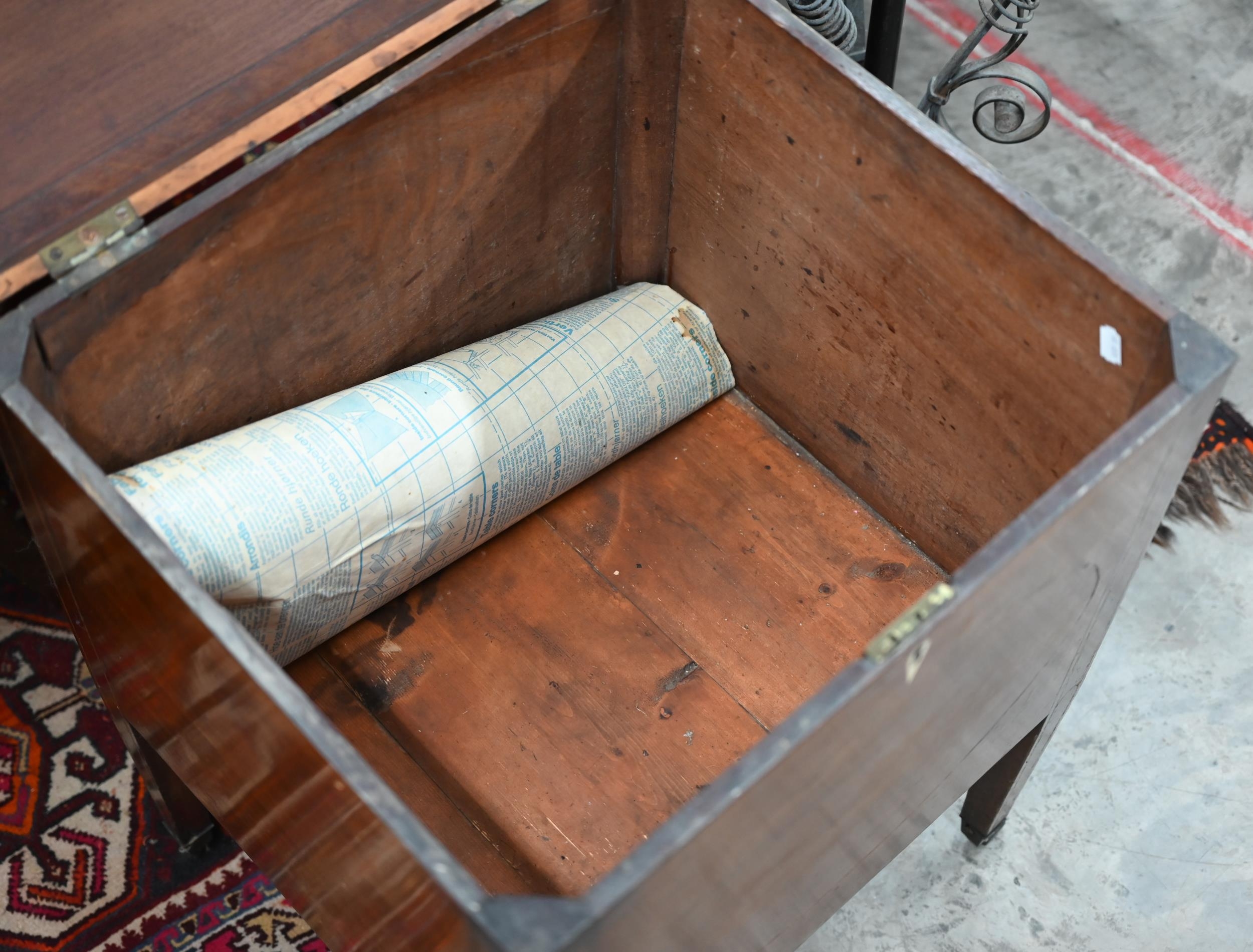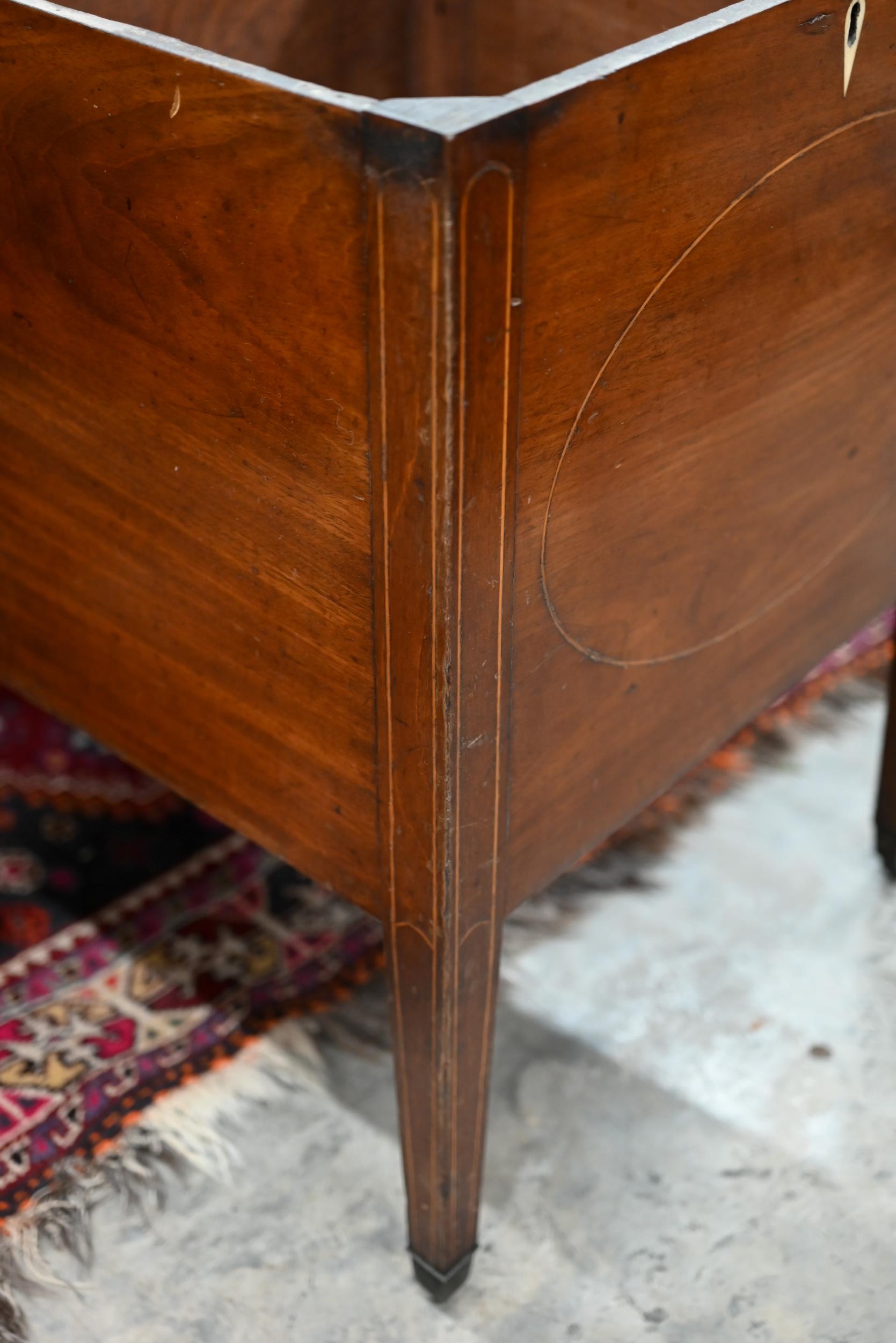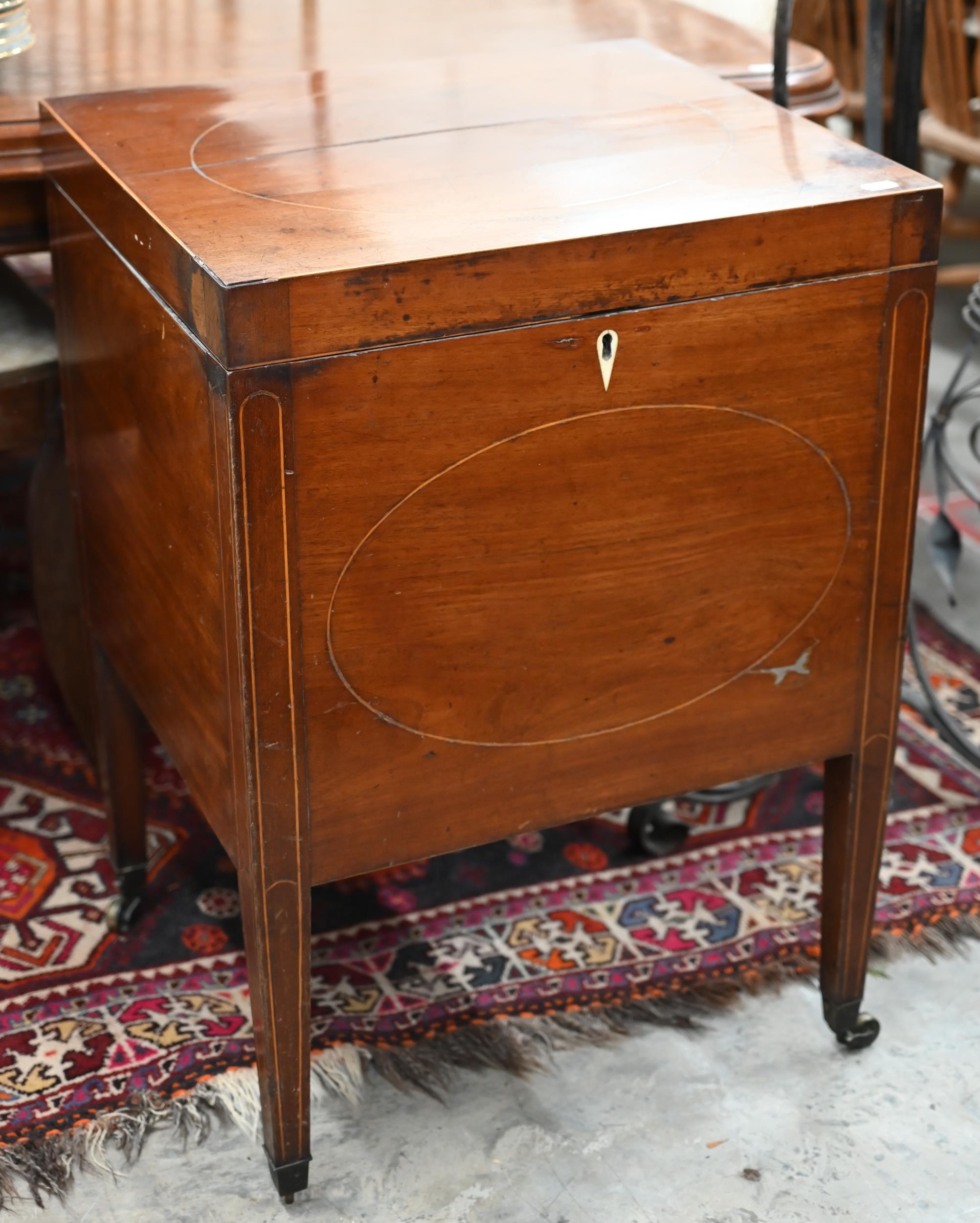 #A 19th century mahogany and boxwood strung cellarette on square tapering supports with brass casters (one missing) 50 cm w x 45 cm d x 72 cm h