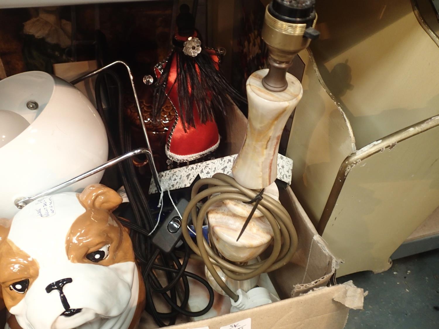 Box of mixed items including onyx table lamps etc and a magazine rack. Not available for in-house P&P, contact Paul O'Hea at Mailboxes on 01925 659133