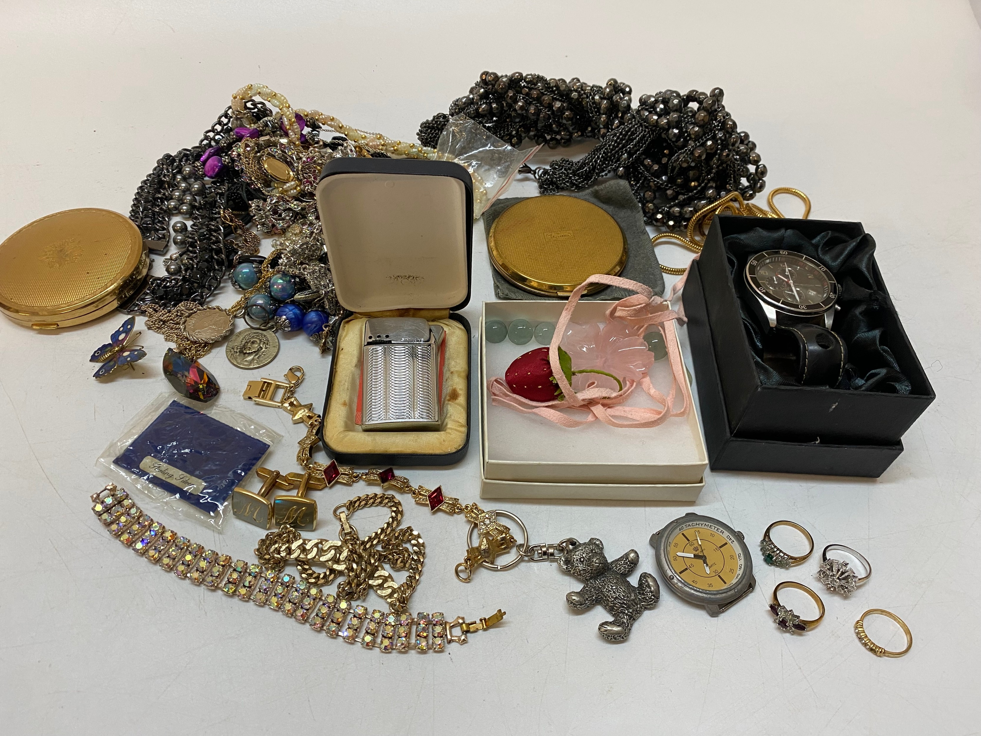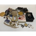 A selection of costume jewellery including a compact, necklaces, paste set bracelet, wristwatch etc..