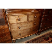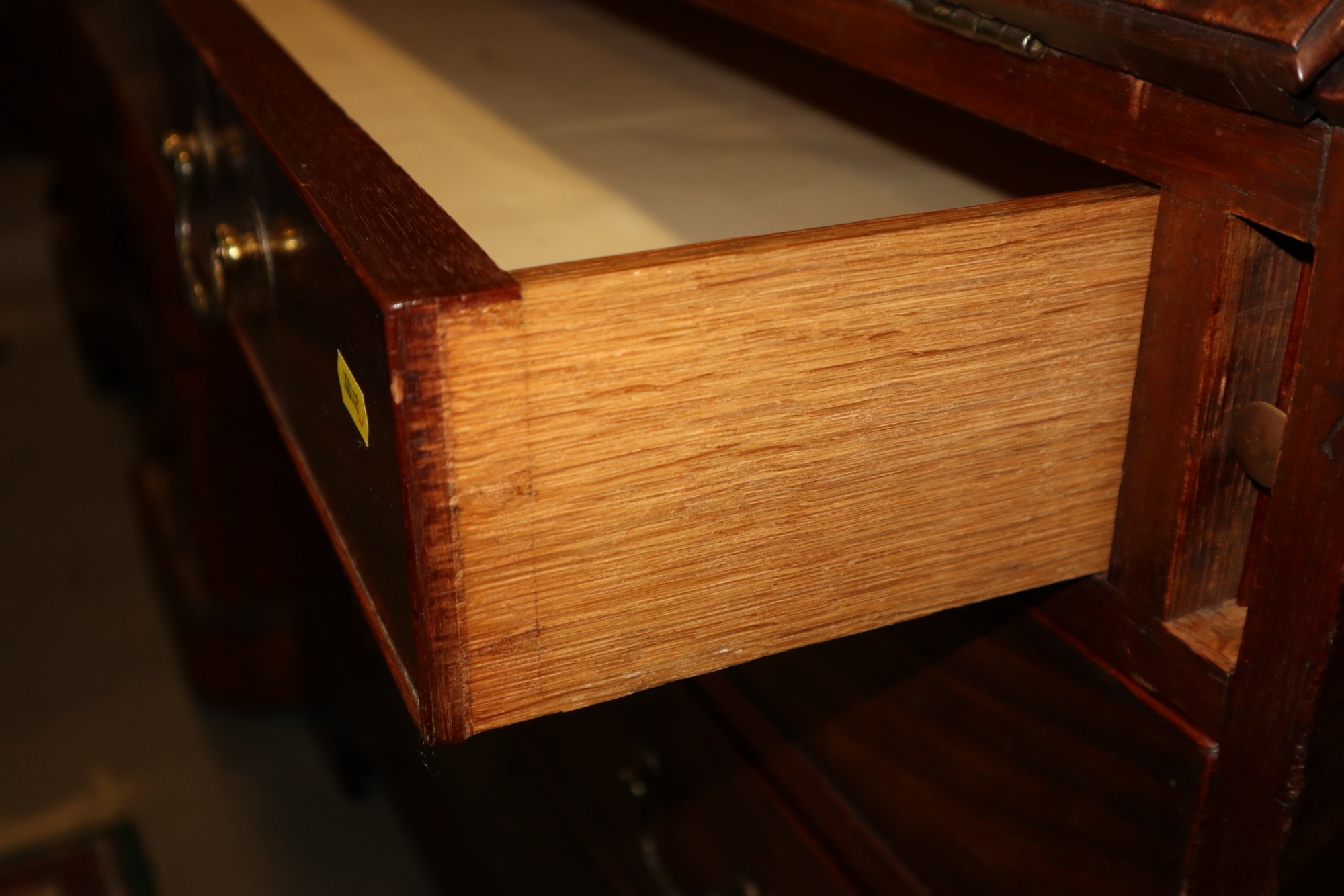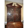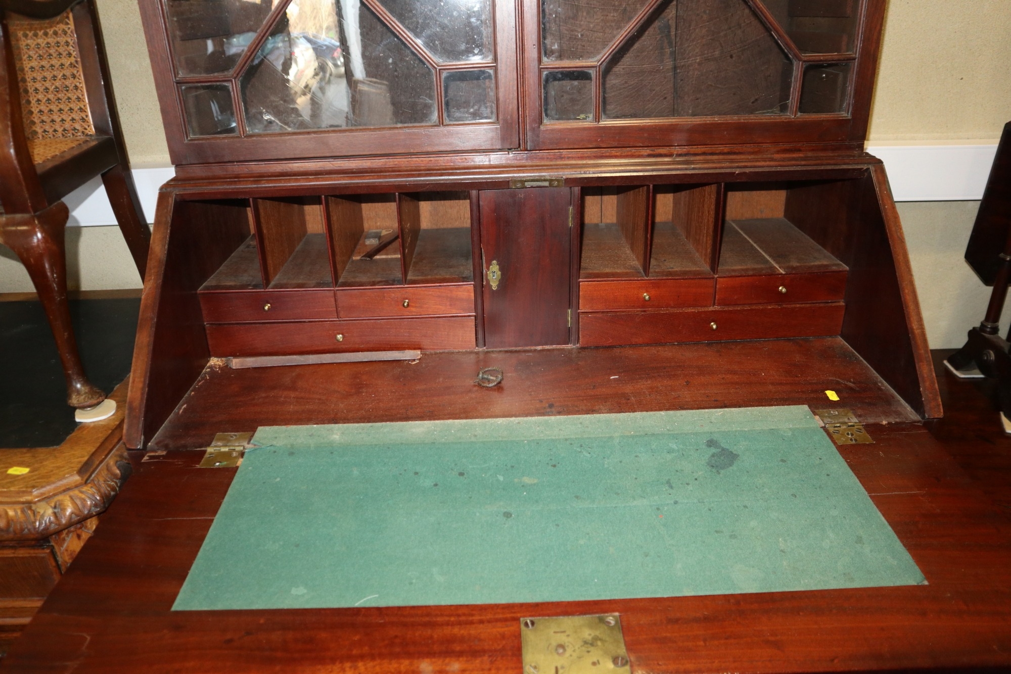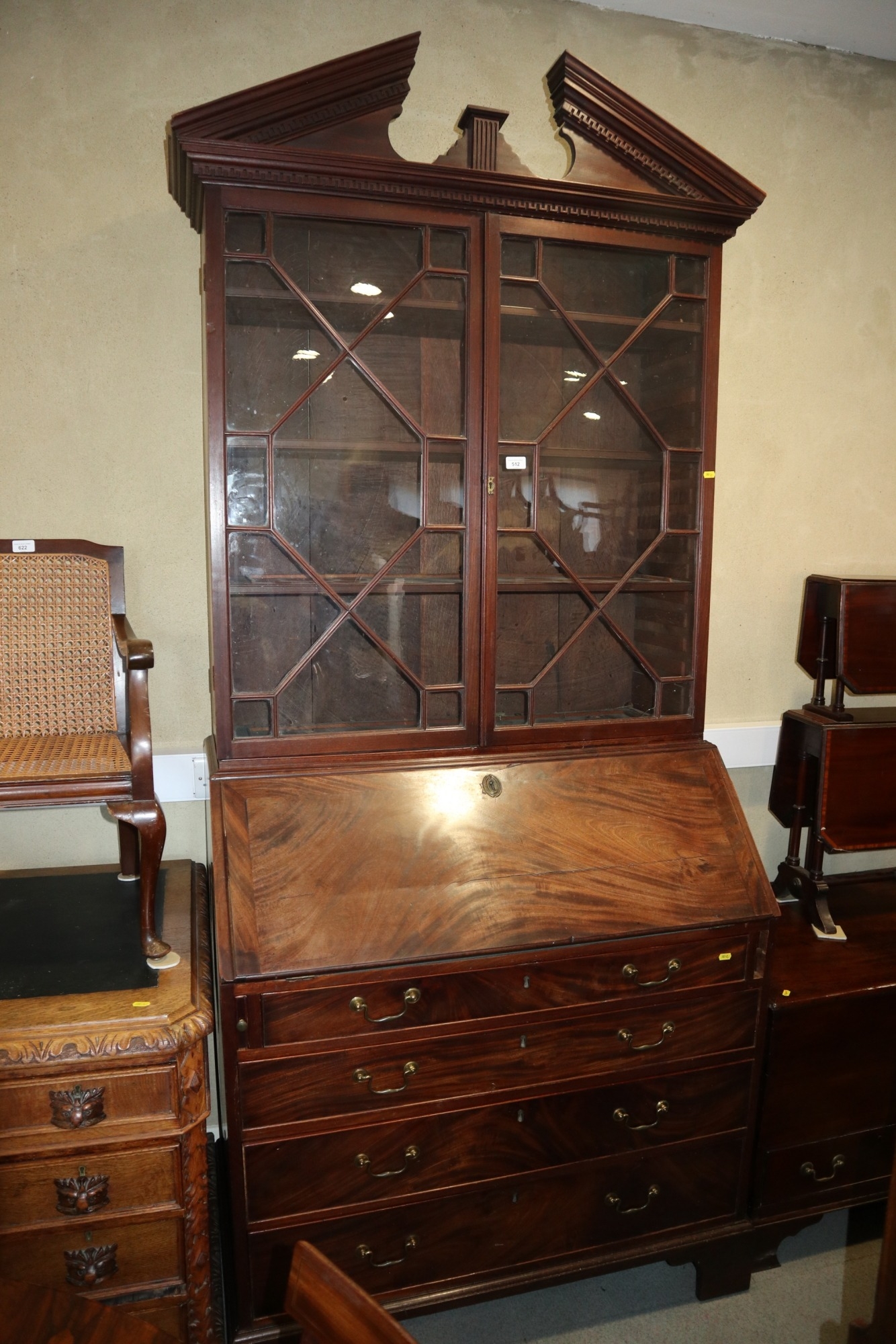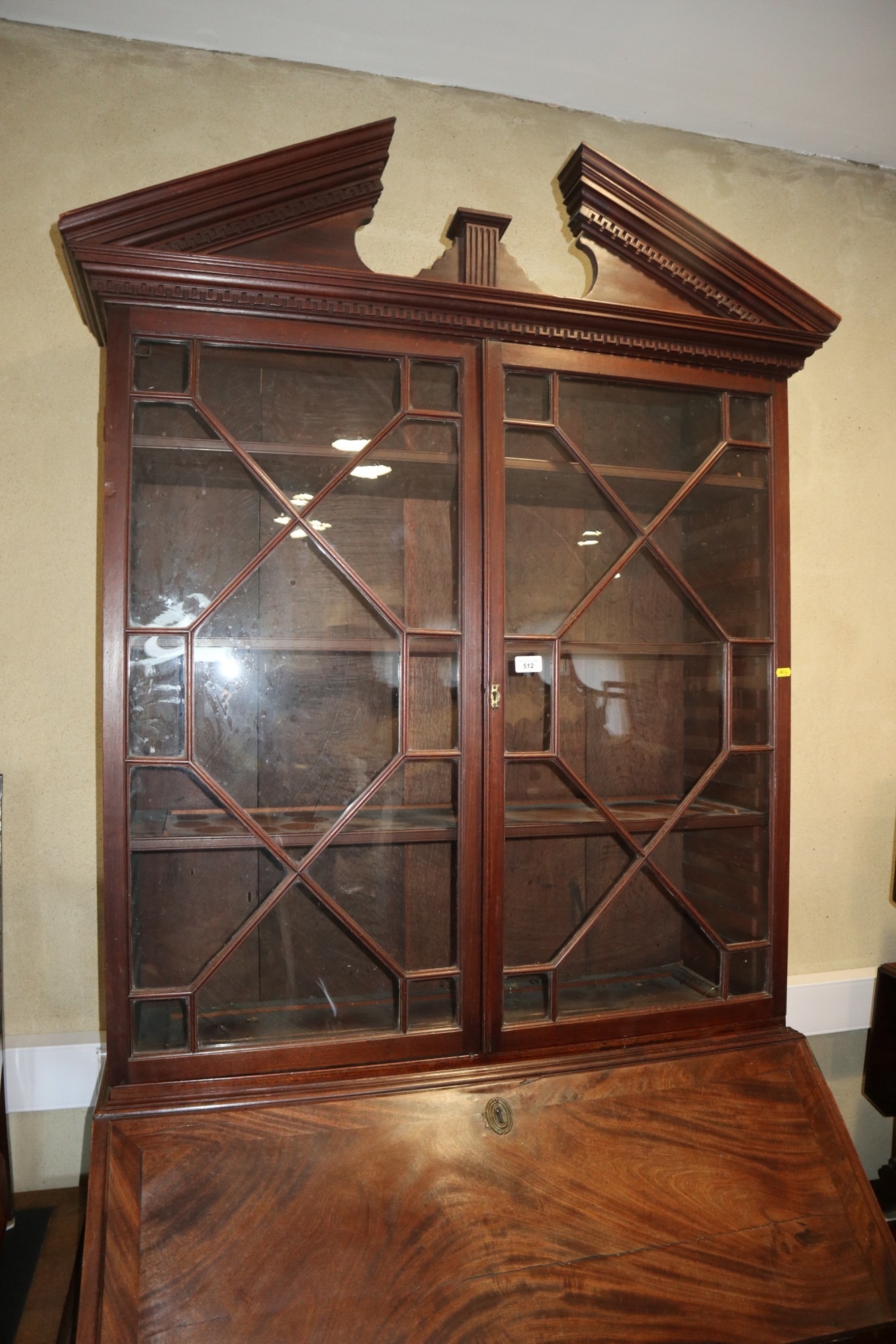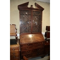 A George III mahogany bureau bookcase, the upper section with broken pediment, astral glazed doors over fitted interior, four long graduated drawers with bail handles, on bracket feet, 39" wide x 21" deep x 19" high