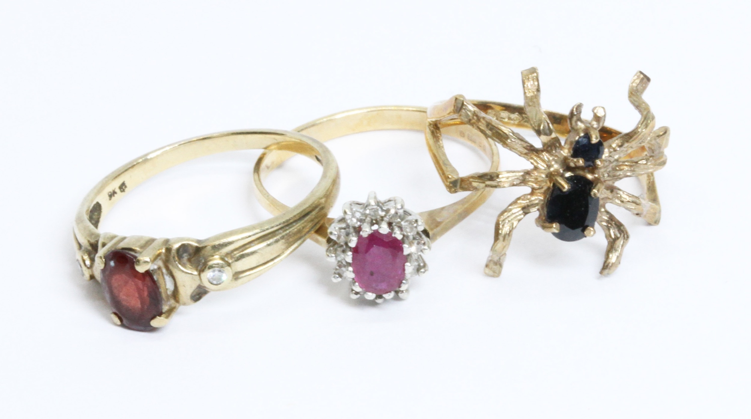 A group of three hallmarked 9ct gold rings, gross weight 6.2g, 10% buyer's premium (inclusive of VAT), normal online bidding fees apply.