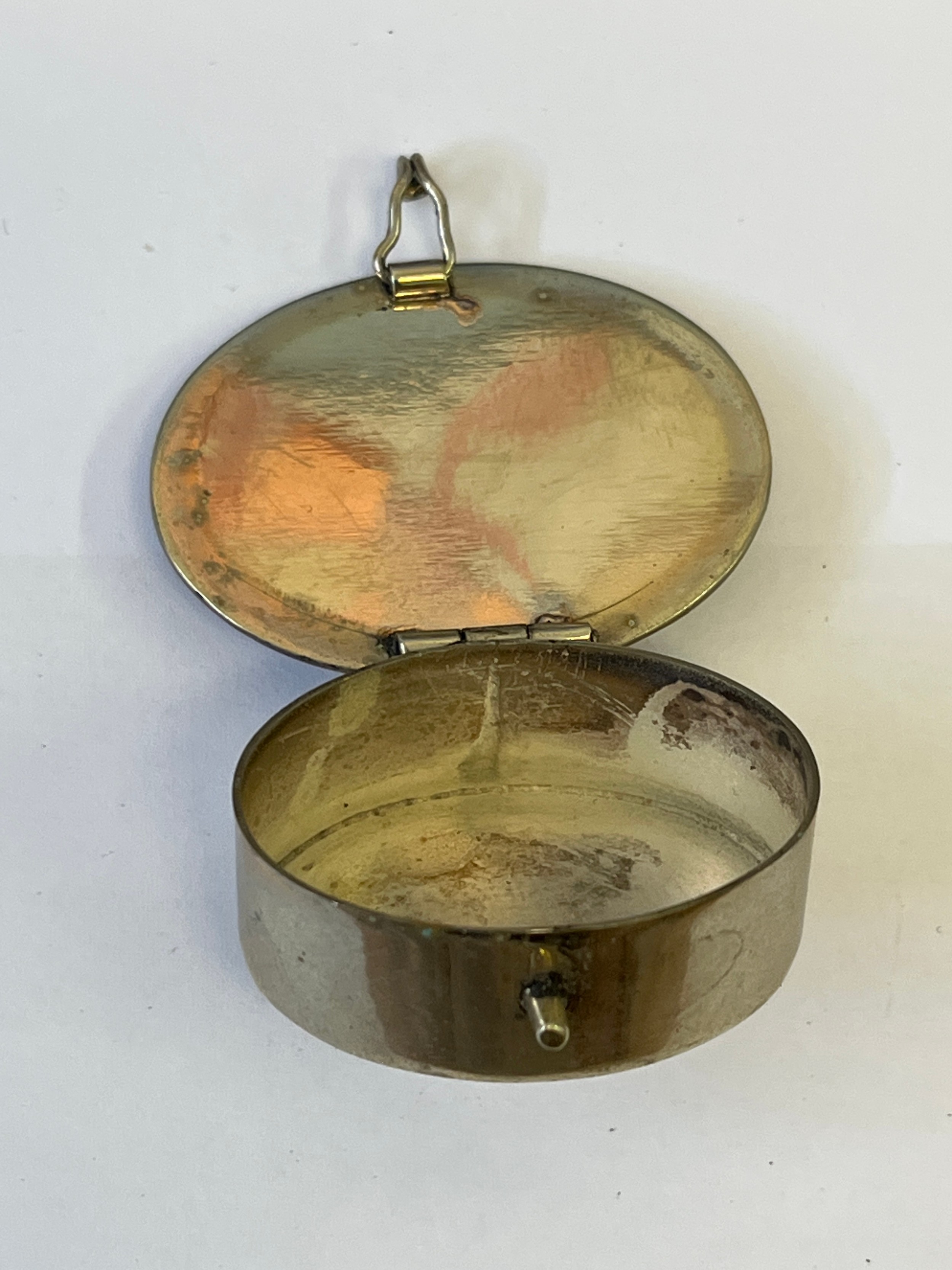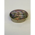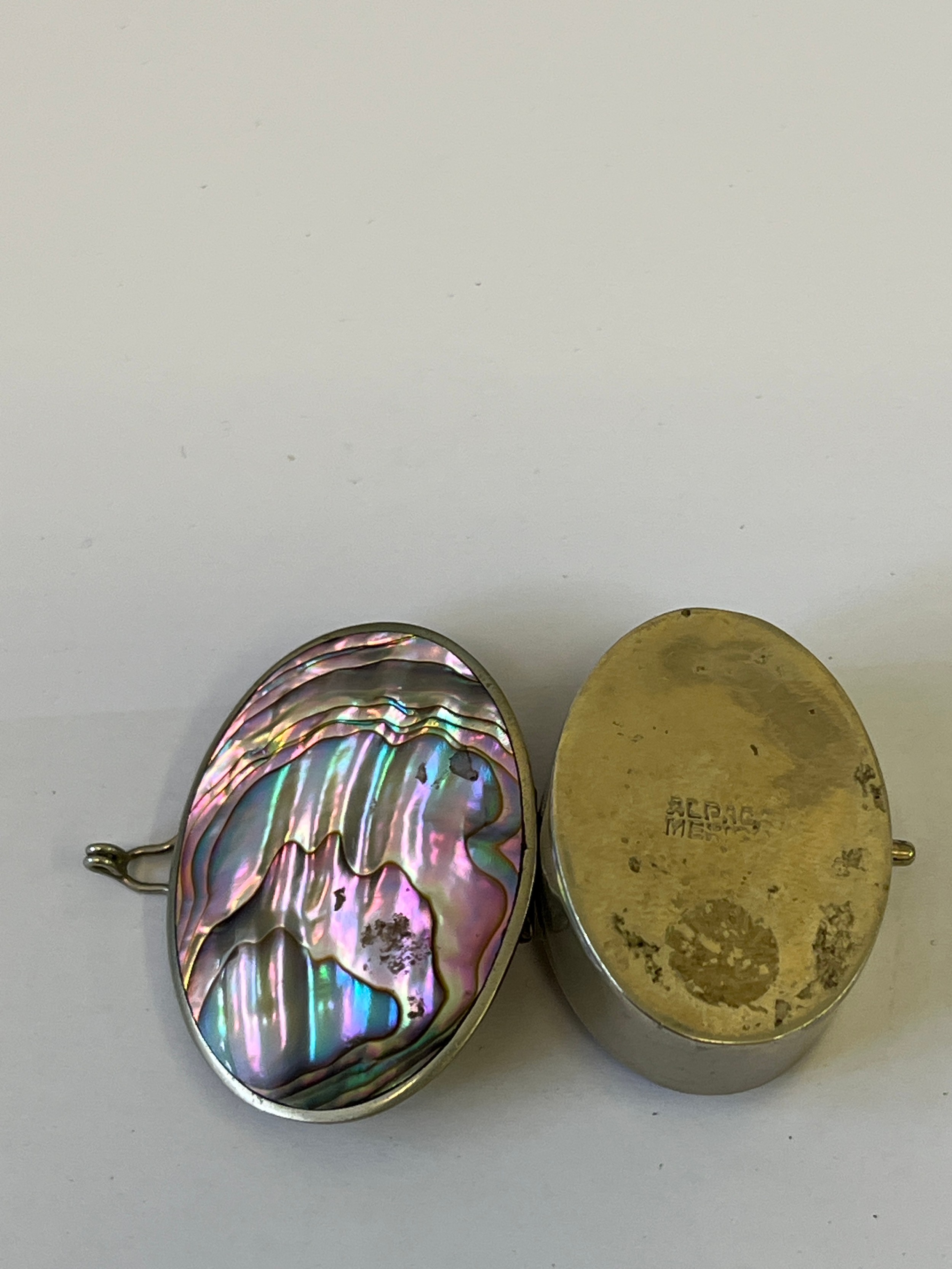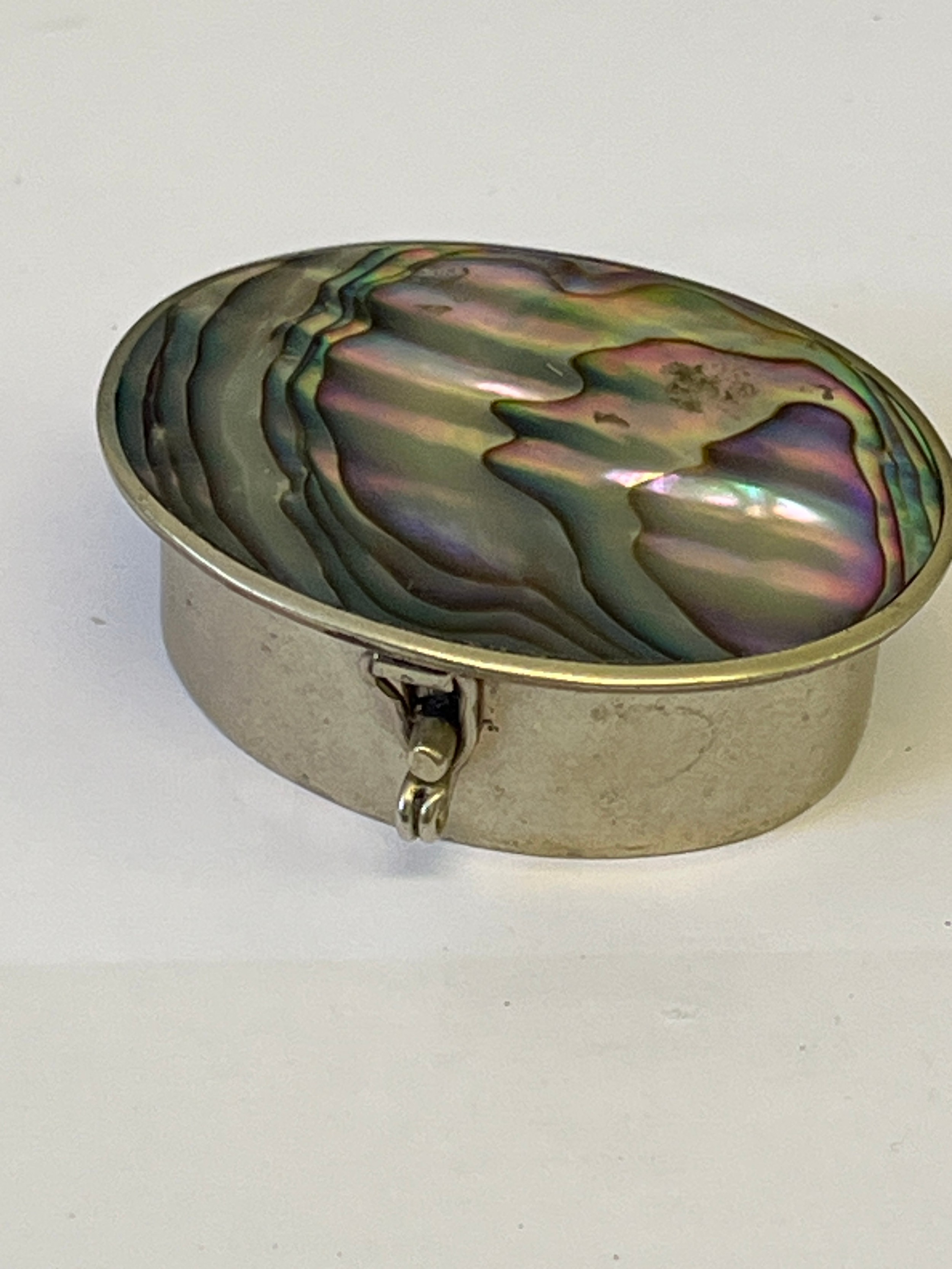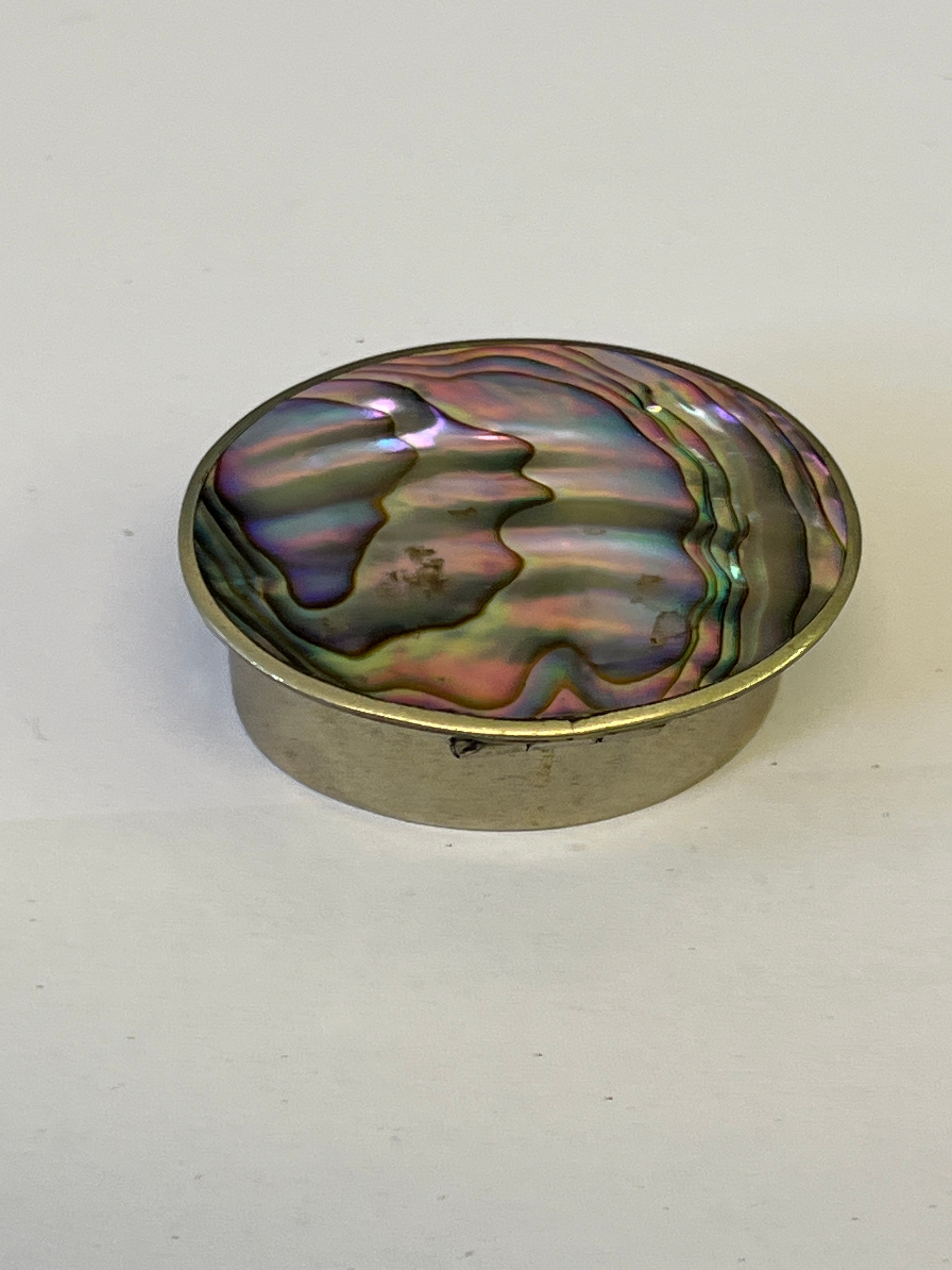 A SOLID SILVER PILL BOX WITH A LID OF MOTHER OF PEARL WEIGHT 12.92GR