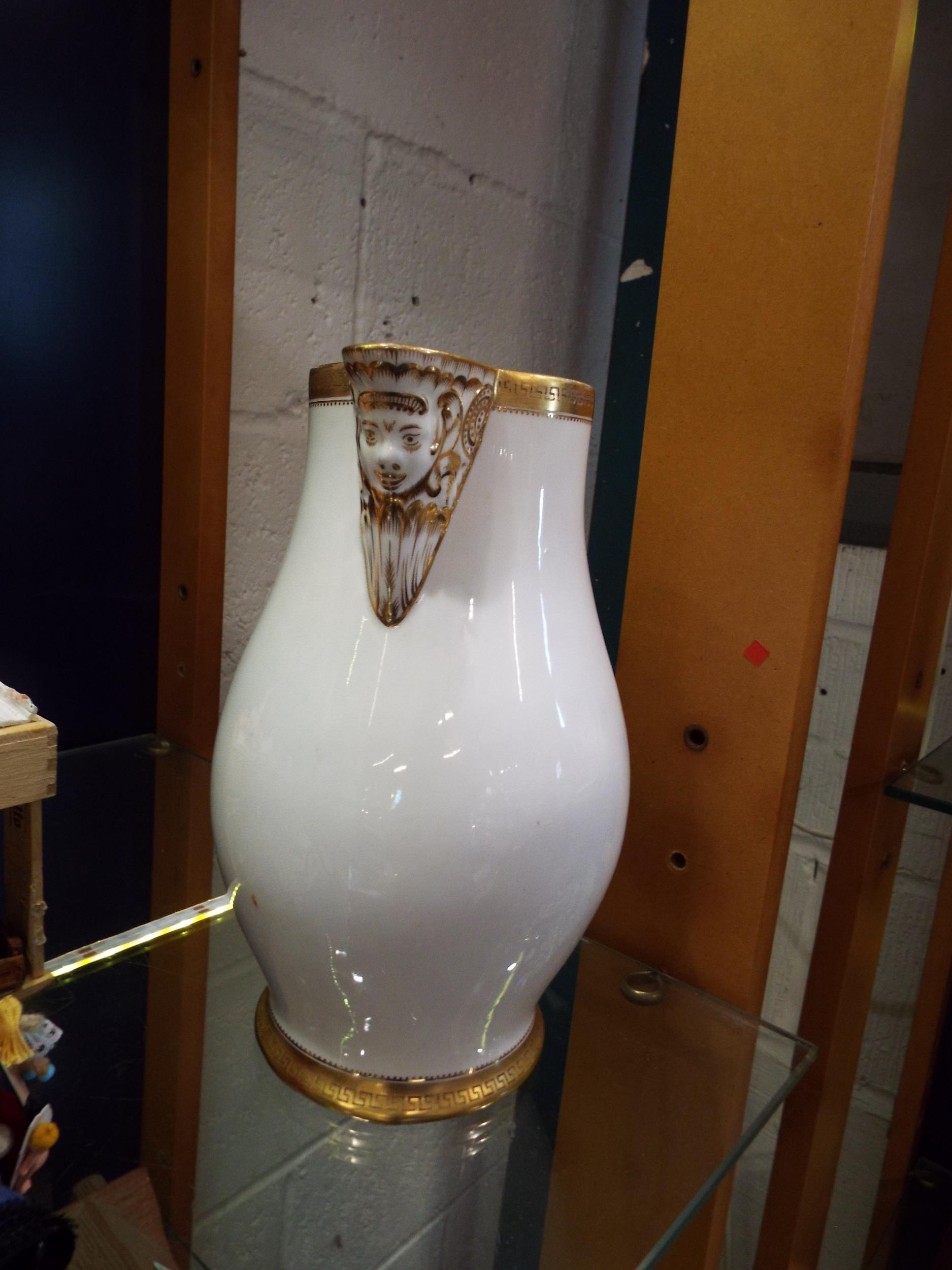 A hand-painted gilt and white water jug having face decoration to spout and handle